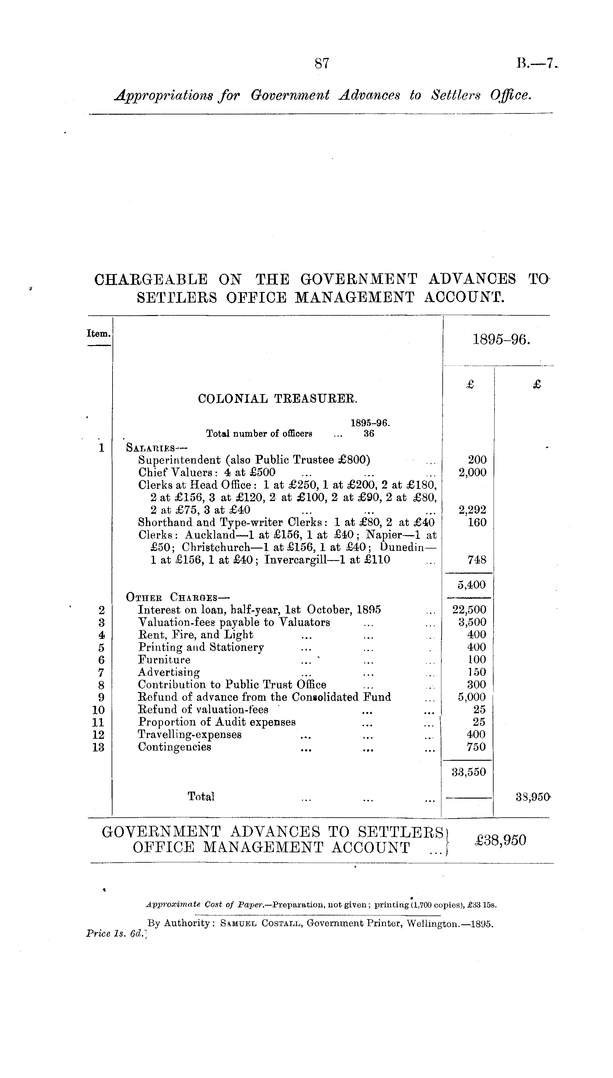 Item. 18' '5-96. COLONIAL TREASURER. 1895-96. Total number of officers ... 36 1 Salaries — Superintendent (also Public Trustee £800) Chief Valuers : 4 at £500 Clerks at Head Office : 1 at £250,1 at £200, 2 at £180, 2 at £156, 3 at £120, 2 at £100, 2 at £90, 2 at £80, 2 at £75, 3 at £40 Shorthand and Type-writer Clerks: 1 at £80, 2 at £40 Clerks : Auckland—1 at £156, 1 at £40 ; Napier —1 at £50; Christchurch—1 at £156, 1 at £40; Dunedin— 1 at £156, 1 at £40; Invercargill—1 at £110 200 2,000 2,292 160 748 Other Charges— Interest on loan, half-year, 1st October, 1895 Valuation-fees payable to Valuators Rent, Fire, and Light Printing and Stationery Furniture ..." Advertising Contribution to Public Trust Office Refund of advance from the Consolidated Fund Refund of valuation-fees Proportion of Audit expenses Travelling-expenses Contingencies 5,400 2 3 4 5 6 7 8 9 10 11 12 13 22,500 3,500 400 400 100 150 300 5,000 25 25 400 750 Total 33,550 33,950 GOVERNMENT ADVANCES TO SETTLERS) OFFICE MANAGEMENT ACCOUNT ...j £3, 1,950