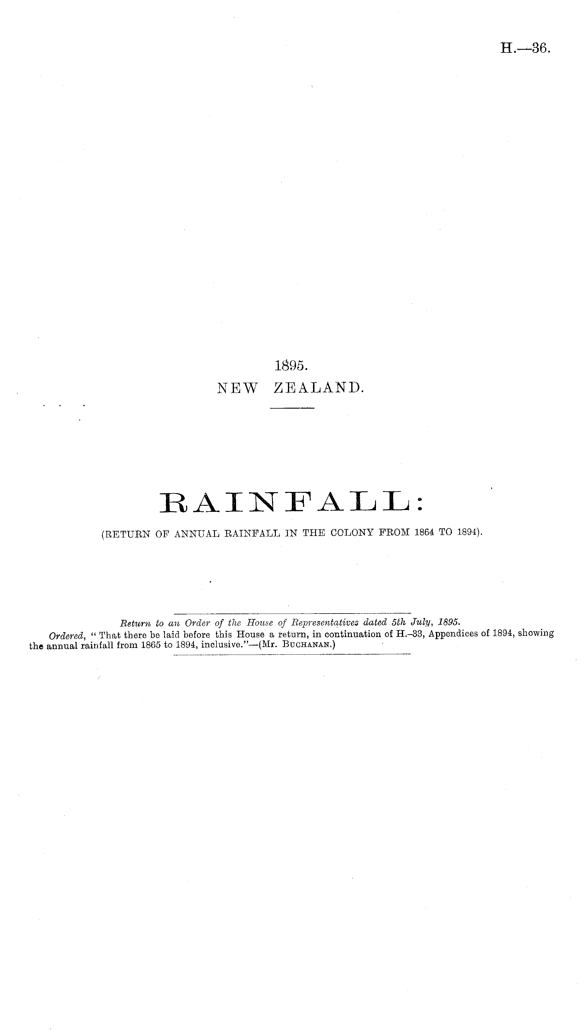 Return to an Order of the House of Representatives dated sth July, 1895. Ordered, " That there be laid before this House a return, in continuation of H.-33, Appendices of 1894, showing the annual rainfall from 1865 to 1894, inclusive."—(Mr. Buchanan.)