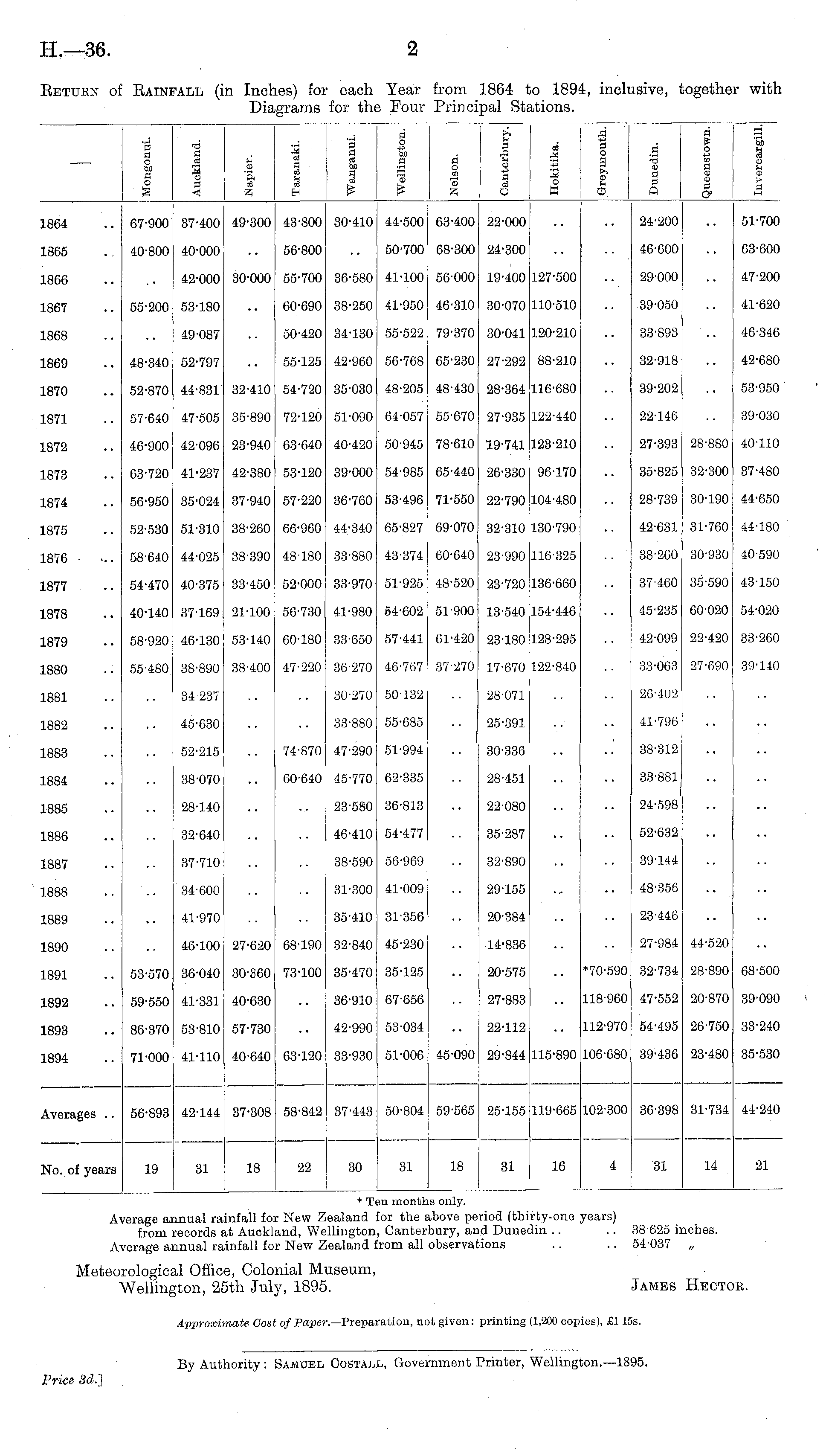 * Ten months only. Average annual rainfall for New Zealand for the above period (thirty-one years) from records at Auckland, Wellington, Canterbury, and Dunedin .. .. 38 625 inches. Average annual rainfall for New Zealand from all observations .. .. 54037 „ Meteorological Office, Colonial Museum, Wellington, 25th July, 1895. James Hector. Approximate Cost of Paper.— Preparation, not given: printing (1,200 copies), £115s.