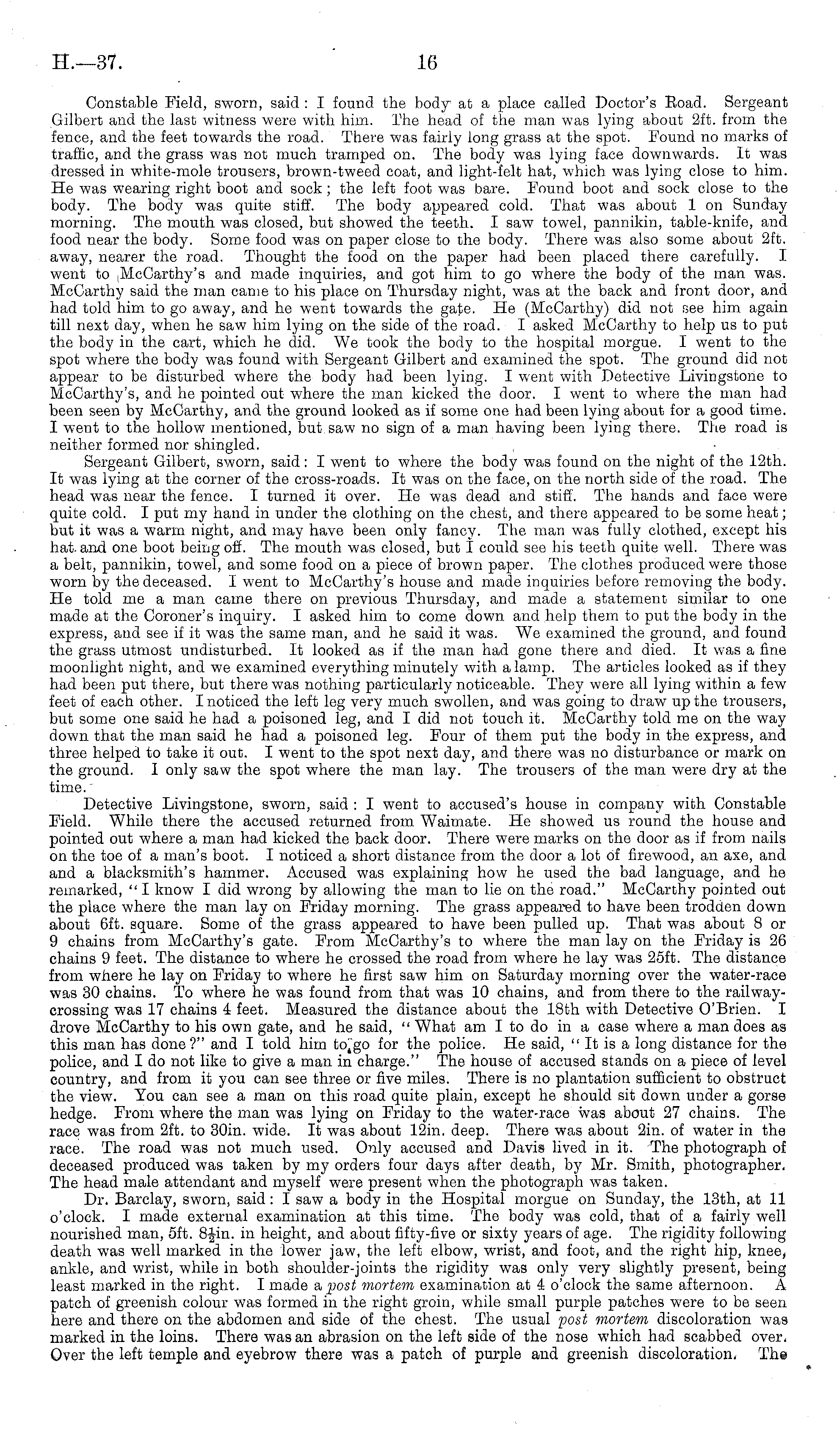 Constable Field, sworn, said : I found the body at a place called Doctor's Road. Sergeant Gilbert and the last witness were with him. The head of the man was lying about 2ft. from the fence, and the feet towards the road. There was fairly long grass at the spot. Found no marks of traffic, and the grass was not much tramped on. The body was lying face downwards. It was dressed in white-mole trousers, brown-tweed coat, and light-felt hat, which was lying close to him. He was wearing right boot and sock ; the left foot was bare. Found boot and sock close to the body. The body was quite stiff. The body appeared cold. That was about lon Sunday morning. The mouth was closed, but showed the teeth. I saw towel, pannikin, table-knife, and food near the body. Some food was on paper close to the body. There was also some about 2ft. away, nearer the road. Thought the food on the paper had been placed there carefully. I went to McCarthy's and made inquiries, and got him to go where the body of the man was. McCarthy said the man came to his place on Thursday night, was at the back and front door, and had told him to go away, and he went towards the gate. He (McCarthy) did not see him again till next day, when he saw him lying on the side of the road. I asked McCarthy to help us to put the body in the cart, which he did. We took the body to the hospital morgue. I went to the spot where the body was found with Sergeant Gilbert and examined the spot. The ground did not appear to be disturbed where the body had been lying. I went with Detective Livingstone to McCa.rthy's, and he pointed out wdiere the man kicked, the door. I went to where the man had been seen by McCarthy, and the ground looked as if some one had been lying about for a good time. I went to the hollow mentioned, but saw no sign of a man having been lying there. The road is neither formed nor shingled. Sergeant Gilbert, sworn, said: I went to where the body was found on the night of the 12th. It was lying at the corner of the cross-roads. It was on the face, on the north side of the road. The head was near the fence. I turned it over. He was dead and stiff. The hands and face were quite cold. I put my hand in under the clothing on the chest, and there appeared to be some heat; but it was a warm night, and may have been only fancy. The man was fully clothed, except his hat. and one boot being off. The mouth was closed, but I could see his teeth quite well. There was a belt, pannikin, towel, and some food on a piece of brown paper. The clothes produced were those worn by the deceased. I went to McCarthy's house and made inquiries before removing the body. He told me a man came there on previous Thursday, and made a statement similar to one made at the Coroner's inquiry. I asked him to come down and help them to put the body in the express, and see if it was the same man, and he said it was. We examined the ground, and found the grass utmost undisturbed. It looked as if the man had gone there and died. It was a fine moonlight night, and we examined everything minutely with a lamp. The articles looked as if they had been put there, but there was nothing particularly noticeable. They were all lying within a few feet of each other. I noticed the left leg very much swollen, and was going to draw up the trousers, but some one said he had a poisoned leg, and I did not touch it. McCarthy told me on the way down that the man said he had a poisoned leg. Four of them put the body in the express, and three helped to take it out. I went to the spot next day, and there was no disturbance or mark on the ground. I only saw the spot where the man lay. The trousers of the man were dry at the time." Detective Livingstone, sworn, said : I went to accused's house in company with Constable Field. While there the accused returned from Waimate. He showed us round the house and pointed out where a man had kicked the back door. There were marks on the door as if from nails on the toe of a man's boot. I noticed a short distance from the door a lot of firewood, an axe, and and a blacksmith's hammer. Accused was explaining how he used the bad language, and he remarked, " I know I did wrong by allowing the man to lie on the road." McCarthy pointed out the place where the man lay on Friday morning. The grass appeared to have been trodden down about 6ft. square. Some of the grass appeared to have been pulled up. That wa,s about Bor 9 chains from McCarthy's gate. From McCarthy's to where the man lay on the Friday is 26 chains 9 feet. The distance to where he crossed the road from where he lay was 25ft. The distance from where he lay on Friday to where he first saw him on Saturday morning over the water-race was 30 chains. To where he was found from that was 10 chains, and from there to the railwaycrossing was 17 chains 4 feet. Measured the distance about the 18th with Detective O'Brien. I drove McCarthy to his own gate, and he said, " What am I to do in a case where a man does as this man has done?" and I told him to.go for the police. He said, "Itis a long distance for the police, and Ido not like to give a man in charge." The house of accused stands on a piece of level country, and from it you can see three or five miles. There is no plantation sufficient to obstruct the view. You can see a man on this road quite plain, except he should sit down under a gorse hedge. From where the man was lying on Friday to the water-race was about 27 chains. The race was from 2ft. to 30in. wide. It was about 12in. deep. There was about 2in. of water in the race. The road was not much used. Only accused and Davis lived in it. The photograph of deceased produced was taken by my orders four days after death, by Mr. Smith, photographer, The head male attendant and myself were present when the photograph was taken. Dr. Barclay, sworn, said: I saw a body in the Hospital morgue on Sunday, the 13th, at 11 o'clock. I made external examination at this time. The body was cold, that of a fairly well 