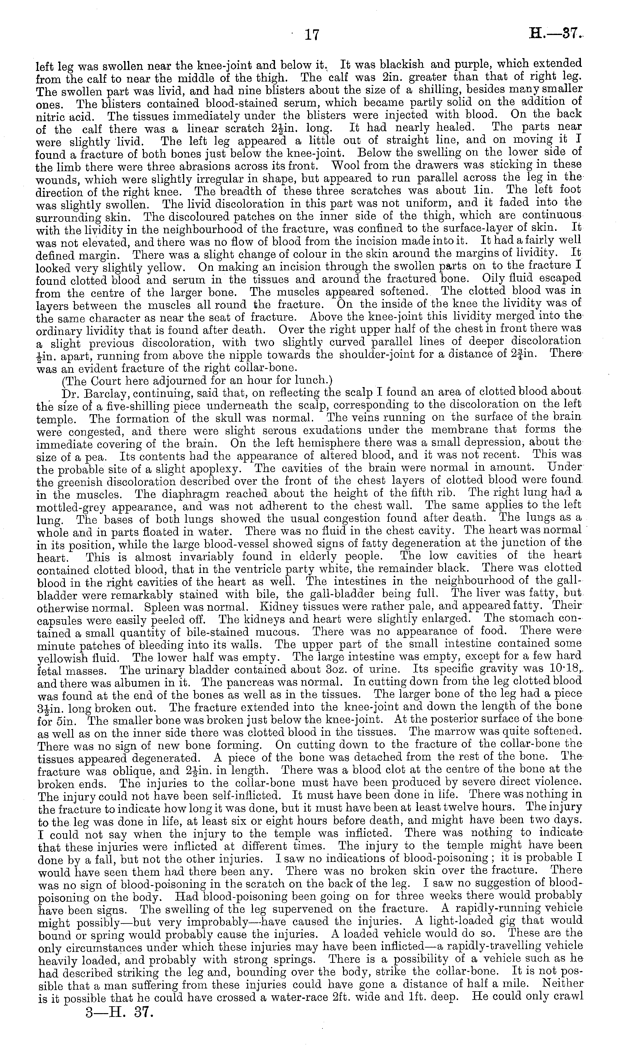 left leg was swollen near the knee-joint and below it. It was blackish and purple, which extended from the calf to near the middle of the thigh. The calf was 2in. greater than that of right leg. The swollen part was livid, and had nine blisters about the size of a shilling, besides many smaller ones. The blisters contained blood-stained serum, which became partly solid on the addition of nitric acid. The tissues immediately under the blisters were injected with blood. On the back of the calf there was a linear scratch 2|in. long. It had nearly healed. The parts near were slightly livid. The left leg appeared a little out of straight line, and on moving it I found a fracture of both bones just below the knee-joint. Below the swelling on the lower side of the limb there were three abrasions across its front. Wool from the drawers was sticking these wounds, which were slightly irregular in shape, but appeared to run parallel across the leg in the direction of the right knee. The breadth of these three scratches was about lin. The left foot was slightly swollen. The livid discoloration in this part was not uniform, and it faded into the surrounding skin. The discoloured patches on the inner side of the thigh, which are continuous with the lividity in the neighbourhood of the fracture, was confined to the surface-layer of skin. It was not elevated, and there was no flow of blood from the incision made into it. It had a fairly well defined margin. There was a slight change of colour in the skin around the margins of lividity. It looked very slightly yellow. On making an incision through the swollen parts on to the fracture I found clotted blood and serum in the tissues and around the fractured bone. Oily fluid escaped from the centre of the larger bone. The muscles appeared softened. The clotted blood was in layers between the muscles all round the fracture. On the inside of the knee the lividity was of the same character as near the seat of fracture. Above the knee-joint this lividity merged into the ordinary lividity that is found after death. Over the right upper half of the chest in front there was a slight previous discoloration, with two slightly curved parallel lines of deeper discoloration fin. apart, running from above the nipple towards the shoulder-joint for a distance of 2fin. There was an evident fracture of the right collar-bone. (The Court here adjourned for an hour for lunch.) Dr. Barclay, continuing, said that, on reflecting the scalp I found an area of clotted blood about the size of a five-shilling piece underneath the scalp, corresponding to the discoloration on the left temple. The formation of the skull was normal. The veins running on the surface of the brain were congested, and there were slight serous exudations under the membrane that forms the immediate covering of the brain. On the left hemisphere there was a small depression, about the size of a pea. Its contents had the appearance of altered blood, and it was not recent. This was the probable site of a slight apoplexy. The cavities of the brain were normal in amount. Under the greenish discoloration described over the front of the chest layers of clotted blood were found in the muscles. The diaphragm reached about the height of the fifth rib. The right lung had a mottled-grey appearance, and was not adherent to the chest wall. The same applies to the left lung. The bases of both lungs showed the usual congestion found after death. The lungs as a whole and in parts floated in water. There was no fluid in the chest cavity. The heart was normal in its position, while the large blood-vessel showed signs of fatty degeneration at the junction of the heart. This is almost invariably found in elderly people. The low cavities of the heart contained clotted blood, that in the ventricle party white, the remainder black. There was clotted blood in the right cavities of the heart as well. The intestines in the neighbourhood of the gallbladder were remarkably stained with bile, the gall-bladder being full. The liver was fatty, but otherwise normal. Spleen was normal. Kidney tissues were rather pale, and appeared fatty. Their capsules were easily peeled off. The kidneys and heart were slightly enlarged. The stomach contained a small quantity of bile-stained mucous. There was no appearance of food. There were minute patches of bleeding into its walls. The upper part of the small intestine contained some yellowish fluid. The lower half was empty. The large intestine was empty, except for a few hard fetal masses. The urinary bladder contained about 3oz. of urine. Its specific gravity was 10-18,. and there was albumen in it. The pancreas was normal. In cutting down from the leg clotted blood was found at the end of the bones as well as in the tissues. The larger bone of the leg had a piece 3iin. long broken out. The fracture extended into the knee-joint and down the length of the bone for sin. The smaller bone was broken just below the knee-joint. At the posterior surface of the bone as well as on the inner side there was clotted blood in the tissues. The marrow was quite softened. There was no sign of new bone forming. On cutting down to the fracture of the collar-bone the tissues appeared degenerated. A piece of the bone was detached from the rest of the bone. The fracture was oblique, and 2Jin. in length. There was a blood clot at the centre of the bone at the broken ends. The injuries to the collar-bone must have been produced by severe direct violence. The injury could not have been self-inflicted. It must have been done in life. There was nothing in the fracture to indicate how long it was done, but it must have been at least twelve hours. The injury to the leg was done in life, at least six or eight hours before death, and might have been two days. I could not say when the injury to the temple was inflicted. There was nothing to indicate that these injuries were inflicted at different times. The injury to the temple might hav