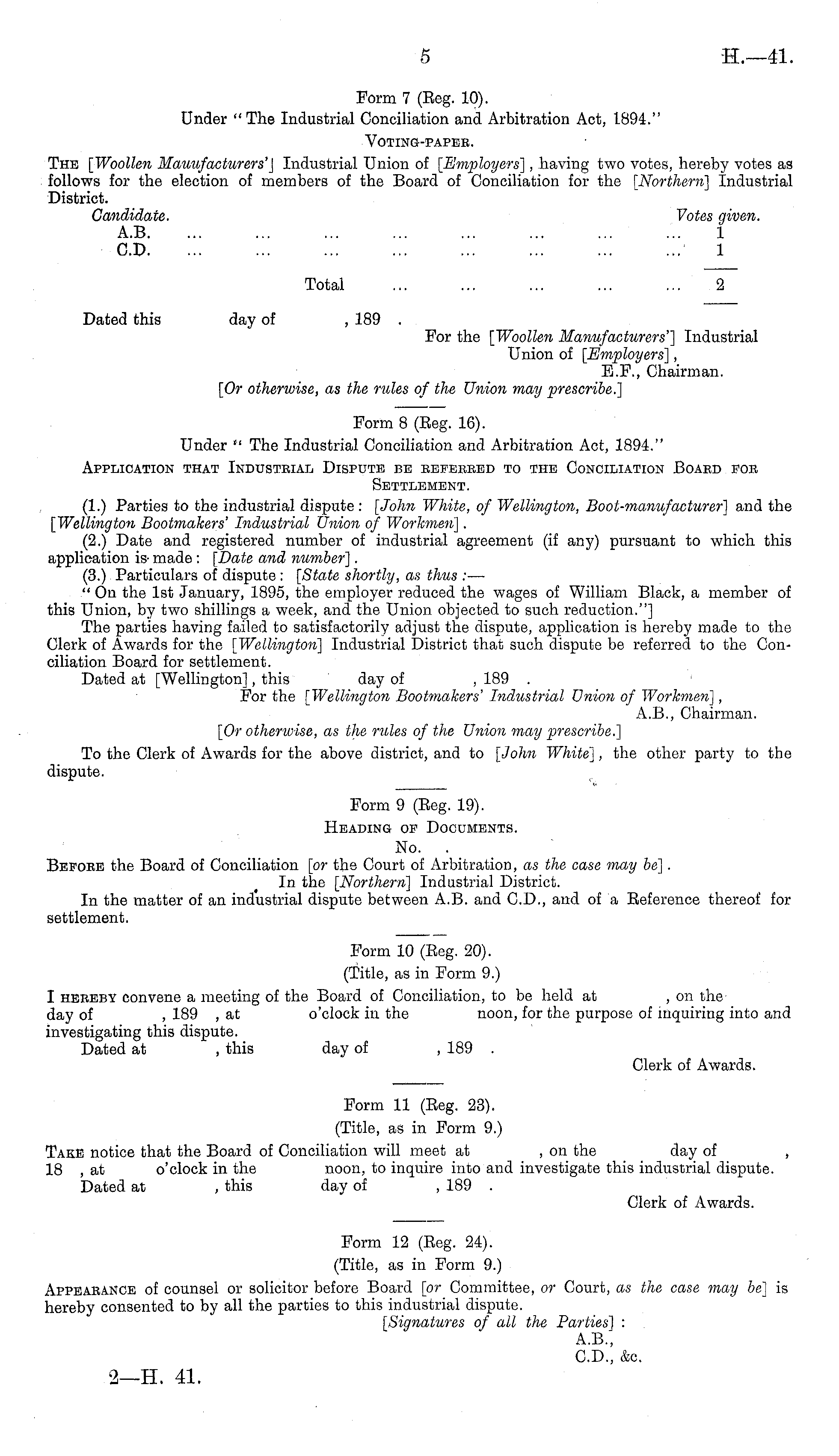 Form 7 (Beg. 10). Under "The Industrial Conciliation and Arbitration Act, 1894." Voting-papee. The [Woollen Manufacturers'] Industrial Union of [Employers], having two votes, hereby votes as follows for the election of members of the Board of Conciliation for the [Northern] Industrial District. Candidate. Votes given. A.B 1 CD • 1 Total ... ... ... ... ... 2 Dated this day of , 189 . For the [Woollen Manufacturers'] Industrial Union of [Employers], E.F., Chairman. [Or otherwise, as the rules of the Union may prescribe?]