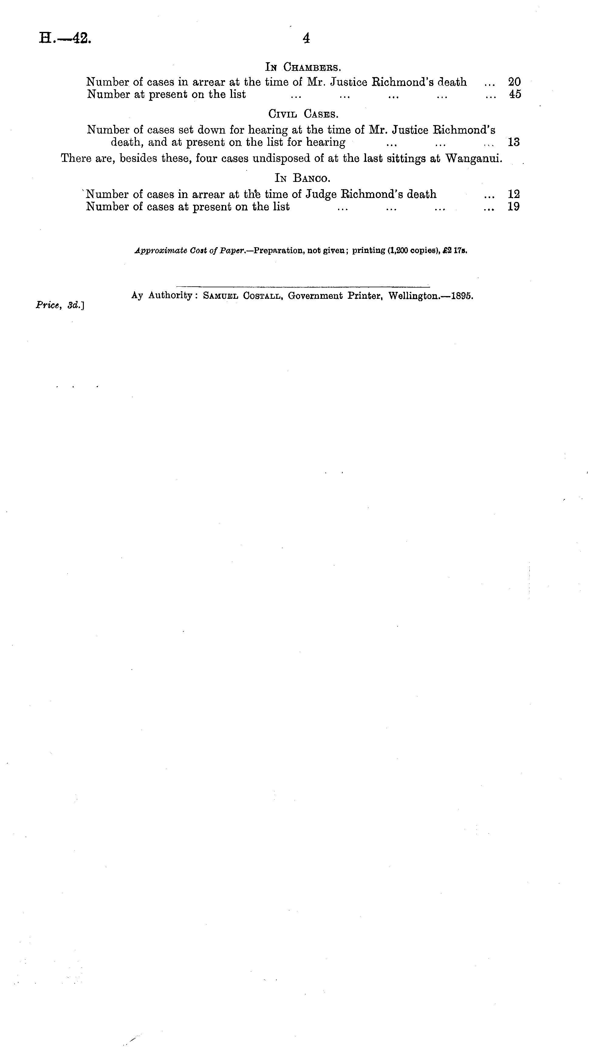 In Chambers. Number of cases in arrear at the time of Mr. Justice Richmond's death ... 20 Number at present on the list ... ... ... ... ... 45 Civil Cases. Number of cases set down for hearing at the time of Mr. Justice Richmond's death, and at present on the list for hearing ... ... ~. 13 There are, besides these, four cases undisposed of at the last sittings at Wanganui. In Banco. Number of cases in arrear at the time of Judge Richmond's death ... 12 Number of cases at present on the list ... ... ... ... 19 Approximate Colt of Paper.— Preparation, not given; printing (1,200 copies), £2175.