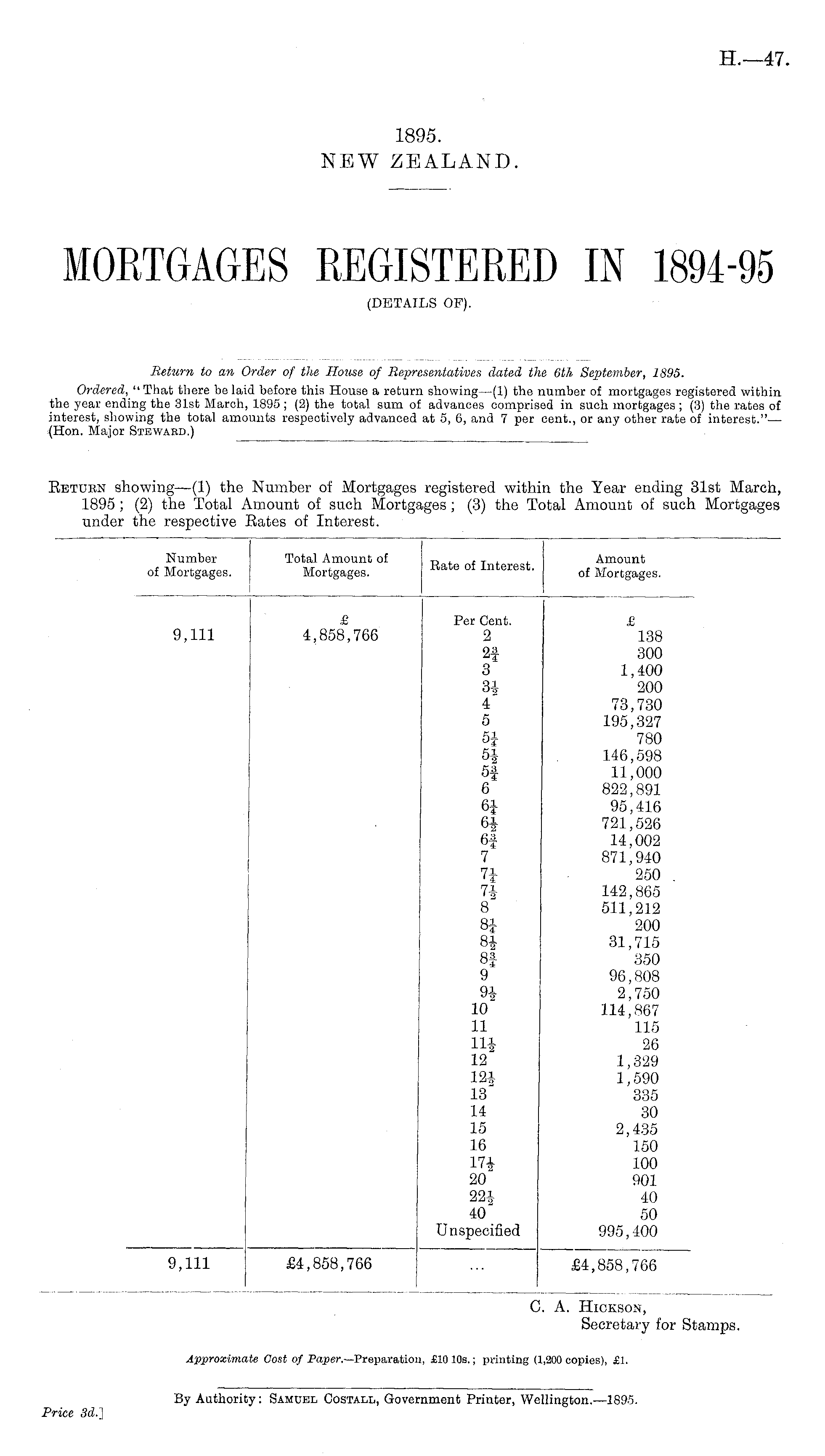 Return to an Order of the House of Representatives dated the 6th September, 1895. Ordered, " That there be laid before this House a return showing—(l) the number of mortgages registered within the year ending the 31st March, 1895; (2) the total sum of advances comprised in such mortgages ; (3) the rates of interest, showing the total amounts respectively advanced at 5, 6, and 7 per cent., or any other rate of interest."— (Hon. Major Stewabd.)