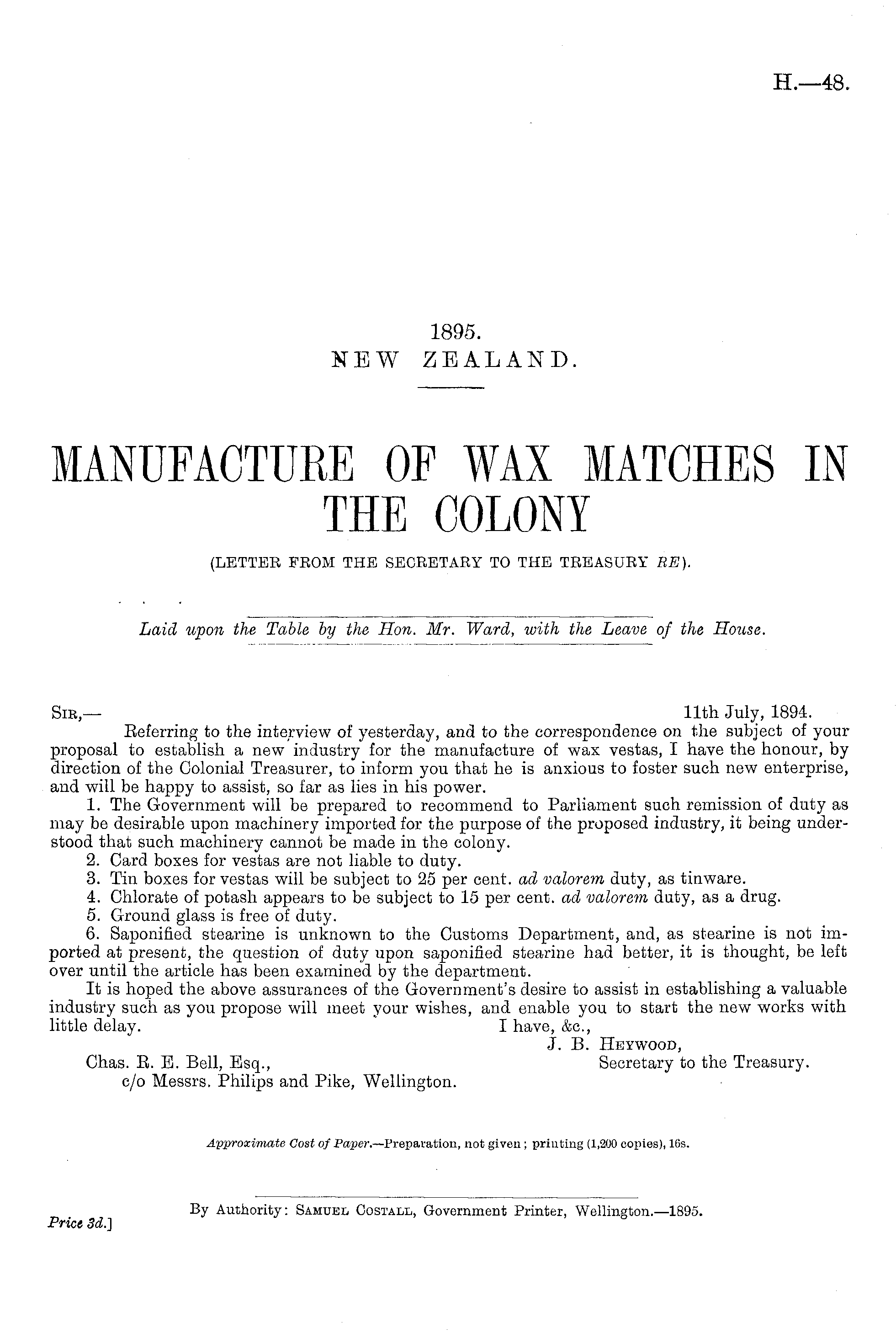 Sir— 11th July, 1894. Eeferring to the interview of yesterday, and to the correspondence on the subject of your proposal to establish a new industry for the manufacture of wax vestas, I have the honour, by direction of the Colonial Treasurer, to inform you that he is anxious to foster such new enterprise, and will be happy to assist, so far as lies in his power. 1. The Government will be prepared to recommend to Parliament such remission of duty as may be desirable upon machinery imported for the purpose of the proposed industry, it being understood that such machinery cannot be made in the colony. 2. Card boxes for vestas are not liable to duty. 3. Tin boxes for vestas will be subject to 25 per cent, ad valorem duty, as tinware. 4. Chlorate of potash appears to be subject to 15 per cent, ad valorem duty, as a drug. 5. Ground glass is free of duty. 6. Saponified stearine is unknown to the Customs Department, and, as stearine is not imported at present, the question of duty upon saponified stearine had better, it is thought, be left over until the article has been examined by the department. It is hoped the above assurances of the Government's desire to assist in establishing a valuable industry such as you propose will meet your wishes, and enable you to start the new works with little delay. I have, &c, J. B. Heywood, Chas. E. E. Bell, Esq., Secretary to the Treasury, c/o Messrs. Philips and Pike, Wellington.
