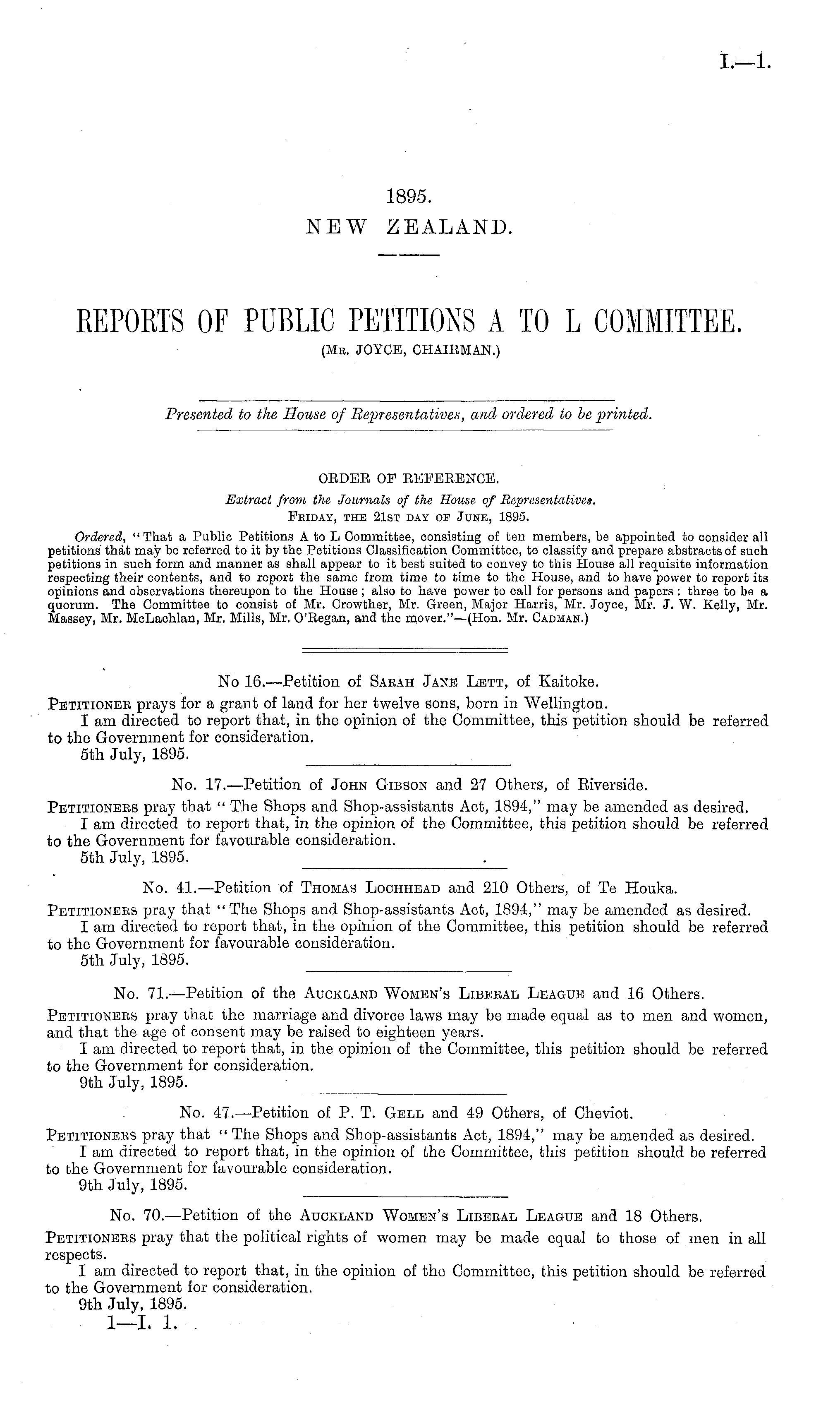 ORDER OP REFERENCE. Extract from the Journals of the House of Representatives. Friday, the 21st day of Juhe, 1895. Ordered, " That a Public Petitions A to L Committee, consisting of ten members, be appointed to consider all petitions that may be referred to it by tho Petitions Classification Committee, to classify and prepare abstracts of such petitions in such form and manner as shall appear to it best suited to convey to this House all requisite information respecting their contents, and to report the same from time to time to the House, and to have power to report its opinions and observations thereupon to the House; also to have power to call for persons and papers : three to be a quorum. The Committee to consist of Mr. Crowther, Mr. Green, Major Harris, Mr. Joyce, Mr. J. W. Kelly, Mr. Massey, Mr. McLachlan, Mr. Mills, Mr. O'Regan, and the mover."—(Hon. Mr. Cadman.)