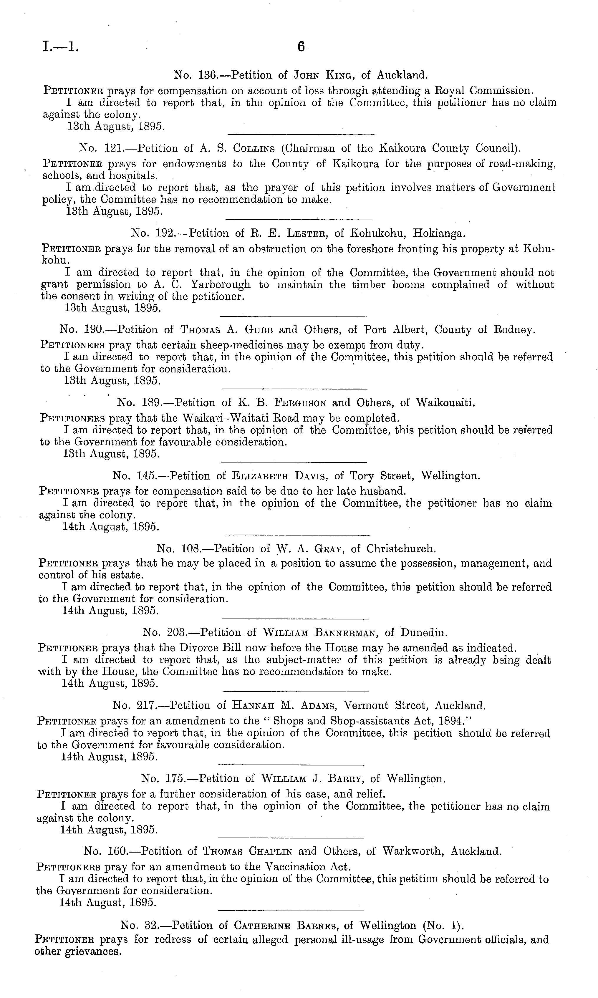 No. 136.—Petition of John King, of Auckland. Petitioner prays for compensation on account of loss through attending a Royal Commission. I am directed to report that, in the opinion of the Committee, this petitioner has no claim against the colony. 13th August, 1895.