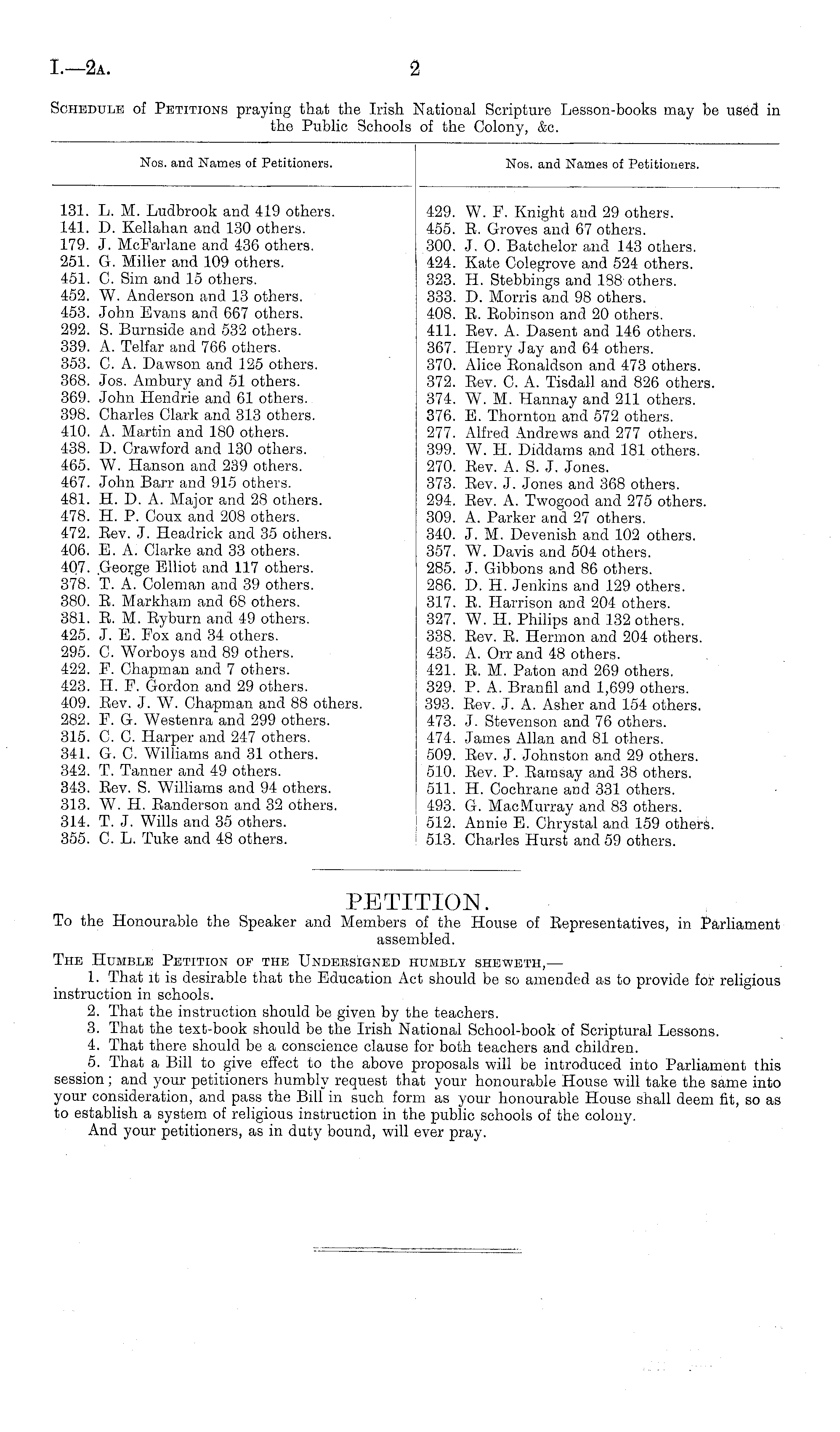 PETITION. To the Honourable the Speaker and Members of the House of Eepresentatives, in Parliament assembled. The Humble Petition of the Undersigned humbly sheweth, — 1. That it is desirable that the Education Act should be so amended as to provide for religious instruction in schools. 2. That the instruction should be given by the teachers. 3. That the text-book should be the Irish National School-book of Scriptural Lessons. 4. That there should be a conscience clause for both teachers and children. 5. That a Bill to give effect to the above proposals will be introduced into Parliament this session; and your petitioners humbly request that your honourable House will take the same into your consideration, and pass the Bill in such form as your honourable House shall deem fit, so as to establish a system of religious instruction in the public schools of the colony. And your petitioners, as in duty bound, will ever pray.