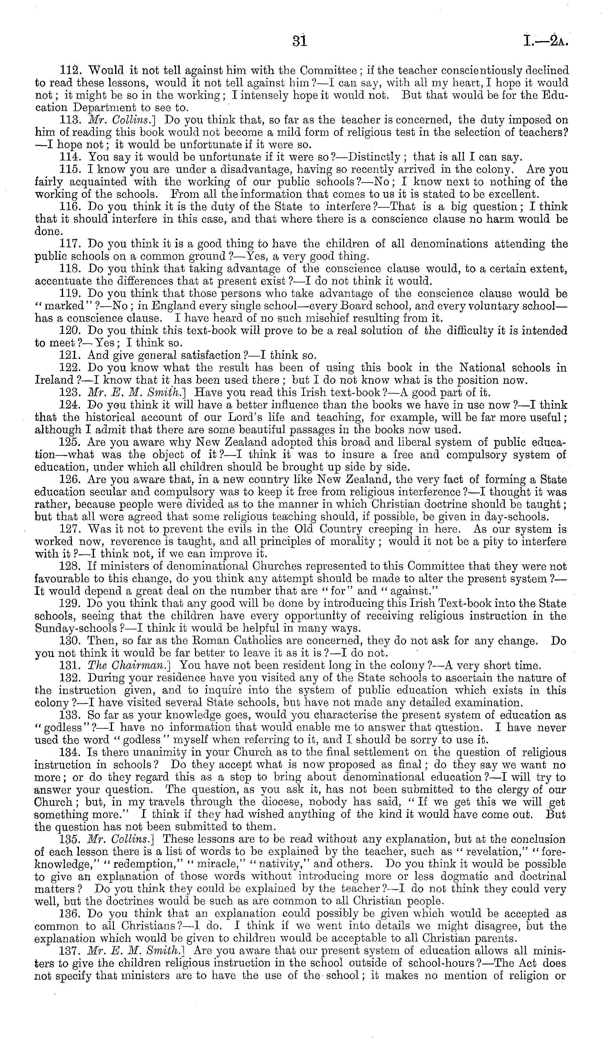 112. Would it not tell against him with the Committee; if the teacher conscientiously declined to read these lessons, would it not tell against him ? —I can say, with all my heart, I hope it would not; it might be so in the working ; I intensely hope it would not. But that would be for the Education Department to see to. 113. Mr. Collins.] Do you think that, so far as the teacher is concerned, the duty imposed on him of reading this book would not become a mild form of religious test in the selection of teachers? —I hope not; it would be unfortunate if it were so. 114. You say it would be unfortunate if it were so ?—Distinctly ; that is all I can say. 115. I know you are under a disadvantage, having so recently arrived in the colony. Are you fairly acquainted with the working of our public schools ?—No; I know next to nothing of the working of the schools. From all the information that comes to us it is stated to be excellent. 116. Do you think it is the duty of the State to interfere ?—That is a big question; I think that it should interfere in this case, and that where there is a conscience clause no harm would be done. 117. Do you think it is a good thing to have the children of all denominations attending the public schools on a common ground ?—Yes, a very good thing. 118. Do you think that taking advantage of the conscience clause would, to a certain extent, accentuate the differences that at present exist ?—I do not think it would. 119. Do you think that those persons who take advantage of the conscience clause would be " marked" ?—No ; in England every single school—every Board school, and every voluntary school— has a conscience clause. I have heard of no such mischief resulting from it. 120. Do you think this text-book will prove to be a real solution of the difficulty it is intended to meet ?— Yes; I think so. 121. And give general satisfaction?—l think so. 122. Do you know what the result has been of using this book in the National schools in Ireland ?—I know that it has been used there ; but Ido not know what is the position now. 123. Mr. E. M. Smith.] Have you read this Irish text-book? —A good part of it. 124. Do you think it will have a better influence than the books we have in use now ?—I think that the historical account of our Lord's life and teaching, for example, will be far more useful; although I admit that there are some beautiful passages in the books now used. 125. Are you aware why New Zealand adopted this broad and liberal system of public education —what was the object of it ?—I think it was to insure a free and compulsory system of education, under which all children should be brought up side by side. 126. Are you aware that, in a new country like New Zealand, the very fact of forming a State education secular and compulsory was to keep it free from religious interference ? —I thought it was rather, because people were divided as to the manner in which Christian doctrine should be taught; but that all were agreed that some religious teaching should, if possible, be given in day-schools. 127. Was it not to prevent the evils in the Old Country creeping in here. As our system is worked now, reverence is taught, and all principles of morality ; would it not be a pity to interfere with it ?—I think not, if we can improve it. 128. If ministers of denominational Churches represented to this Committee that they were not favourable to this change, do you think any attempt should be made to alter the present system ?— It would depend a great deal on the number that are " for" and " against." 129. Do you think that any good will be done by introducing this Irish Text-book into the State schools, seeing that the children have every opportunity of receiving religious instruction in the Sunday-schools ? —I think it would be helpful in many ways. 130. Then, so far as the Eoman Catholics are concerned, they do not ask for any change. Do you not think it would be far better to leave it as it is ? —I do not. 131. The Chairman.] You have not been resident long in the colony ?—A very short time. 132. During your residence have you visited any of the State schools to ascertain the nature of the instruction given, and to inquire into the system of public education which exists in this colony ?—-I have visited several State schools, but have not made any detailed examination. 133. So far as your knowledge goes, would you characterise the present system of education as "godless"? —I have no information that would enable me to answer that question. I have never used the word " godless " myself when referring to it, and I should be sorry to use it. 134. Is there unanimity in your Church as to the final settlement on the question of religious instruction in schools ? Do they accept what is now proposed as final; do they say we want no more; or do they regard this as a step to bring about denominational education ?—I will try to answer your question. The question, as you ask it, has not been submitted to the clergy of our Church; but, in my travels through the diocese, nobody has said, "If we get this we will get something more." I think if they had wished anything of the kind it would have come out. But the question has not been submitted to them. 135. Mr. Collins.] These lessons are to be read without any explanation, but at the conclusion of each lesson there is a list of words to be explained by the teacher, such as " revelation," "foreknowledge," " redemption," " miracle," " nativity," and others. Do you think it would be possible to give an explanation of those words without introducing more or less dogmatic and doctrinal matters ? Do you think they could be explained by the teacher ?—I do not think they could very well, but the doctrines would be such as are common to all Christian people. 136. Do you think that an explanation could possibly be given which would be accepted as common to all Christians? —I do. I think if we 
