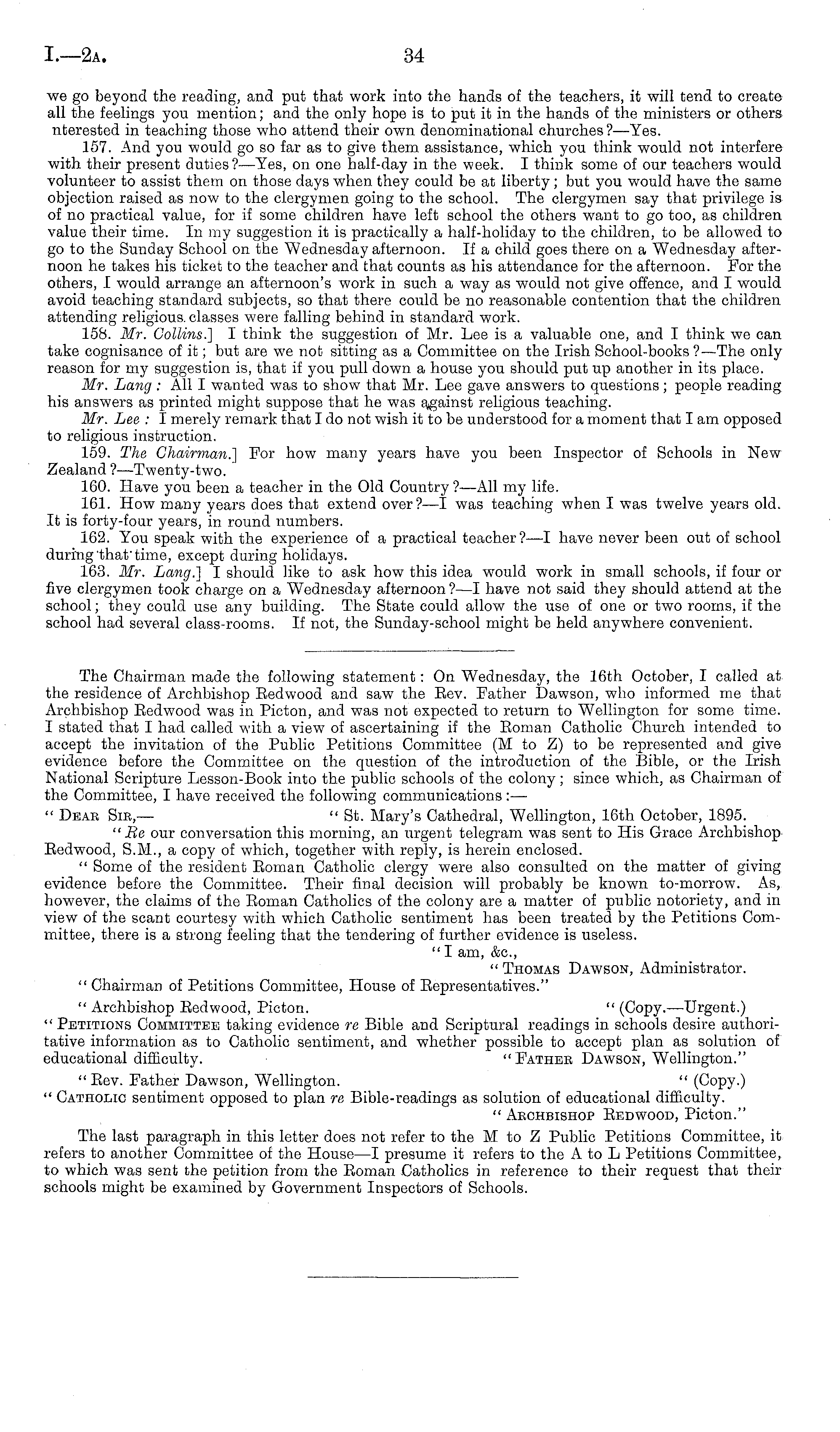 The Chairman made the following statement : On Wednesday, the 16th October, I called at the residence of Archbishop Eedwood and saw the Eev. Father Dawson, who informed me that Archbishop Eedwood was in Picton, and was not expected to return to Wellington for some time. I stated that I had called with a view of ascertaining if the Eoman Catholic Church intended to accept the invitation of the Public Petitions Committee (M to Z) to be represented and give evidence before the Committee on the question of the introduction of the Bible, or the Irish National Scripture Lesson-Book into the public schools of the colony; since which, as Chairman of the Committee, I have received the following communications: — " Dbab Sib,— " St. Mary's Cathedral, Wellington, 16th October, 1895. "Be our conversation this morning, an urgent telegram was sent to His Grace Archbishop Eedwood, S.M., a copy of which, together with reply, is herein enclosed. " Some of the resident Eoman Catholic clergy were also consulted on the matter of giving evidence before the Committee. Their final decision will probably be known to-morrow. As, however, the claims of the Eoman Catholics of the colony are a matter of public notoriety, and in view of the scant courtesy with which Catholic sentiment has been treated by the Petitions Committee, there is a strong feeling that the tendering of further evidence is useless. "I am, &c, " Thomas Dawson, Administrator. " Chairman of Petitions Committee, House of Eepresentatives." " Archbishop Eedwood, Picton. " (Copy.—Urgent.) " Petitions Committee taking evidence re Bible and Scriptural readings in schools desire authoritative information as to Catholic sentiment, and whether possible to accept plan as solution of educational difficulty. " Fatheb Dawson, Wellington." " Eev. Father Dawson, Wellington. " (Copy.) " Catholic sentiment opposed to plan re Bible-readings as solution of educational difficulty. " Aechbishop Eedwood, Picton." The last paragraph in this letter does not refer to the M to Z Public Petitions Committee, it refers to another Committee of the House —I presume it refers to the Ato L Petitions Committee, to which was sent the petition from the Eoman Catholics in reference to their request that their schools might be examined by Government Inspectors of Schools.