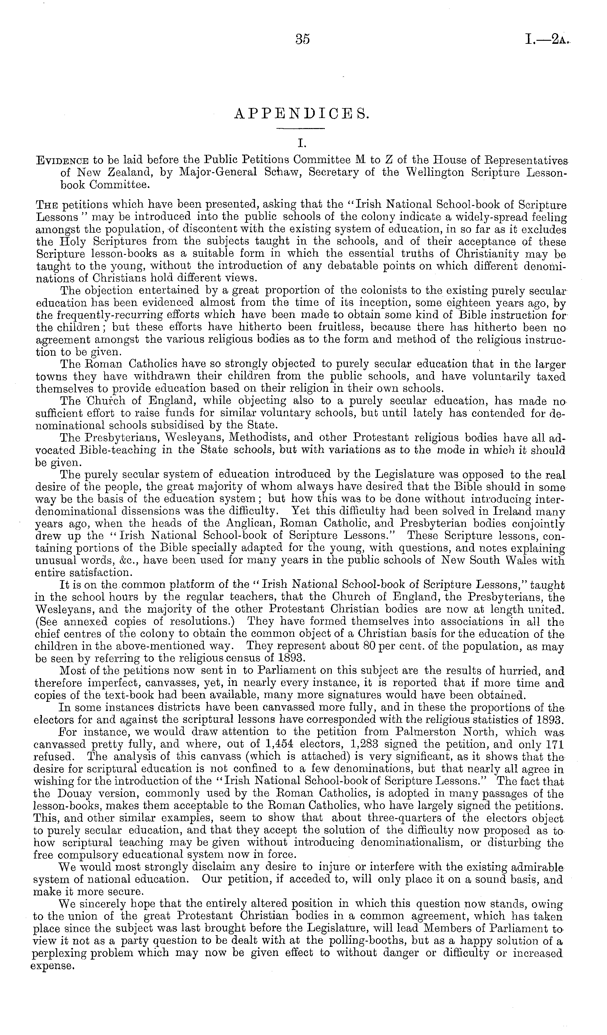 I. Evidence to be laid before the Public Petitions Committee M to Z of the House of Bepresentatives of New Zealand, by Major-General Schaw, Secretary of the Wellington Scripture Lessonbook Committee. The petitions which have been presented, asking that the "Irish National School-book of Scripture Lessons " may be introduced into the public schools of the colony indicate a widely-spread feeling amongst the population, of discontent with the existing system of education, in so far as it excludes the Holy Scriptures from the subjects taught in the schools, and of their acceptance of these Scripture lesson-books as a suitable form in which the essential truths of Christianity may be taught to the young, without the introduction of any debatable points on which different denominations of Christians hold different views. The objection entertained by a great proportion of the colonists to the existing purely secular education has been evidenced almost from the time of its inception, some eighteen years ago, by the frequently-recurring efforts which have been made to obtain some kind of Bible instruction for the children; but these efforts have hitherto been fruitless, because there has hitherto been no agreement amongst the various religious bodies as to the form and method of the religious instruction to be given. The Eoman Catholics have so strongly objected to purely secular education that in the larger towns they have withdrawn their children from the public schools, and have voluntarily taxed themselves to provide education based on their religion in their own schools. The 'Church of England, while objecting also to a purely secular education, has made no sufficient effort to raise funds for similar voluntary schools, but until lately has contended for denominational schools subsidised by the State. The Presbyterians, Wesleyans, Methodists, and other Protestant religious bodies have all advocated Bible-teaching in the State schools, but with variations as to the mode in which it should be given. The purely secular system of education introduced by the Legislature was opposed to the real desire of the people, the great majority of whom always have desired that the Bible should in some way be the basis of the education system ; but how this was to be done without introducing interdenominational dissensions was the difficulty. Yet this difficulty had been solved in Ireland many years ago, when the heads of the Anglican, Eoman Catholic, and Presbyterian bodies conjointly drew up the "Irish National School-book of Scripture Lessons." These Scripture lessons, containing portions of the Bible specially adapted for the young, with questions, and notes explaining unusual words, &c, have been used for many years in the public schools of New South Wales with entire satisfaction. It is on the.common platform of the " Irish National School-book of Scripture Lessons," taught in the school hours by the regular teachers, that the Church of England, the Presbyterians, the Wesleyans, and the majority of the other Protestant Christian bodies are now at length united. (See annexed copies of resolutions.) They have formed themselves into associations in all the chief centres of the colony to obtain the common object of a Christian basis for the education of the children in the above-mentioned way. They represent about 80 per cent, of the population, as may be seen by referring to the religious census of 1893. Most of the petitions now sent in to Parliament on this subject are the results of hurried, and therefore imperfect, canvasses, yet, in nearly every instance, it is reported that if more time and copies of the text-book had been available, many more signatures would have been obtained. In some instances districts have been canvassed more fully, and in these the proportions of the electors for and against the scriptural lessons have corresponded with the religious statistics of 1893. For instance, we would draw attention to the petition from Palmerston North, which was canvassed pretty fully, and where, out of 1,454 electors, 1,283 signed the petition, and only 171 refused. The analysis of this canvass (which is attached) is very significant, as it shows that thedesire for scriptural education is not confined to a few denominations, but that nearly all agree in wishing for the introduction of the "Irish National School-book of Scripture Lessons." The fact that the Douay version, commonly used by the Eoman Catholics, is adopted in many passages of the lesson-books, makes them acceptable to the Eoman Catholics, who have largely signed the petitions. This, and other similar examples, seem to show that about three-quarters of the electors object to purely secular education, and that they accept the solution of the difficulty now proposed as tohow scriptural teaching may be given without introducing denominationalism, or disturbing the free compulsory educational system now in force. We would most strongly disclaim any desire to injure or interfere with the existing admirable system of national education. Our petition, if acceded to, will only place it on a sound basis, and make it more secure. We sincerely hope that the entirely altered position in which this question now stands, owing to the union of the great Protestant Christian bodies in a common agreement, which has taken place since the subject was last brought before the Legislature, will lead Members of Parliament to view it not as a party question to be dealt with at the polling-booths, but as a happy solution of a perplexing problem which may now be given effect to without danger or difficulty or increased expense.