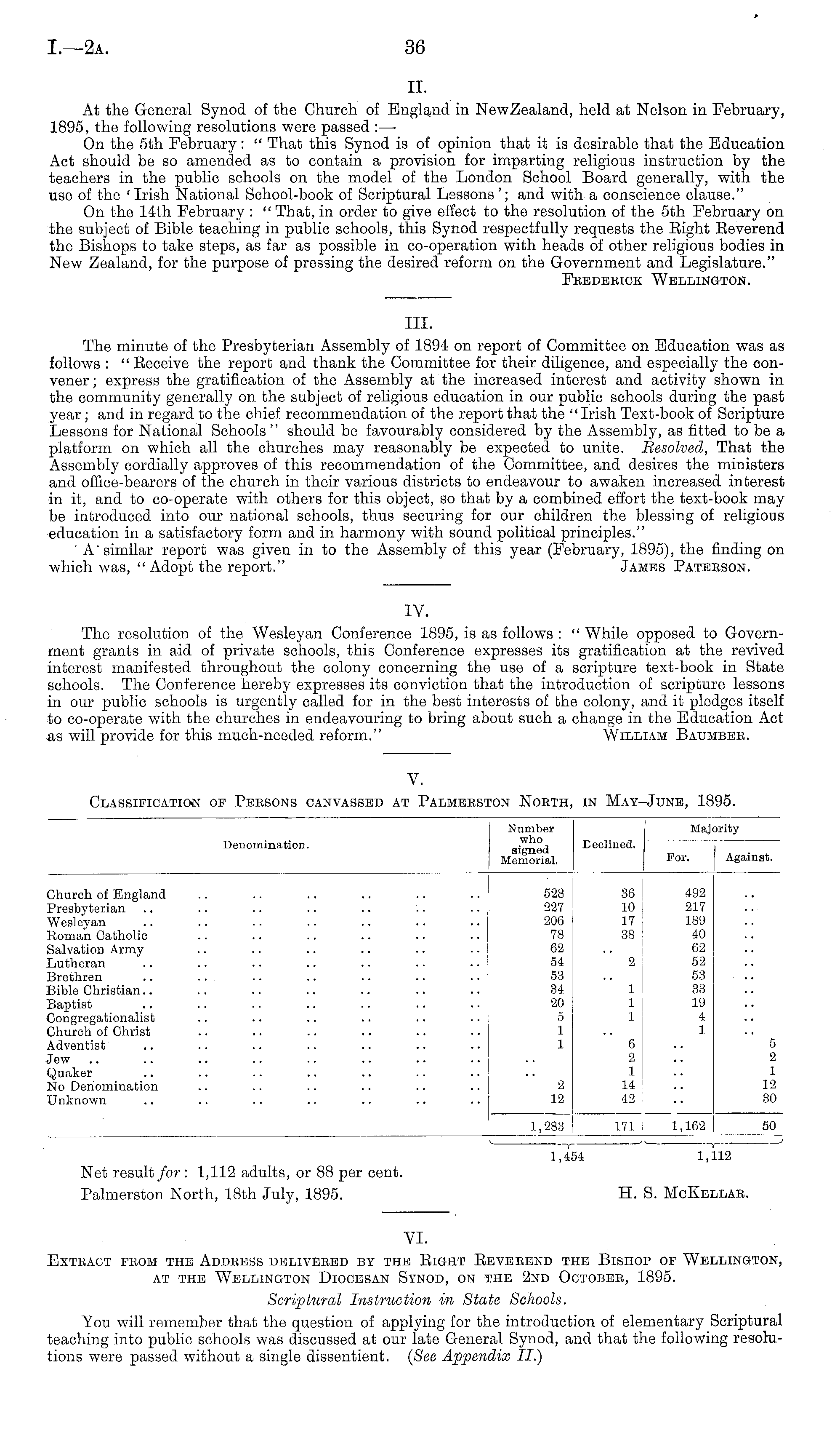 1,454 1,112 Net result for : 1,112 adults, or 88 per cent. Palmerston North, 18th July, 1895. H. S. McKellab. VI. Extract feom the Addeess delivered by the Eight Beveeend the Bishop of Wellington, at the Wellington Diocesan Synod, on the 2nd Octobee, 1895. Scriptural Instruction in State Schools. You will remember that the question of applying for the introduction of elementary Scriptural teaching into public schools was discussed at our late General Synod, and that the following resolutions were passed without a single dissentient. (See Appendix II.)