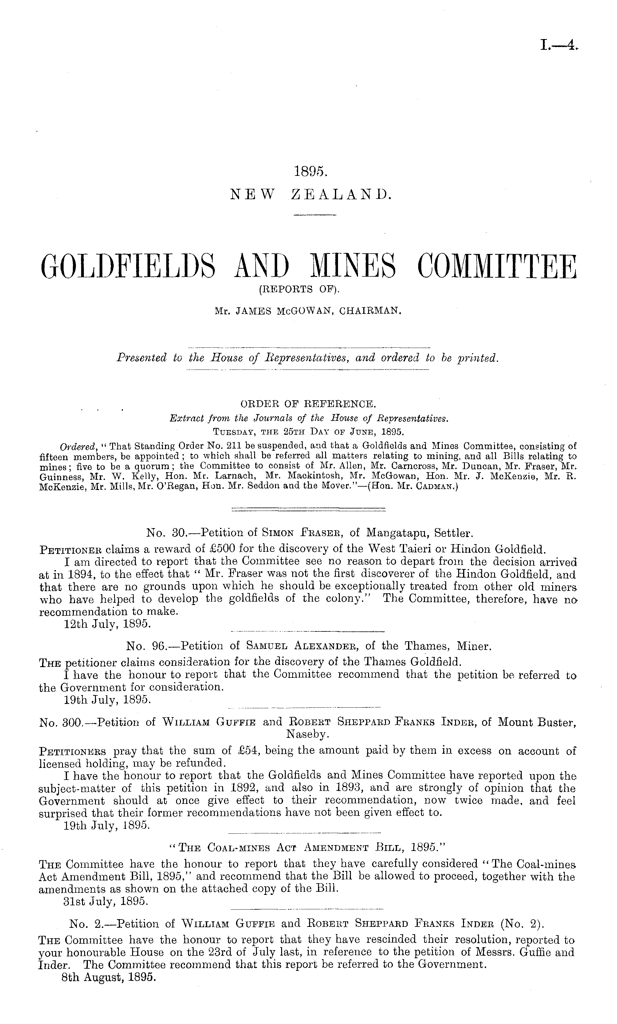 ORDER OF REFERENCE. Extract from the Journals of the House of Representatives. Tuesday, the 25th Day of June, 1895. Ordered, " That Standing Order No. 211 be suspended, and that a Goldfields and Mines Committee, consisting of fifteen members, be appointed ; to which shall be referred all matters relating to mining, and all Bills relating to mines; five to be a quorum; the Committee to consist of Mr. Allen, Mr. Carncross, Mr. Duncan, Mr. Fraser, Mr. Guinness, Mr. W. Kelly, Hon. Mr. Larnach, Mr. Mackintosh, Mr. McGowan, Hon. Mr. J. McKenzie, Mr. R. McKenzie, Mr. Mills, Mr. O'Regan, Han. Mr. Seddon and the Mover."—(Hon. Mr. Cadman.)