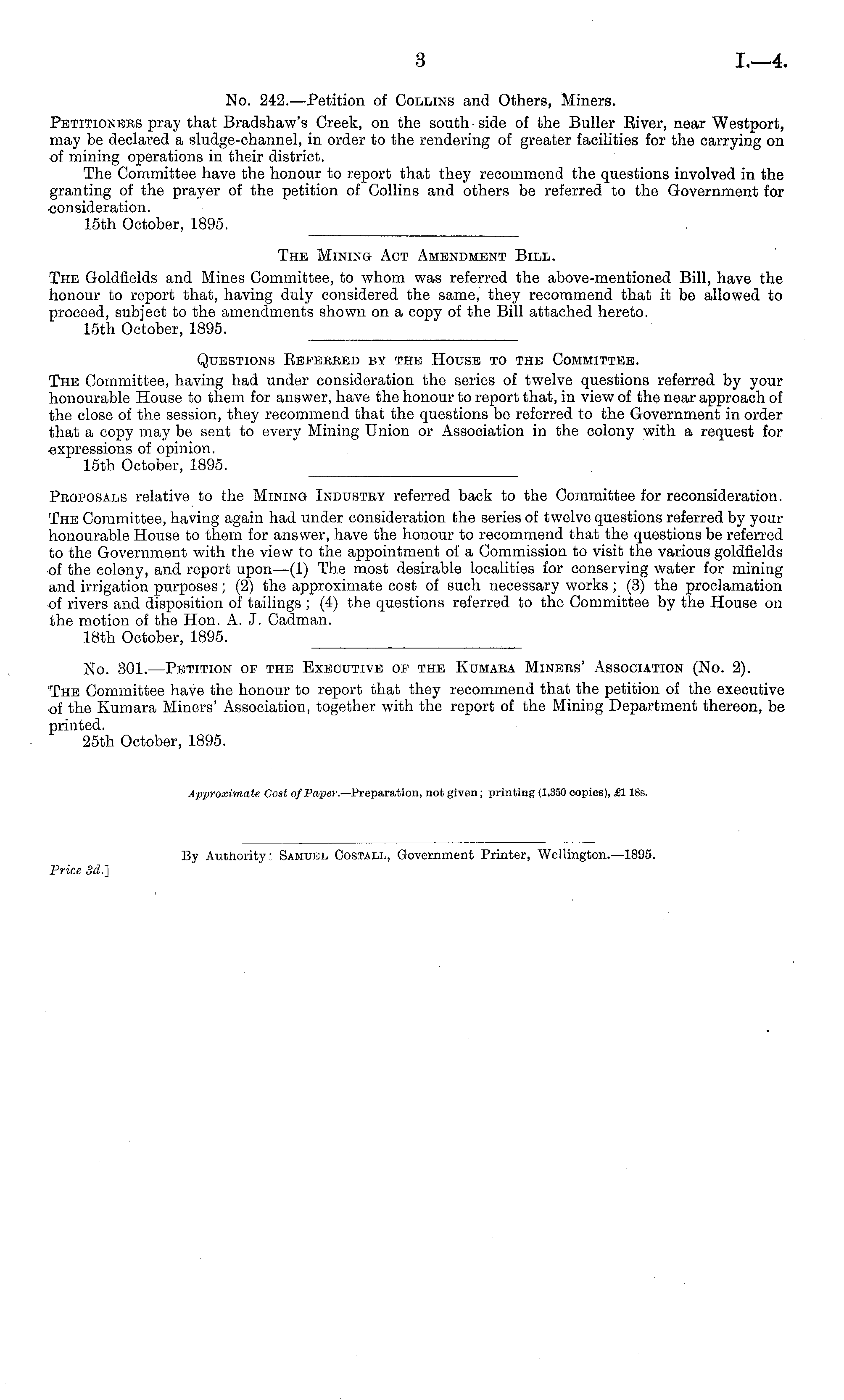 No. 301. —Petition op the Executive of the Kumara Minces , Association (No. 2). The Committee have the honour to report that they recommend that the petition of the executive of the Kumara Miners' Association, together with the report of the Mining Department thereon, be printed. 25th October, 1895. Approximate Cost of Paper.— Preparation, not given; printing (1,350 copies), £1 18s.