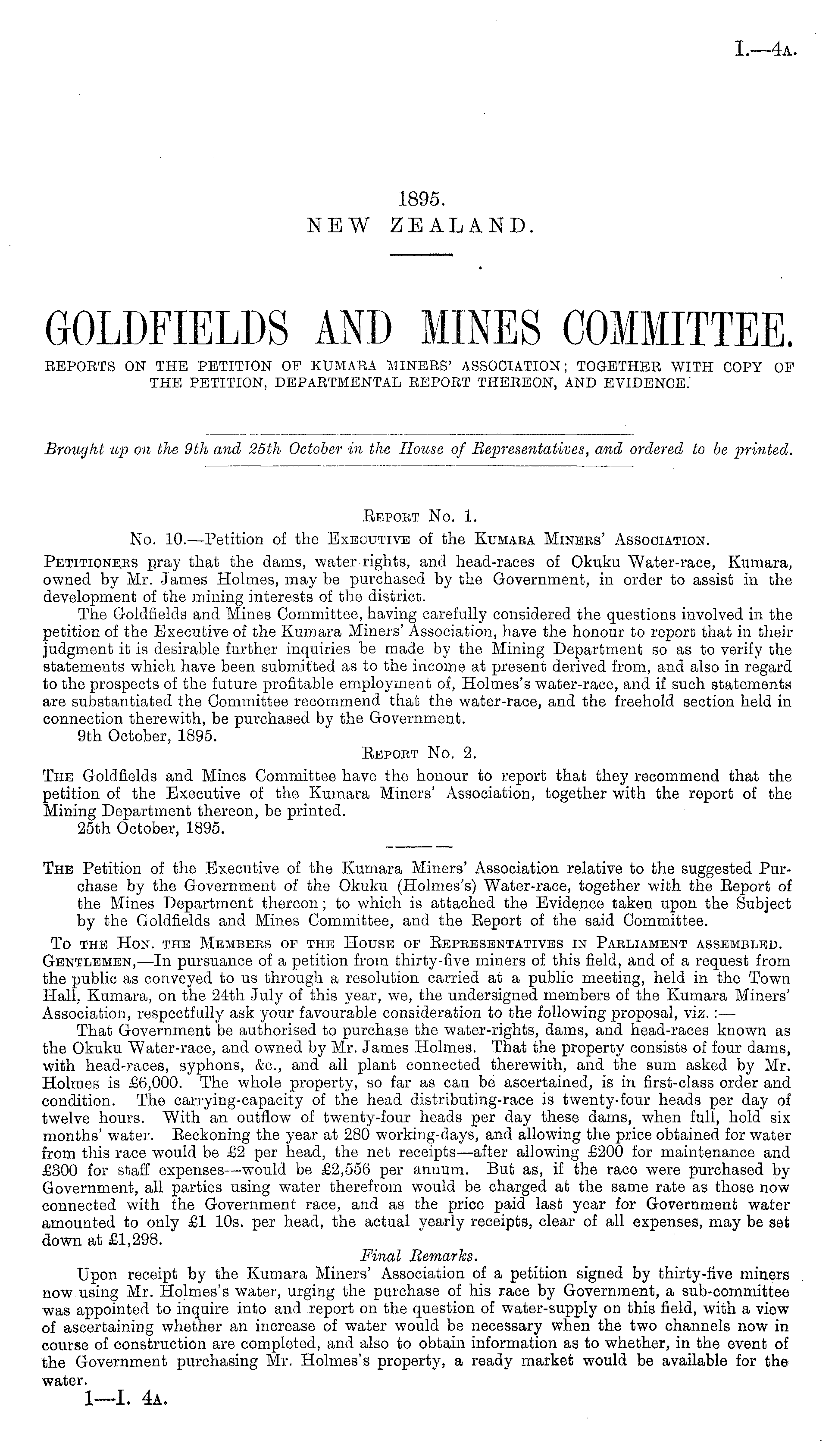 GOLDFIELDS AND MINES COMMITTEE. REPORTS ON THE PETITION OF KUMARA MINERS' ASSOCIATION; TOGETHER WITH COPY OF THE PETITION, DEPARTMENTAL REPORT THEREON, AND EVIDENCE.
