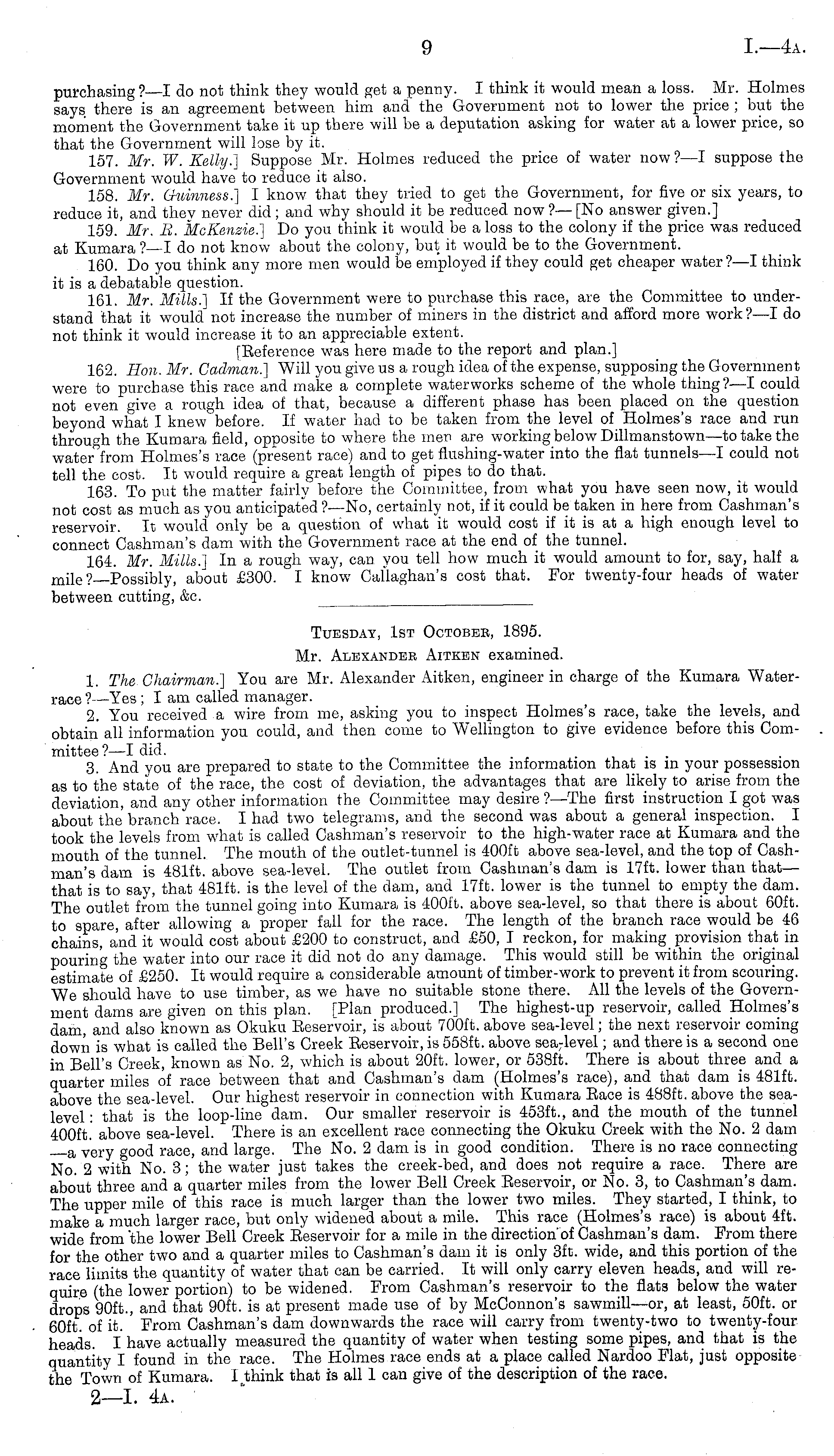 purchasing ?—I do not think they would get a penny. I think it would mean a loss. Mr. Holmes says there is an agreement between him and the Government not to lower the price ; but the moment the Government take it up there will be a deputation asking for water at a lower price, so that the Government will lose by it. 157. Mr. W. Kelly.] Suppose Mr. Holmes reduced the price of water now ?—I suppose the Government would have to reduce it also. 158. Mr. Guinness.] I know that they tried to get the Government, for five or six years, to reduce it, and they never did; and why should it be reduced now ?— [No answer given.] 159. Mr. B. McKenzie.] Do you think it would be a loss to the colony if the price was reduced at Kumara ? —I do not know about the colony, but it would be to the Government. 160. Do you think any more men would be employed if they could get cheaper water?—l think it is a debatable question. 161. Mr. Mills.] If the Government were to purchase this race, are the Committee to understand that it would not increase the number of miners in the district and afford more work?—l do not think it would increase it to an appreciable extent. [Eeference was here made to the report and plan.] 162. Hon. Mr. Cadman.] Will you give us a rough idea of the expense, supposing the Government were to purchase this race and make a complete waterworks scheme of the whole thing?—l could not even give a rough idea of that, because a different phase has been placed on the question beyond what I knew before. If water had to be taken from the level of Holmes's race and run through the Kumara field, opposite to where the men are working below Dillmanstown—to take the water from Holmes's race (present race) and to get flushing-water into the flat tunnels —I could not tell the cost. It would require a great length of pipes to do that. 163. To put the matter fairly before the Committee, from what you have seen now, it would not cost as much as you anticipated ? —No, certainly not, if it could be taken in here from Cashman's reservoir. It would only be a question of what it would cost if it is at a high enough level to connect Cashman's dam with the Government race at the end of the tunnel. 164. Mr. Mills.] In a rough way, can you tell how much it would amount to for, say, half a mile ? Possibly, about £300. I know Callaghan's cost that. For twenty-four heads of water between cutting, &c.
