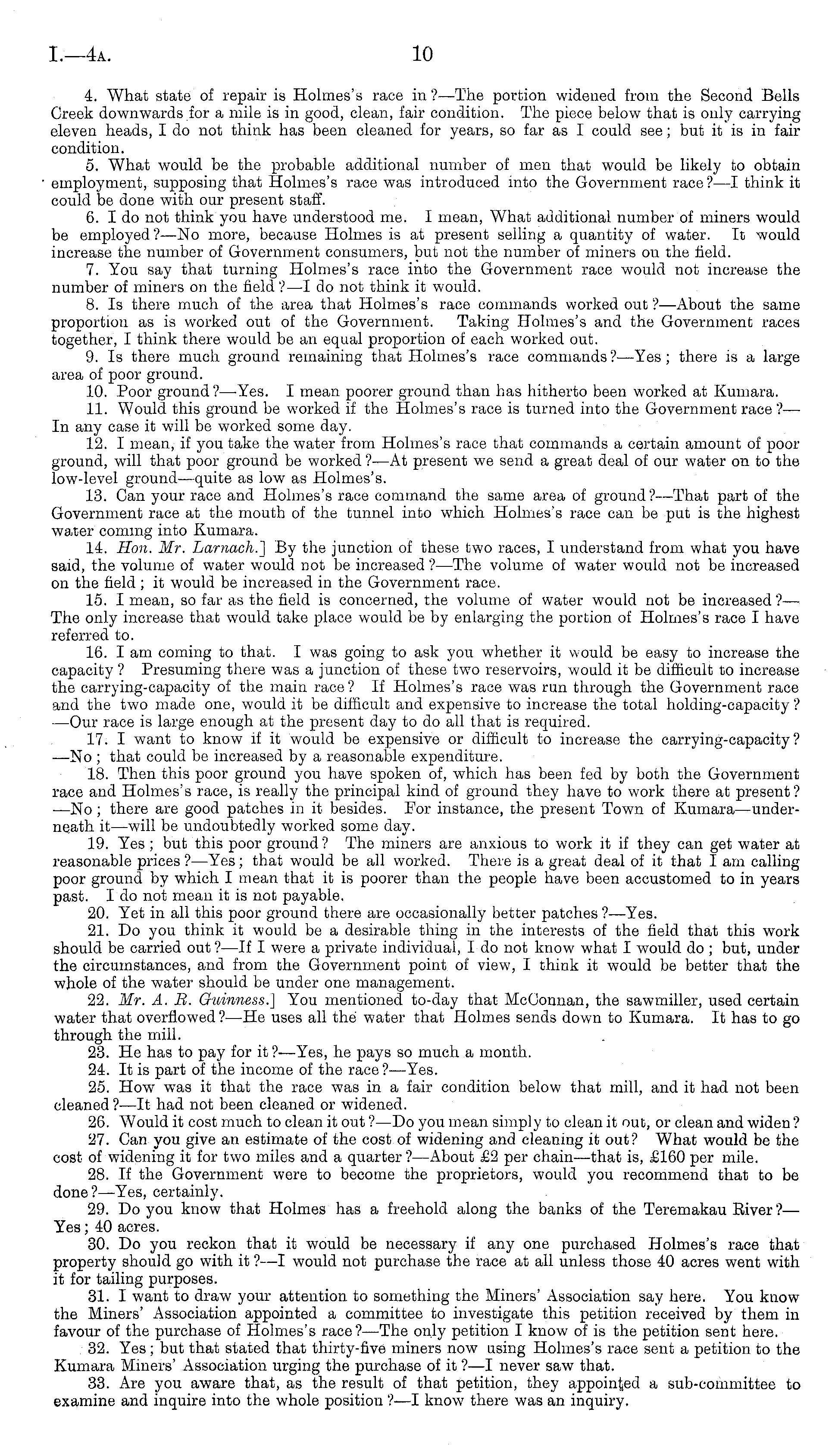 4. What state of repair is Holmes's race in ?—The portion widened from the Second Bells Creek downwards for a mile is in good, clean, fair condition. The piece below that is only carrying eleven heads, Ido not think has been cleaned for years, so far as I could see; but it is in fair condition. 5. "What would be the probable additional number of men that would be likely to obtain employment, supposing that Holmes's race was introduced into the Government race? —I think it could be done with our present staff. 6. Ido not think you have understood me. I mean, What additional number of miners would be employed ?—No more, because Holmes is at present selling a quantity of water. It would increase the number of Government consumers, but not the number of miners on the field. 7. You say that turning Holmes's race into the Government race would not increase the number of miners on the field ? —I do not think it would. 8. Is there much of the area that Holmes's race commands worked out ? —About the same proportion as is worked out of the Government. Taking Holmes's and the Government races together, I think there would be an equal proportion of each worked out. 9. Is there much ground remaining that Holmes's race commands ?—Yes ; there is a large area of poor ground. 10. Poor ground ?—Yes. I mean poorer ground than has hitherto been worked at Kumara. 11. Would this ground be worked if the Holmes's race is turned into the Government race ?— In any case it will be worked some day. 12. I mean, if you take the water from Holmes's race that commands a certain amount of poor ground, will that poor ground be worked ?—At present we send a great deal of our water on to the low-level ground—quite as low as Holmes's. 13. Can your race and Holmes's race command the same area of ground ?—That part of the Government race at the mouth of the tunnel into which Holmes's race can be put is the highest water coming into Kumara. 14. Hon. Mr. Larnach.] By the junction of these two races, I understand from what you have said, the volume of water would not be increased ?—The volume of water would not be increased on the field ; it would be increased in the Government race. 15. I mean, so far as the field is concerned, the volume of water would not be increased ?— The only increase that would take place would be by enlarging the portion of Holmes's race I have referred to. 16. lam coming to that. I was going to ask you whether it would be easy to increase the capacity ? Presuming there was a junction of these two reservoirs, would it be difficult to increase the carrying-capacity of the main race? If Holmes's race was run through the Government race and the two made one, would it be difficult and expensive to increase the total holding-capacity ? —Our race is large enough at the present day to do all that is required. 17. I want to know if it would be expensive or difficult to increase the carrying-capacity? —No ; that could be increased by a reasonable expenditure. 18. Then this poor ground you have spoken of, which has been fed by both the Government race and Holmes's race, is really the principal kind of ground they have to work there at present? —No ; there are good patches in it besides. For instance, the present Town of Kumara—underneath it — will be undoubtedly worked some day. 19. Yes ; but this poor ground? The miners are anxious to work it if they can get water at reasonable prices ?—Yes ; that would be all worked. There is a great deal of it that lam calling poor ground by which I mean that it is poorer than the people have been accustomed to in years past. Ido not mean it is not payable. 20. Yet in all this poor ground there are occasionally better patches ?—Yes. 21. Do you think it would be a desirable thing in the interests of the field that this work should be carried out ?—lf I were a private individual, I do not know what I would do ; but, under the circumstances, and from the Government point of view, I think it would be better that the whole of the water should be under one management. 22. Mr. A. B. Guinness.] You mentioned to-day that McConnan, the sawmiller, used certain water that overflowed ?—He uses all the water that Holmes sends down to Kumara. It has to go through the mill. 23. He has to pay for it ? —Yes, he pays so much a month. 24. It is part of the income of the race ? —Yes. 25. How was it that the race was in a fair condition below that mill, and it had not been cleaned ?—lt had not been cleaned or widened. 26. Would it cost much to clean it out ?—Do you mean simply to clean it out, or clean and widen ? 27. Can you give an estimate of the cost of widening and cleaning it out? What would be the cost of widening it for two miles and a quarter ? —About £2 per chain—that is, £160 per mile. 28. If the Government were to become the proprietors, would you recommend that to be done? —Yes, certainly. 29. Do you know that Holmes has a freehold along the banks of the Teremakau River?— Yes; 40 acres. 30. Do you reckon that it would be necessary if any one purchased Holmes's race that property should go with it ?—I would not purchase the race at all unless those 40 acres went with it for tailing purposes. 31. I want to draw your attention to something the Miners' Association say here. You know the Miners' Association appointed a committee to investigate this petition received by them in favour of the purchase of Holmes's race? —The only petition I know of is the petition sent here. 32. Yes ; but that stated that thirty-five miners now using Holmes's race sent a petition to the Kumara Miners' Association urging the purchase of it ?—I never saw that. 33. Are you aware that, as the result of that petition, they appointed a sub-committee to examine and inquire into the whole position ?—I know there was an inquiry.