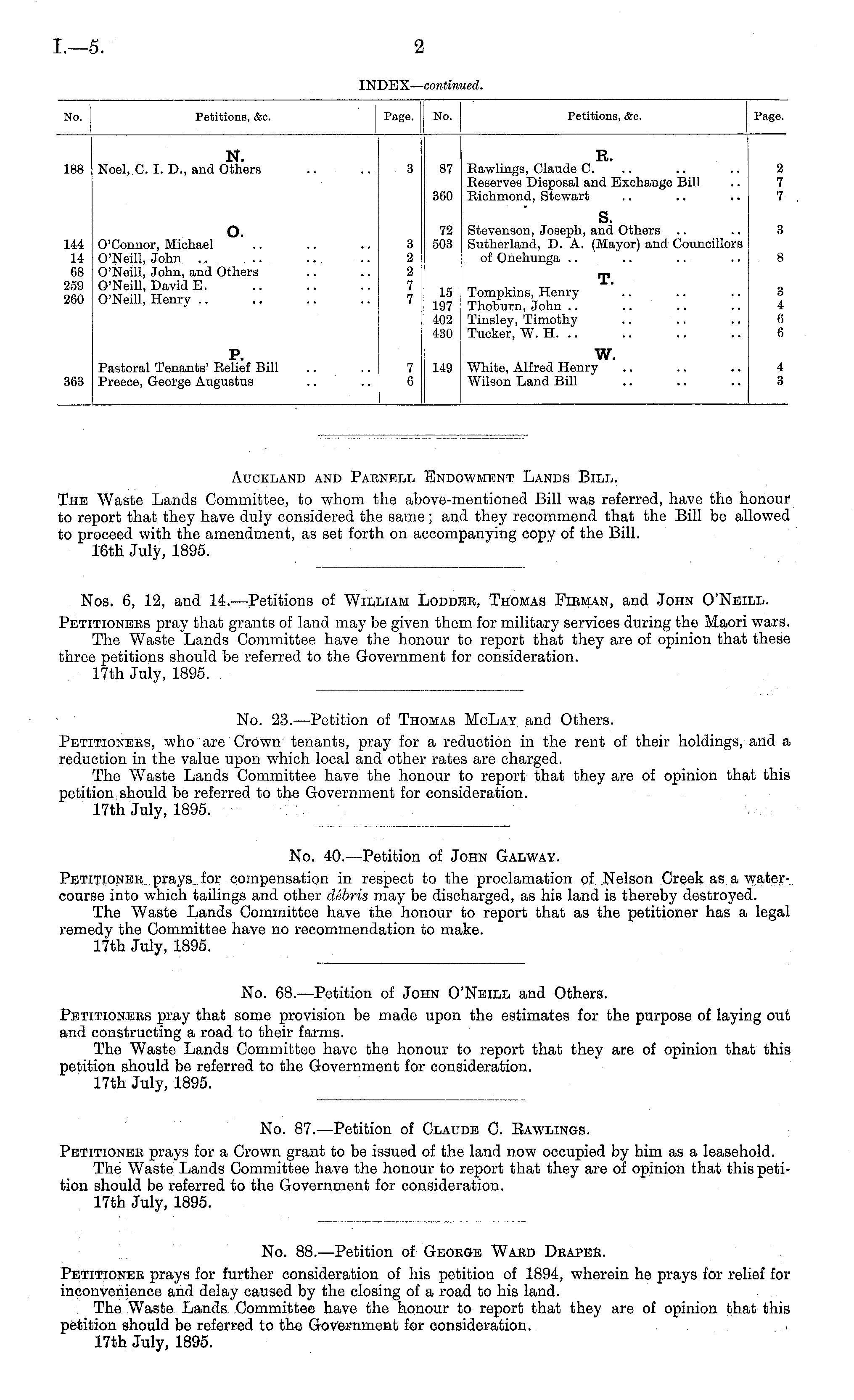 No. 87.—Petition of Claude C. Bawlings. Petitioner prays for a Crown grant to be issued of the land now occupied by him as a leasehold. The Waste Lands Committee have the honour to report that they are of opinion that this petition should be referred to the Government for consideration. 17th July, 1895.