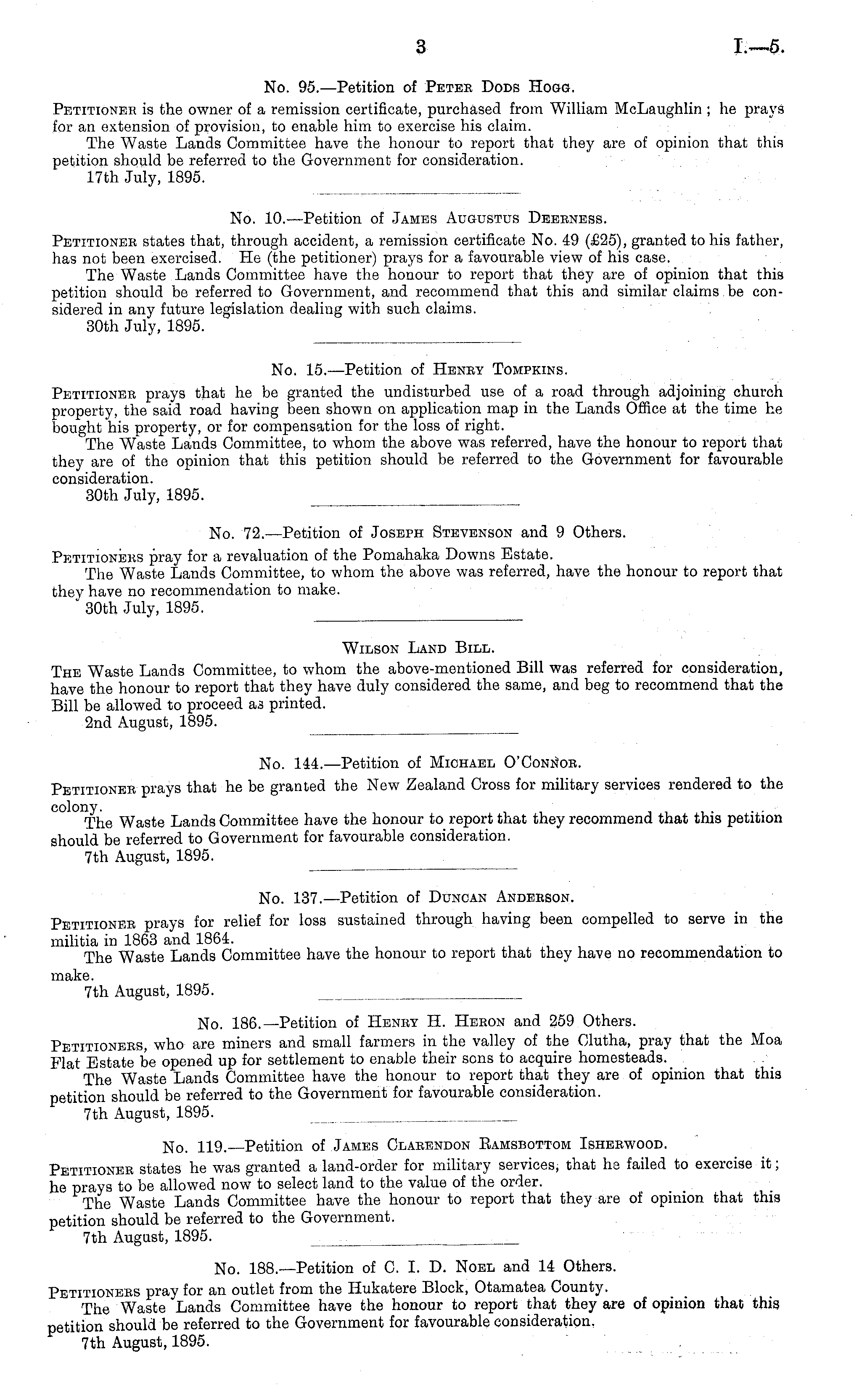 No. 95.—Petition of Petee Dods Hogg. Petitioner is the owner of a remission certificate, purchased from William McLaughlin ; he prays for an extension of provision, to enable him to exercise his claim. The Waste Lands Committee have the honour to report that they are of opinion that this petition should be referred to the Government for consideration. 17th July, 1895.