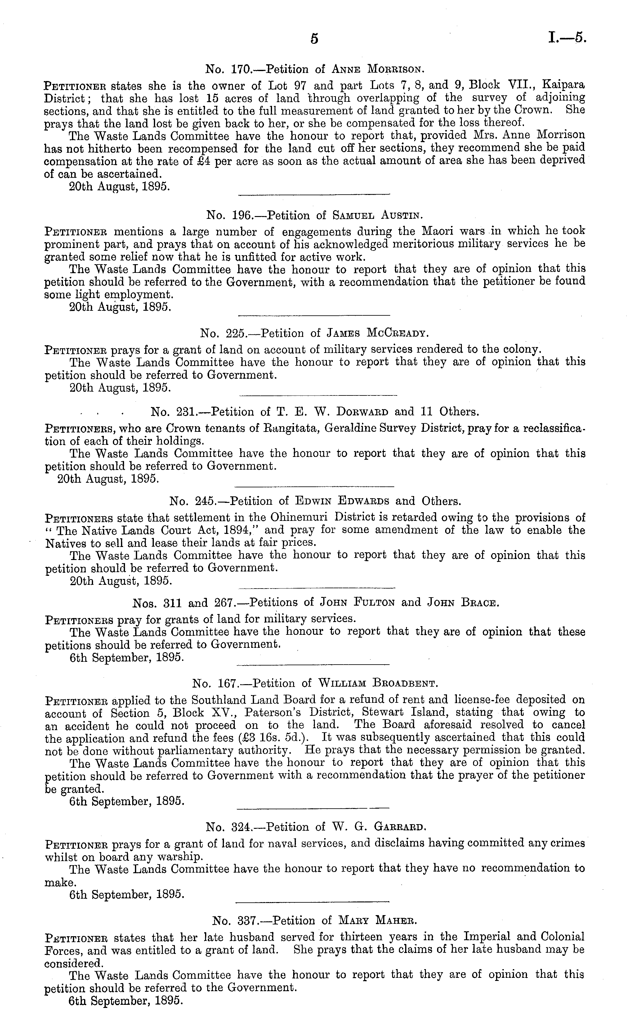 No. 196.—Petition of Samuel Austin. Petitioner mentions a large number of engagements during the Maori wars in which he took prominent part, and prays that on account of his acknowledged meritorious military services he be granted some relief now that he is unfitted for active work. The Waste Lands Committee have the honour to report that they are of opinion that this petition should be referred to the Government, with a recommendation that the petitioner be found some light employment. 20th August, 1895.
