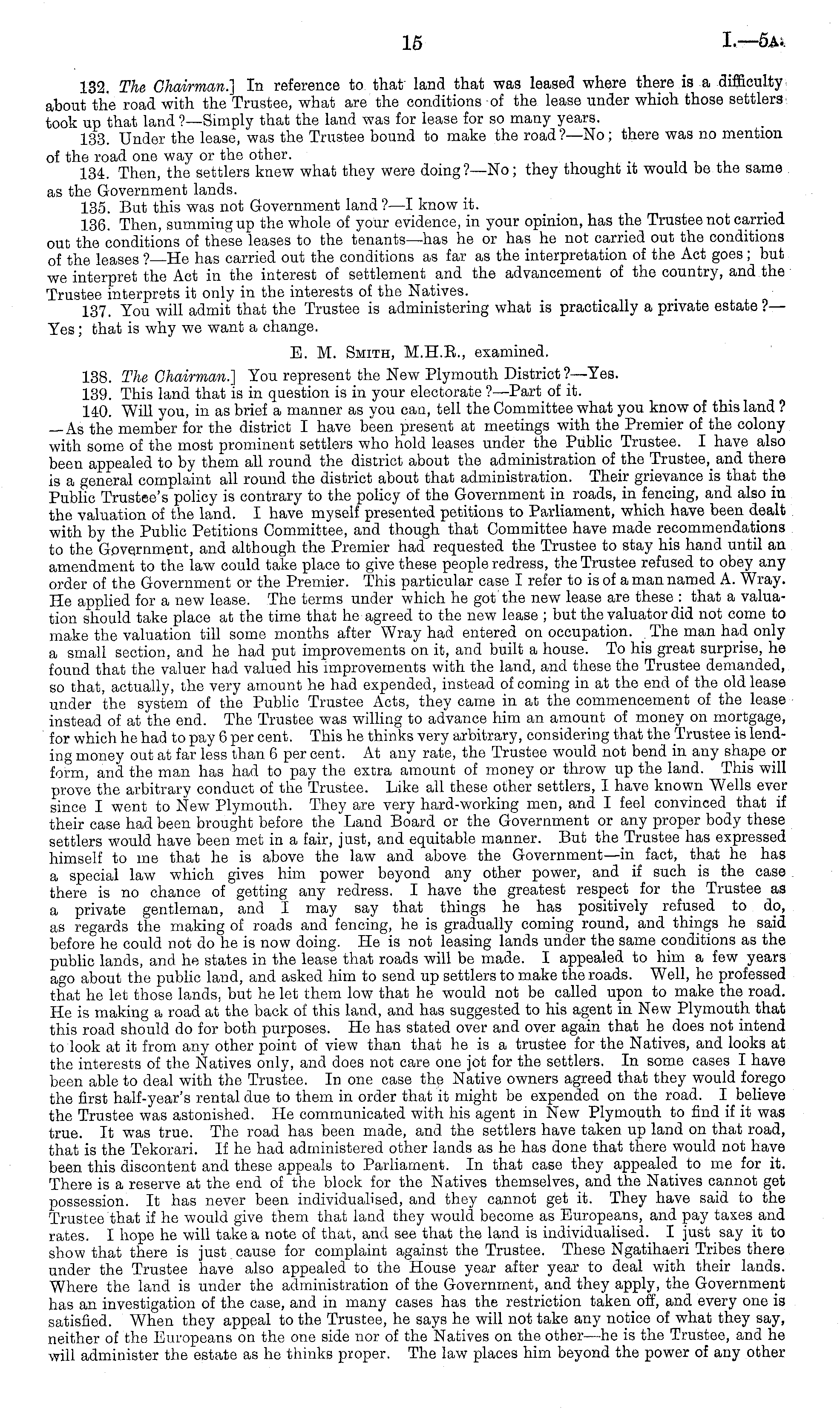 132. The Chairman.] In reference to that land that was leased where there is a difficulty about the road with the Trustee, what are the conditions of the lease under which those settlers took up that land ?—Simply that the land was for lease for so many years. 133. Under the lease, was the Trustee bound to make the road?—No; there was no mention of the road one way or the other. 134. Then, the settlers knew what they were doing?—No; they thought it would be the same as the Government lands. 135. But this was not Government land ?—I know it. 136. Then, summing up the whole of your evidence, in your opinion, has the Trustee not carried out the conditions of these leases to the tenants—has he or has he not carried out the conditions of the leases ? He has carried out the conditions as far as the interpretation of the Act goes ; but we interpret the Act in the interest of settlement and the advancement of the country, and the Trustee interprets it only in the interests of the Natives. 137. You will admit that the Trustee is administering what is practically a private estate ?— Yes; that is why we want a change. E. M. Smith, M.H.R., examined. 138. The Chairman.] You represent the New Plymouth District?— Yes. 139. This land that is in question is in your electorate ?—Part of it. 140. Will you, in as brief a manner as you can, tell the Committee what you know of this land ? —As the member for the district I have been present at meetings with the Premier of the colony with some of the most prominent settlers who hold leases under the Public Trustee. I have also been appealed to by them all round the district about the administration of the Trustee, and there is a general complaint all round the district about that administration. Their grievance is that the Public Trustee's policy is contrary to the policy of the Government in roads, in fencing, and also in the valuation of the land. I have myself presented petitions to Parliament, which have been dealt with by the Public Petitions Committee, and though that Committee have made recommendations to the Government, and although the Premier had requested the Trustee to stay his hand until an amendment to the law could take place to give these people redress, the Trustee refused to obey any order of the Government or the Premier. This particular case I refer to is of a man named A. Wray. He applied for a new lease. The terms under which he got'the new lease are these : that a valuation should take place at the time that he agreed to the new lease ; but the valuator did not come to make the valuation till some months after Wray had entered on occupation. The man had only a small section, and he had put improvements on it, and built a house. To his great surprise, he found that the valuer had valued his improvements with the land, and these the Trustee demanded, so that, actually, the very amount he had expended, instead of coming in at the end of the old lease under the system of the Public Trustee Acts, they came in at the commencement of the lease instead of at the end. The Trustee was willing to advance him an amount of money on mortgage, for which he had to pay 6 per cent. This he thinks very arbitrary, considering that the Trustee is lending money out at far less than 6 per cent. At any rate, the Trustee would not bend in any shape or form, and the man has had to pay the extra amount of money or throw up the land. This will prove the arbitrary conduct of the Trustee. Like all these other settlers, I have known Wells ever since I went to New Plymouth. They are very hard-working men, and I feel convinced that if their case had been brought before the Land Board or the Government or any proper body these settlers would have been met in a fair, just, and equitable manner. But the Trustee has expressed himself to me that he is above the law and above the Government —in fact, that he has a special law which gives him power beyond any other power, and if such is the case there is no chance of getting any redress. I have the greatest respect for the Trustee as a private gentleman, and I may say that things he has positively refused to do, as regards the making of roads and fencing, he is gradually coming round, and things he said before he could not do he is now doing. He is not leasing lands under the same conditions as the public lands, and he states in the lease that roads will be made. I appealed to him a few years ago about the public land, and asked him to send up settlers to make the roads. Well, he professed that he let those lands, but he let them low that he would not be called upon to make the road. He is making a road at the back of this land, and has suggested to his agent in New Plymouth that this road should do for both purposes. He has stated over and over again that he does not intend to look at it from any other point of view than that he is a trustee for the Natives, and looks at the interests of the Natives only, and does not care one jot for the settlers. In some cases I have been able to deal with the Trustee. In one case the Native owners agreed that they would forego the first half-year's rental due to them in order that it might be expended on the road. I believe the Trustee was astonished. He communicated with his agent in New Plymouth to find if it was true. It was true. The road has been made, and the settlers have taken up land on that road, that is the Tekorari. If he had administered other lands as he has done that there would not have been this discontent and these appeals to Parliament. In that case they appealed to me for it. There is a reserve at the end of the block for the Natives themselves, and the Natives cannot get possession. It has never been individualised, and they cannot get it. They have said to the Trustee that if he would give them that land they would become as Europeans, and pay taxes and rates. I hope he will take a note of that, and see that the land is individualised. I just say it