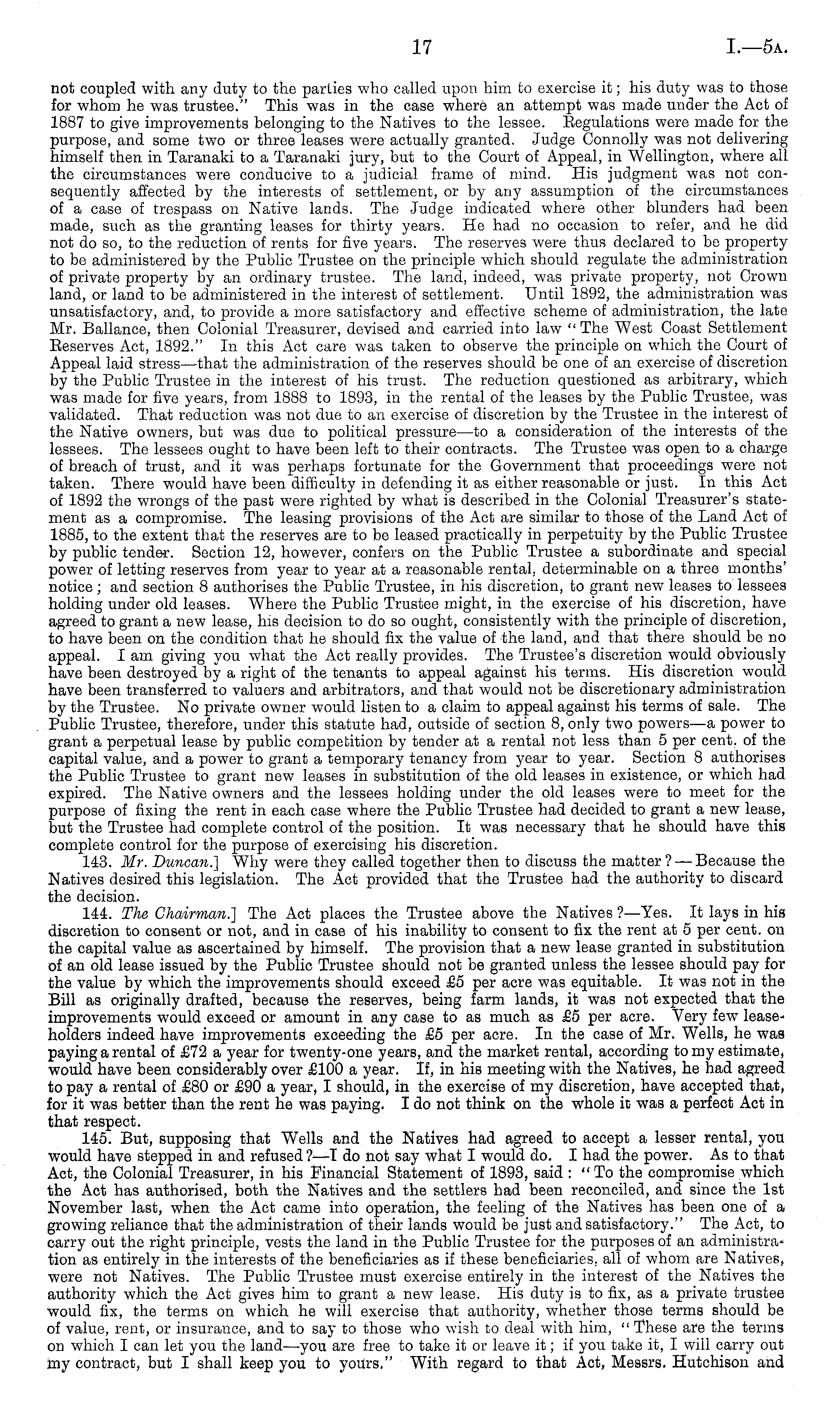 not coupled with any duty to the parties who called upon him to exercise it; his duty was to those for whom he was trustee." This was in the case where an attempt was made under the Act of 1887 to give improvements belonging to the Natives to the lessee. Regulations were made for the purpose, and some two or three leases were actually granted. Judge Connolly was not delivering himself then in Taranaki to a Taranaki jury, but to the Court of Appeal, in Wellington, where all the circumstances were conducive to a judicial frame of mind. His judgment was not consequently affected by the interests of settlement, or by any assumption of the circumstances of a case of trespass on Native lands. The Judge indicated where other blunders had been made, such as the granting leases for thirty years. He had no occasion to refer, and he did not do so, to the reduction of rents for five years. The reserves were thus declared to be property to be administered by the Public Trustee on the principle which should regulate the administration of private property by an ordinary trustee. The land, indeed, was private property, not Crown land, or land to be administered in the interest of settlement. Until 1892, the administration was unsatisfactory, and, to provide a more satisfactory and effective scheme of administration, the late Mr. Ballance, then Colonial Treasurer, devised and carried into law " The West Coast Settlement Reserves Act, 1892." In this Act care was taken to observe the principle on which the Court of Appeal laid stress —that the administration of the reserves should be one of an exercise of discretion by the Public Trustee in the interest of his trust. The reduction questioned as arbitrary, which was made for five years, from 1888 to 1893, in the rental of the leases by the Public Trustee, was validated. That reduction was not due to an exercise of discretion by the Trustee in the interest of the Native owners, but was due to political pressure —to a consideration of the interests of the lessees. The lessees ought to have been left to their contracts. The Trustee was open to a charge of breach of trust, and it was perhaps fortunate for the Government that proceedings were not taken. There would have been difficulty in defending it as either reasonable or just. In this Act of 1892 the wrongs of the past were righted by what is described in the Colonial Treasurer's statement as a compromise. The leasing provisions of the Act are similar to those of the Land Act of 1885, to the extent that the reserves are to be leased practically in perpetuity by the Public Trustee by public tender. Section 12, however, confers on the Public Trustee a subordinate and special power of letting reserves from year to year at a reasonable rental, determinable on a three months' notice; and section 8 authorises the Public Trustee, in his discretion, to grant new leases to lessees holding under old leases. Where the Public Trustee might, in the exercise of his discretion, have agreed to grant a new lease, his decision to do so ought, consistently with the principle of discretion, to have been on the condition that he should fix the value of the land, and that there should be no appeal. lam giving you what the Act really provides. The Trustee's discretion would obviously have been destroyed by a right of the tenants to appeal against his terms. His discretion would have been transferred to valuers and arbitrators, and that would not be discretionary administration by the Trustee. No private owner would listen to a claim to appeal against his terms of sale. The Public Trustee, therefore, under this statute had, outside of section 8, only two powers—a power to grant a perpetual lease by public competition by tender at a rental not less than 5 per cent, of the capital value, and a power to grant a temporary tenancy from year to year. Section 8 authorises the Public Trustee to grant new leases in substitution of the old leases in existence, or which had expired. The Native owners and the lessees holding under the old leases were to meet for the purpose of fixing the rent in each case where the Public Trustee had decided to grant a new lease, but the Trustee had complete control of the position. It was necessary that he should have this complete control for the purpose of exercising his discretion. 143. Mr. Duncan.] Why were they called together then to discuss the matter ? — Because the Natives desired this legislation. The Act provided that the Trustee had the authority to discard the decision. 144. The Chairman.] The Act places the Trustee above the Natives ? —Yes. It lays in his discretion to consent or not, and in case of his inability to consent to fix the rent at 5 per cent, on the capital value as ascertained by himself. The provision that a new lease granted in substitution of an old lease issued by the Public Trustee should not be granted unless the lessee should pay for the value by which the improvements should exceed £5 per acre was equitable. It was not in the Bill as originally drafted, because the reserves, being farm lands, it was not expected that the improvements would exceed or amount in any case to as much as £5 per acre. Very few leaseholders indeed have improvements exceeding the £5 per acre. In the case of Mr. Wells, he was paying a rental of £72 a year for twenty-one years, and the market rental, according to my estimate, would have been considerably over £100 a year. If, in his meeting with the Natives, he had agreed to pay a rental of £80 or £90 a year, I should, in the exercise of my discretion, have accepted that, for it was better than the rent he was paying. Ido not think on the whole it was a perfect Act in that respect. 145. But, supposing that Wells and the Natives had agreed to accept a lesser rental, you would have stepped in and refused?-—I do not say what I would do. I had the power. As to that Act, the Colonial Treasurer, in his Financial Statement of 1893, said : "