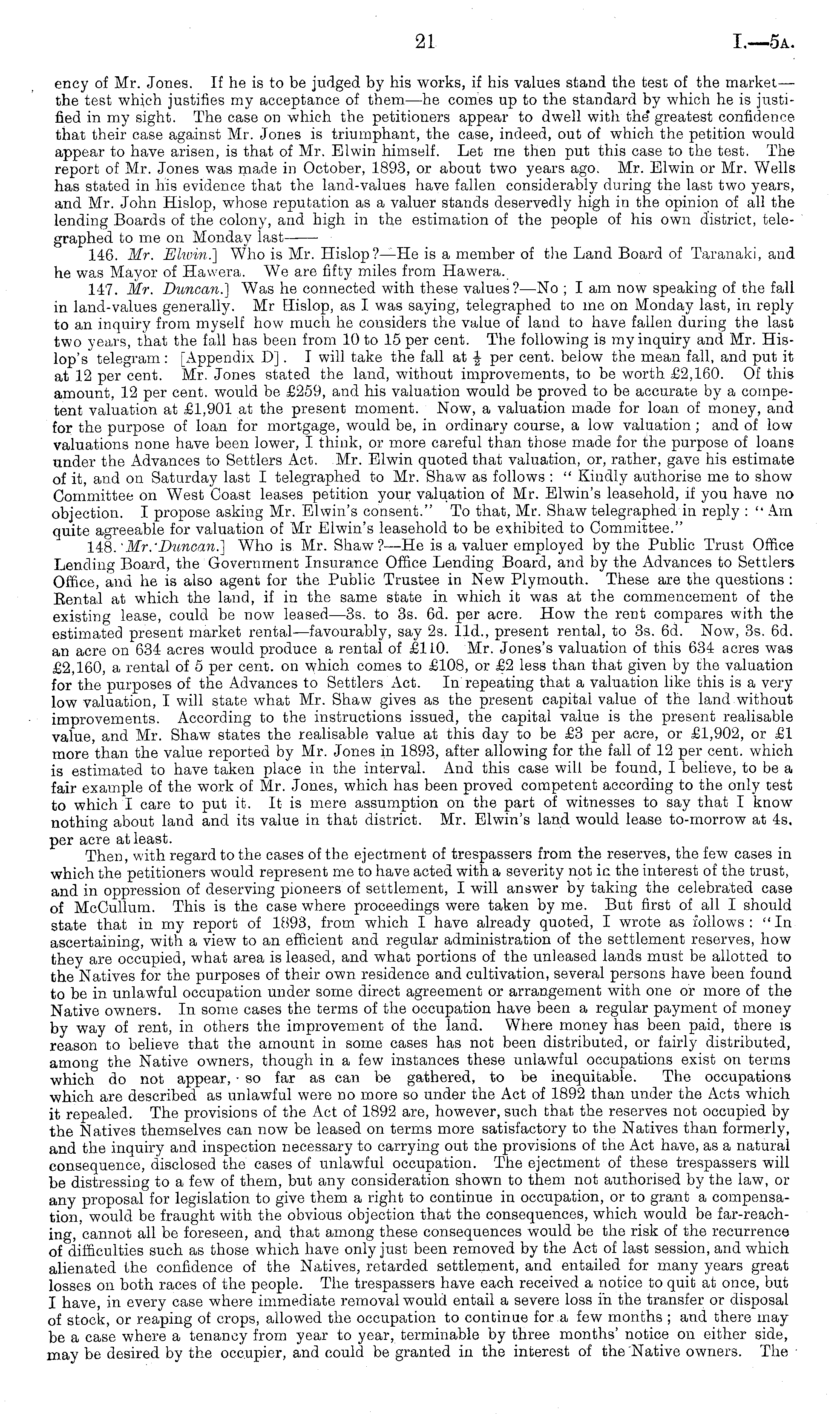 ency of Mr. Jones. If he is to be judged by his works, if his values stand the test of the market — the test which justifies my acceptance of them—he comes up to the standard by which he is justified in my sight. The case on which the petitioners appear to dwell with the' greatest confidence that their case against Mr. Jones is triumphant, the case, indeed, out of which the petition would appear to have arisen, is that of Mr. Elwin himself. Let me then put this case to the test. The report of Mr. Jones was made in October, 1893, or about two years ago. Mr. Elwin or Mr. Wells has stated in his evidence that the land-values have fallen considerably during the last two years, and Mr. John Hislop, whose reputation as a valuer stands deservedly high in the opinion of all the lending Boards of the colony, and high in the estimation of the people of his own district, telegraphed to me on Monday last 146. Mr. Elwin.] Who is Mr. Hislop?—He is a member of the Land Board of Taranaki, and he was Mayor of Hawera. We are fifty miles from Hawera. 147. Mr, Duncan.] Was he connected with these values? —No ; I am now speaking of the fall in land-values generally. Mr Bislop, as I was saying, telegraphed to me on Monday last, in reply to an inquiry from myself how much he considers the value of land to have fallen during the last two years, that the fall has been from 10 to 15 per cent. The following is my inquiry and Mr. Hislop's telegram: [Appendix D]. I will take the fall at -J- per cent, below the mean fall, and put it at 12 per cent. Mr. Jones stated the land, without improvements, to be worth £2,160. Of this amount, 12 per cent, would be £259, and his valuation would be proved to be accurate by a competent valuation at £1,901 at the present moment. Now, a valuation made for loan of money, and for the purpose of loan for mortgage, would be, in ordinary course, a low valuation ; and of low valuations none have been lower, I think, or more careful than those made for the purpose of loans under the Advances to Settlers Act. Mr. Elwin quoted that valuation, or, rather, gave his estimate of it, and on Saturday last I telegraphed to Mr. Shaw as follows : " Kindly authorise me to show Committee on West Coast leases petition your valuation of Mr. Elwin's leasehold, if you have no objection. I propose asking Mr. Elwin's consent." To that, Mr. Shaw telegraphed in reply :" Am quite agreeable for valuation of Mr Elwin's leasehold to be exhibited to Committee." 148. 'Mr.'Duncan.] Who is Mr. Shaw?—He is a valuer employed by the Public Trust Office Lending Board, the Government Insurance Office Lending Board, and by the Advances to Settlers Office, and he is also agent for the Public Trustee in New Plymouth. These are the questions : Rental at which the land, if in the same state in which it was at the commencement of the existing lease, could be now leased —3s. to 3s. 6d. per acre. How the rent compares with the estimated present market rental—favourably, say 2s. lid., present rental, to 3s. 6d. Now, 3s. 6d. an acre on 634 acres would produce a rental of £110. Mr. Jones's valuation of this 634 acres was £2,160, a rental of 5 per cent, on which comes to £108, or £2 less than that given by the valuation for the purposes of the Advances to Settlers Act. In repeating that a valuation like this is a very low valuation, I will state what Mr. Shaw gives as the present capital value of the land without improvements. According to the instructions issued, the capital value is the present realisable value, and Mr. Shaw states the realisable value at this day to be £3 per acre, or £1,902, or £1 more than the value reported by Mr. Jones in 1893, after allowing for the fall of 12 per cent, which is estimated to have taken place in the interval. And this case will be found, I believe, to be a fair example of the work of Mr. Jones, which has been proved competent according to the only test to which I care to put it. It is mere assumption on the part of witnesses to say that I know nothing about land and its value in that district. Mr. Elwin's land would lease to-morrow at 4s. per acre at least. Then, with regard to the cases of the ejectment of trespassers from the reserves, the few cases in which the petitioners would represent me to have acted with a severity not in the interest of the trust, and in oppression of deserving pioneers of settlement, I will answer by taking the celebrated case of McCullum. This is the case where proceedings were taken by me. But first of all I should state that in my report of 1893, from which I have already quoted, I wrote as follows : "In ascertaining, with a view to an efficient and regular administration of the settlement reserves, how they are occupied, what area is leased, and what portions of the unleased lands must be allotted to the Natives for the purposes of their own residence and cultivation, several persons have been found to be in unlawful occupation under some direct agreement or arrangement with one or more of the Native owners. In some cases the terms of the occupation have been a regular payment of money by way of rent, in others the improvement of the land. Where money has been paid, there is reason to believe that the amount in some cases has not been distributed, or fairly distributed, amono- the Native owners, though in a few instances these unlawful occupations exist on terms which do not appear, ■so far as can be gathered, to be inequitable. The occupations which are described as unlawful were no more so under the Act of 1892 than under the Acts which it repealed. The provisions of the Act of 1892 are, however, such that the reserves not occupied by the Natives themselves can now be leased on terms more satisfactory to the Natives than formerly, and the inquiry and inspection necessary to carrying out the provisions of the Act have, as a natural consequence, disclosed the cases of unlawful occupation. The ejectment of these trespassers will be distre