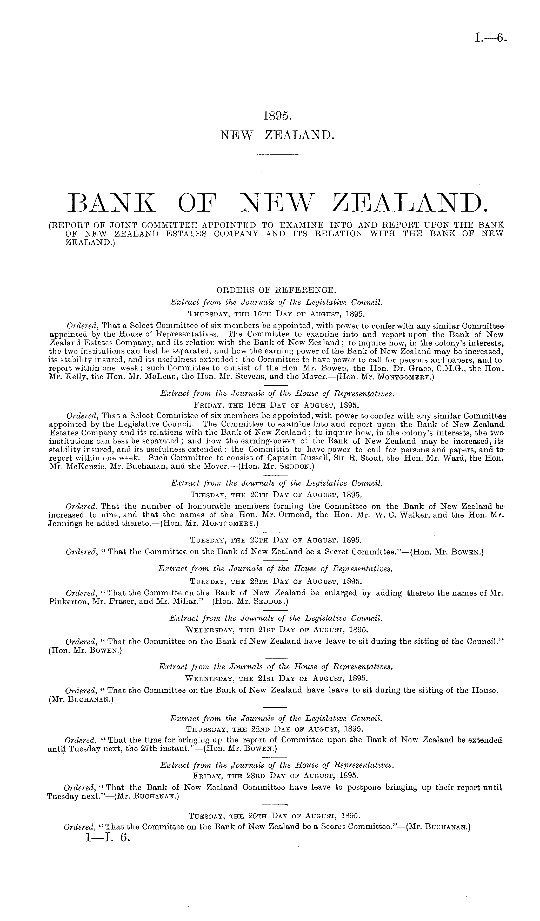 Extract from the Journals of the Legislative Council. Tuesday, the 20th Day of August, 1895. Ordered, That the number of honourable members forming the Committee on the Bank of New Zealand be increased to nine, and that the names of the Hon. Mr. Ormond, the Hon. Mr. W. C. Walker, and the Hon. Mr. Jennings be added thereto.—(Hon. Mr. Montgomery.) Tuesday, the 20th Day of August. 1895. Ordered, " That the Committee on the Bank of New Zealand be a Secret Committee." —(Hon. Mr. Bowen.) Extract from the Journals of the House of Representatives. Tuesday, the 28th Day of August, 1895. Ordered, " That the Committe on the Bank of New Zealand be enlarged by adding thereto the names of Mr. Pinkerton, Mr. Eraser, and Mr. Millar."—(Hon. Mr. Seddon.) Extract from the Journals of the Legislative Council. Wednesday, the 21st Day of August, 1895. Ordered, " That the Committee on the Bank of New Zealand have leave to sit during the sitting of the Council." (Hon. Mr. Bowen.)