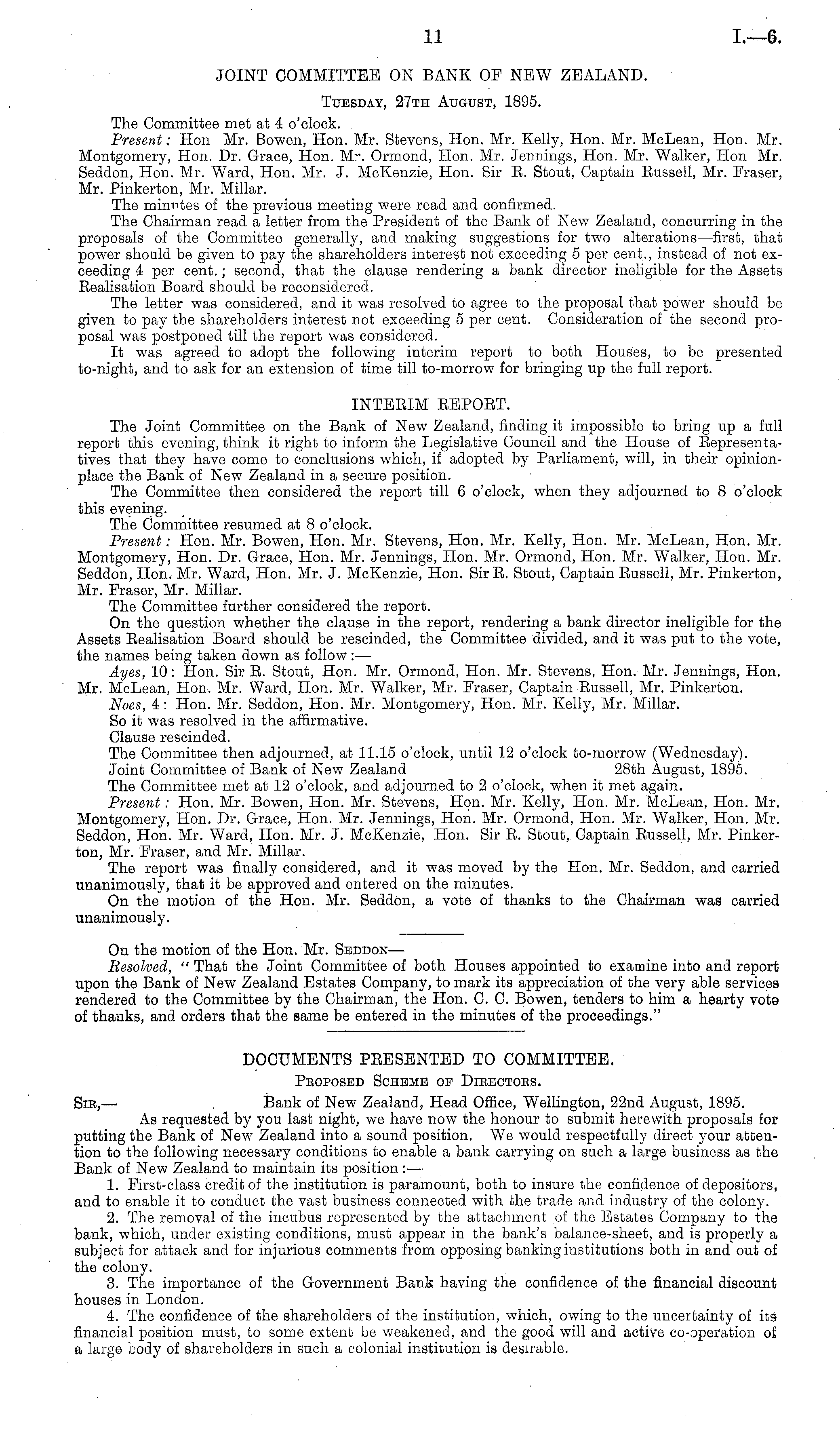 JOINT COMMITTEE ON BANK OF NEW ZEALAND. Tuesday, 27th August, 1895. The Committee met at 4 o'clock. Present: Hon Mr. Bowen, Hon. Mr. Stevens, Hon. Mr. Kelly, Hon. Mr. McLean, Hon. Mr. Montgomery, Hon. Dr. Grace, Hon. Mr. Ormond, Hon. Mr. Jennings, Hon. Mr. Walker, Hon Mr. Seddon, Hon. Mr. Ward, Hon. Mr. J. McKenzie, Hon. Sir E. Stout, Captain Eussell, Mr. Fraser, Mr. Pinkerton, Mr. Millar. The minutes of the previous meeting were read and confirmed. The Chairmaa read a letter from the President of the Bank of New Zealand, concurring in the proposals of the Committee generally, and making suggestions for two alterations—first, that power should be given to pay the shareholders interest not exceeding 5 per cent., instead, of not exceeding 4 per cent.; second, that the clause rendering a bank director ineligible for the Assets Eealisation Board should be reconsidered. The letter was considered, and it was resolved to agree to the proposal that power should be given to pay the shareholders interest not exceeding 5 per cent. Consideration of the second proposal was postponed till the report was considered. It was agreed to adopt the following interim report to both Houses, to be presented to-night, and to ask for an extension of time till to-morrow for bringing up the full report. INTEEIM EEPOET. The Joint Committee on the Bank of New Zealand, finding it impossible to bring up a full report this evening, think it right to inform the Legislative Council and the House of Eepresentatives that they have come to conclusions which, if adopted by Parliament, will, in their opinionplace the Bank of New Zealand in a secure position. The Committee then considered the report till 6 o'clock, when they adjourned to 8 o'clock this evening. The Committee resumed at 8 o'clock. Present: Hon. Mr. Bowen, Hon. Mr. Stevens, Hon. Mr. Kelly, Hon. Mr. McLean, Hon. Mr. Montgomery, Hon. Dr. Grace, Hon. Mr. Jennings, Hon. Mr. Ormond, Hon. Mr. Walker, Hon. Mr. Seddon, Hon. Mr. Ward, Hon. Mr. J. McKenzie, Hon. SirE. Stout, Captain Eussell, Mr. Pinkerton, Mr. Fraser, Mr. Millar. The Committee further considered the report. On the question whether the clause in the report, rendering a bank director ineligible for the Assets Eealisation Board should be rescinded, the Committee divided, and it was put to the vote, the names being taken down as follow : — Ayes, 10: Hon. Sir E. Stout, Hon. Mr. Ormond, Hon. Mr. Stevens, Hon. Mr. Jennings, Hon. Mr. McLean, Hon. Mr. Ward, Hon. Mr. Walker, Mr. Fraser, Captain Eussell, Mr. Pinkerton. Noes, 4: Hon. Mr. Seddon, Hon. Mr. Montgomery, Hon. Mr. Kelly, Mr. Millar. So it was resolved in the affirmative. Clause rescinded. The Committee then adjourned, at 11.15 o'clock, until 12 o'clock to-morrow (Wednesday). Joint Committee of Bank of New Zealand 28th August, 1895. The Committee met at 12 o'clock, and adjourned to 2 o'clock, when it met again. Present: Hon. Mr. Bowen, Hon. Mr. Stevens, Hon. Mr. Kelly, Hon. Mr. McLean, Hon. Mr. Montgomery, Hon. Dr. Grace, Hon. Mr. Jennings, Hon. Mr. Ormond, Hon. Mr. Walker, Hon. Mr. Seddon, Hon. Mr. Ward, Hon. Mr. J. McKenzie, Hon. Sir E. Stout, Captain Eussell, Mr. Pinkerton, Mr. Fraser, and Mr. Millar. The report was finally considered, and it was moved by the Hon. Mr. Seddon, and carried unanimously, that it be approved and entered on the minutes. On the motion of the Hon. Mr. Seddon, a vote of thanks to the Chairman was carried unanimously.