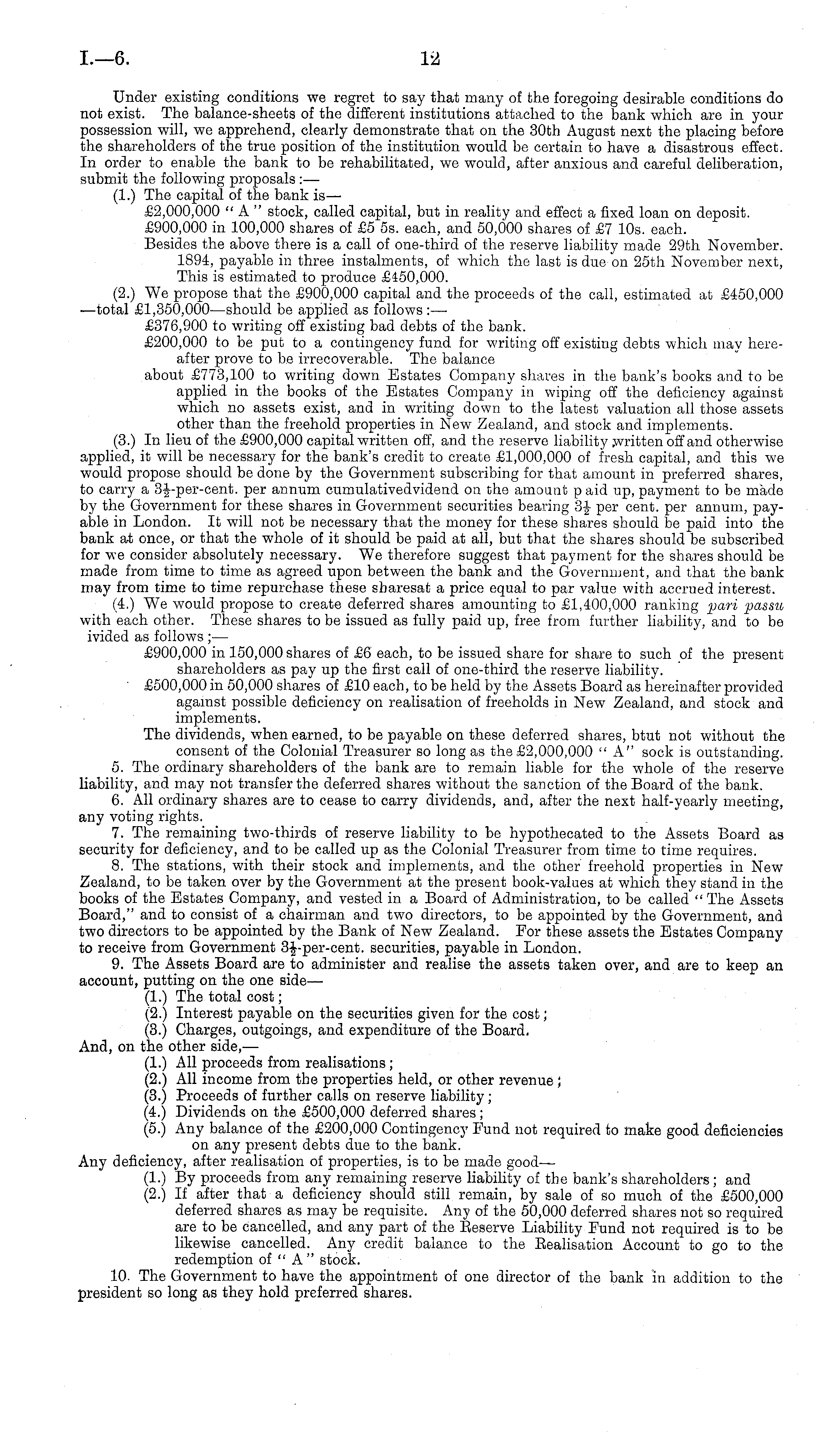 Under existing conditions we regret to say that many of the foregoing desirable conditions do not exist. The balance-sheets of the different institutions attached to the bank which are in your possession will, we apprehend, clearly demonstrate that on the 30th August next the placing before the shareholders of the true position of the institution would be certain to have a disastrous effect. In order to enable the bank to be rehabilitated, we would, after anxious and careful deliberation, submit the following proposals : —■ (1.) The capital of the bank is— £2,000,000 " A " stock, called capital, but in reality and effect a fixed loan on deposit. £900,000 in 100,000 shares of £5 ss. each, and 50,000 shares of £7 10s. each. Besides the above there is a call of one-third of the reserve liability made 29th November. 1894, payable in three instalments, of which the last is due on 25th November next, This is estimated to produce £450,000. (2.) We propose that the £900,000 capital and the proceeds of the call, estimated at £450,000 —total £1,350,000 —should be applied as follows :— £376,900 to writing off existing bad debts of the bank. £200,000 to be put to a contingency fund for writing off existing debts which may hereafter prove to be irrecoverable. The balance about £773,100 to writing down Estates Company shares in the bank's books and to be applied in the books of the Estates Company in wiping off the deficiency against which no assets exist, and in writing down to the latest valuation all those assets other than the freehold properties in New Zealand, and stock and implements. (3.) In lieu of the £900,000 capital written off, and the reserve liability written off and otherwise applied, it will be necessary for the bank's credit to create £1,000,000 of fresh capital, and this we would propose should be done by the Government subscribing for that amount in preferred shares, to carry a 3-J-per-cent. per annum cumulativedvidend on the amount paid up, payment to be made by the Government for these shares in Government securities bearing 3f per cent, per annum, payable in London. It will not be necessary that the money for these shares should be paid into the bank at once, or that the whole of it should be paid at all, but that the shares should be subscribed for -we consider absolutely necessary. We therefore suggest that payment for the shares should be made from time to time as agreed upon between the bank and the Government, and that the bank may from time to time repurchase these sharesat a price equal to par value with accrued interest. (4.) We would propose to create deferred shares amounting to £1,400,000 ranking pari passu with each other. These shares to be issued as fully paid up, free from further liability, and to be ivided as follows ; — £900,000 in 150,000 shares of £6 each, to be issued share for share to such of the present shareholders as pay up the first call of one-third the reserve liability. £500,000 in 50,000 shares of £10 each, to be held by the Assets Board as hereinafter provided against possible deficiency on realisation of freeholds in New Zealand, and stock and implements. The dividends, when earned, to be payable on these deferred shares, btut not without the consent of the Colonial Treasurer so long as the £2,000,000 " A , ' sock is outstanding. 5. The ordinary shareholders of the bank are to remain liable for the whole of the reserve liability, and may not transfer the deferred shares without the sanction of the Board of the bank. 6. All ordinary shares are to cease to carry dividends, and, after the next half-yearly meeting, any voting rights. 7. The remaining two-thirds of reserve liability to be hypothecated to the Assets Board as security for deficiency, and to be called up as the Colonial Treasurer from time to time requires. 8. The stations, with their stock and implements, and the other freehold properties in New Zealand, to be taken over by the Government at the present book-values at which they stand in the books of the Estates Company, and vested in a Board of Administration, to be called " The Assets Board," and to consist of a chairman and two directors, to be appointed by the Government, and two directors to be appointed by the Bank of New Zealand. For these assets the Estates Company to receive from Government 3-J-per-cent. securities, payable in London. 9. The Assets Board are to administer and realise the assets taken over, and are to keep an account, putting on the one side—■ (1.) The total cost; (2.) Interest payable on the securities given for the cost; (8.) Charges, outgoings, and expenditure of the Board. And, on the other side, — (1.) All proceeds from realisations; (2.) All income from the properties held, or other revenue; (3.) Proceeds of further calls on reserve liability; (4.) Dividends on the £500,000 deferred shares; (5.) Any balance of the £200,000 Contingency Eund not required to make good deficiencies on any present debts due to the bank. Any deficiency, after realisation of properties, is to be made good— (1.) By proceeds from any remaining reserve liability of the bank's shareholders; and (2.) If after that a deficiency should still remain, by sale of so much of the £500,000 deferred shares as may be requisite. Any of the 50,000 deferred shares not so required are to be cancelled, and any part of the Beserve Liability Fund not required is to be likewise cancelled. Any credit balance to the Eealisation Account to go to the redemption of " A" stock. 10. The Government to have the appointment of one director of the bank in addition to the president so long as they hold preferred shares.
