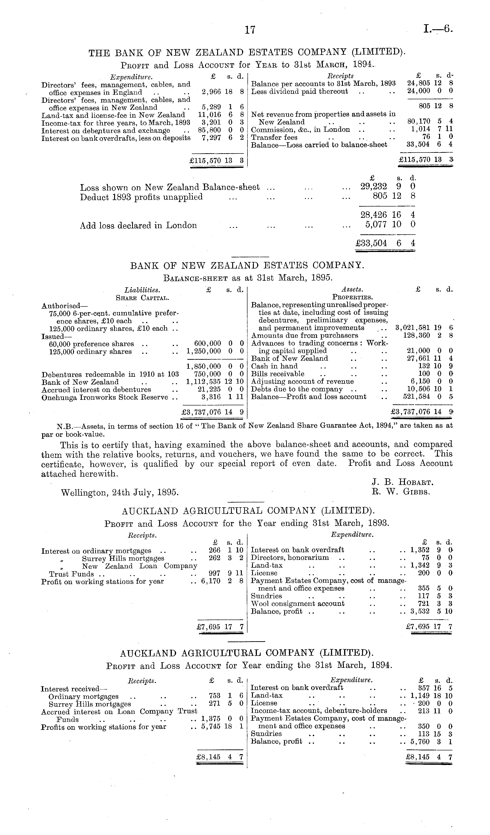 THE BANK OF NEW ZEALAND ESTATES COMPANY (LIMITED). Profit and Loss Account for Teak to 31st Mabch, 1894. Expenditure. £ s. d. Receipts £ _ s. dDirectors' fees, management, cables, and Balance per accounts to 31st March, 1893 24,805 12 8 office expenses in England .. .. 2,966 18 8 Less dividend paid thereout .. .. 24,000 0 0 Directors' fees, management, cables, and office expenses in New Zealand .. 5,289 1 6 805 12 8 Land-tax and license-fee in New Zealand 11,016 6 8 Net revenue from properties and assets in Income-tax for three years, to March, 1893 3,201 0 3 New Zealand .. .. .. 80,170 5 4 Interest on debentures and exchange .. 85,800 0 0 Commission, &c, in London .. .. 1,014 711 Interest on bank overdrafts, less on deposits 7,297 6 2 Transfer fees .. .. .. 76 1 0 Balance —Loss carried to balance-sheet 33 ,504 6 4 £115,570 13 3 £115,570 13 3- £ s. d. Loss shown on New Zealand Balance-sheet ... ... ... 29,232 9 0 Deduct 1893 profits unapplied ... ... ... ... 805 12 8 28,426 16 4 Add loss declared in London ... ... ... ... 5,077 10 0 £33,504 6 Jt BANK OF NEW ZEALAND ESTATES COMPANY. Balance-sheet as at 31st March, 1895. Liabilities. £ s. d. Assets. £ s. d. Shake Capital. Properties. Authorised — Balance, representing unrealised proper - 75,000 (i-per-cent. cumulative prefer- ties at date, including cost of issuing ence shares, £10 each .. .. debentures, preliminary expenses, 125,000 ordinary shares, £10 each .. and permanent improvements ... 3,021,581 19 6Issued Amounts due from purchasers .. 128,360 2 8 60,000 preference shares .. .. 600,000 0 0 Advances to trading concerns : Work--125 000 ordinary shares .. .. 1,250,000 0 0 ing capital supplied .. .. 21,000 0 0 Bank of New Zealand .. .. 27,66111 4 1,850,000 0 0 Cash in hand .. .. .. 132 10 9 Debentures redeemable in 1910 at 103 750,000 0 0 Bills receivable .. .. .. 100 0 0 Bank of New Zealand .. .. 1,112,535 12 10 Adjusting account of revenue .. 6,150 0 0 Accrued interest on debentures .. 21,225 0 0 Debts due to the company .. .. 10,506 10 1 Onehunga Ironworks Stock Reserve .. 3,316 111 Balance—Profit and loss account .. 521,584 0 5 £3,737,076 14 9 £8,737,076 14 & N.B. Assets, in terms of section 16 of " The Bank of New Zealand Share Guarantee Act, 1894," are taken as at par or book-value. This is to certify that, having examined the above balance-sheet and accounts, and compared them with the relative books, returns, and vouchers, we have found the same to be correct. This certificate, however, is qualified by our special report of even date. Profit and Loss Account attached herewith. J. B. Hobaet. Wellington, 24th July, 1895. E. W. Gibbs. AUCKLAND AGBICULTTJBAL COMPANY (LIMITED). PiiOPiT and Loss Account for the Year ending 31st March, 1893. Receipts. Expenditure. £ s. d. £ s. d. Interest on ordinary mortgages .. .. 266 110 Interest on bank overdraft .. .. 1, 352 9 0 Surrey Hills mortgages .. 262 3 2 Directors, honorarium .. .. .. 75 0 0 New Zealand Loan Company Land-tax .. .. .. .. 1,342 9 3 Trust Funds .. .. .. 997 9 11 License .. .. .. 200 0 0 Profit on working stations for year ..6,170 2 8 Payment Estates Company, cost of management and office expenses .. .. 355 5 0 Sundries .. .. .. 117 5 3 Wool consignment account .. .. 721 3 3 Balance, profit .. .. .. .. 3,532 5 10 £7,695 17 7 £7,695 17 7 AUCKLAND AGEICULTUEAL COMPANY (LIMITED). Peopit and Loss Account for Year ending the 31st March, 1894. Receipts. £ s. d. Expenditure. £ s. d. Interest received — Interest on bank overdraft .. .. 357 16 5 Ordinary mortgages .. .. .. 753 1 6 I Land-tax .. .. .. .. 1,149 18 10 Surrey Hills mortgages .. .. 271 5 0 License .. .. .. .. 200 0 0 Accrued interest on Loan Company Trust Income-tax account, debenture-holders .. 213 11 0Funds .. .. •• •• 1,375 0 0 Payment Estates Company, cost of manageProfits on working stations for year .. 5,745 18 1 ment and office expenses .. .. 350 0 0 Sundries .. .. .. 113 15 3 Balance, profit .. .. .. .. 5,760 3 1 £8,145 4 7 £8,145 4 7