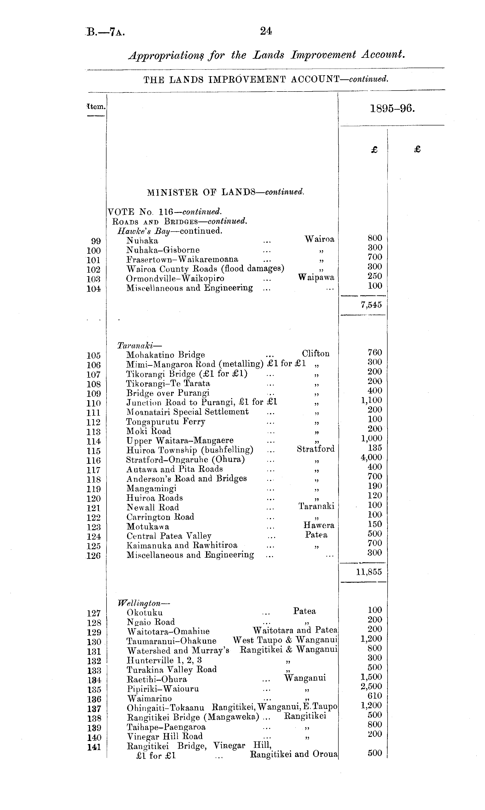 Item. 1895-96. MINISTER OF LANDS— continued. 99 100 101 102 103 104 VOTE No. 116— continued. Roads and Bridges— continued. Hawke's Bay —continued. Nuhaka " ... Wairoa Nuhaka-Gisborne ... „ Frasertown-Waikaremoana ... „ Wairoa County Roads (flood damages) _ „ Ormondville-Waikopiro ... Waipawa Miscellaneous and Engineering ... 800 300 700 300 250 100 7,545 105 106 107 108 109 110 111 112 113 114 115 116 117 118 119 120 121 122 123 124 125 126 Taranaki — Mohakatino Bridge ... Clifton Mimi-Mangaroa Road (metalling) £1 for £1 „ Tikorangi Bridge (£1 for £1) ... „ Tikorangi-Te Tarata ... „ Bridge over Purangi .. „ Junction Road to Purangi, £1 for £1 „ Moanatairi Special Settlement ... „ Tongapurutu Ferry ... „ Moki Road ... » Upper Waitara-Mangaere ... „ Huiroa Township (bushfelling) ... Stratford Stratford-Ongaruhe (Ohura) ... „ Autawa and Pita Roads ... „ Anderson's Road and Bridges ... „ Mangamingi ... „ Huiroa Roads ... „ Newall Road ... Taranaki Carrington Road ... „ Motukaua ... Hawera Central Patea Valley ... Patea Kaimanuka and Rawhitiroa ... „ Miscellaneous and Engineering 760 300 200 200 400 1,100 200 100 200 1,000 135 4,000 400 700 190 120 . 100 100 150 500 700 300 11,855 127 128 129 130 131 132 133 184 135 136 137 138 139 140 141 Wellington — Okotuku ... Patea Ngaio Road ... ;; Waitotara-Omahiite Waitotara and Patea Taumaranui-Ohakune West Taupo & Wanganui Watershed and Murray's Rangitikei & Wanganui Hunterville 1, 2, 3 „ Turakina Valley Road „ Raetihi-Ohura ... Wanganui Pipiriki-Waiouru ... „ Waimarino ... » Ohingaiti-Tokaanu Rangitikei,Wanganui, E.Taupo Rangitikei Bridge (Mangaweka) ... Rangitikei Taihape-Paengaroa ... » Vinegar Hill Road ... „ Rangitikei Bridge, Vinegar Hill, £1 for £1 ... Rangitikei and Oroua 100 200 200 1,200 800 300 500 1,500 2,500 610 1,200 500 800 200 500