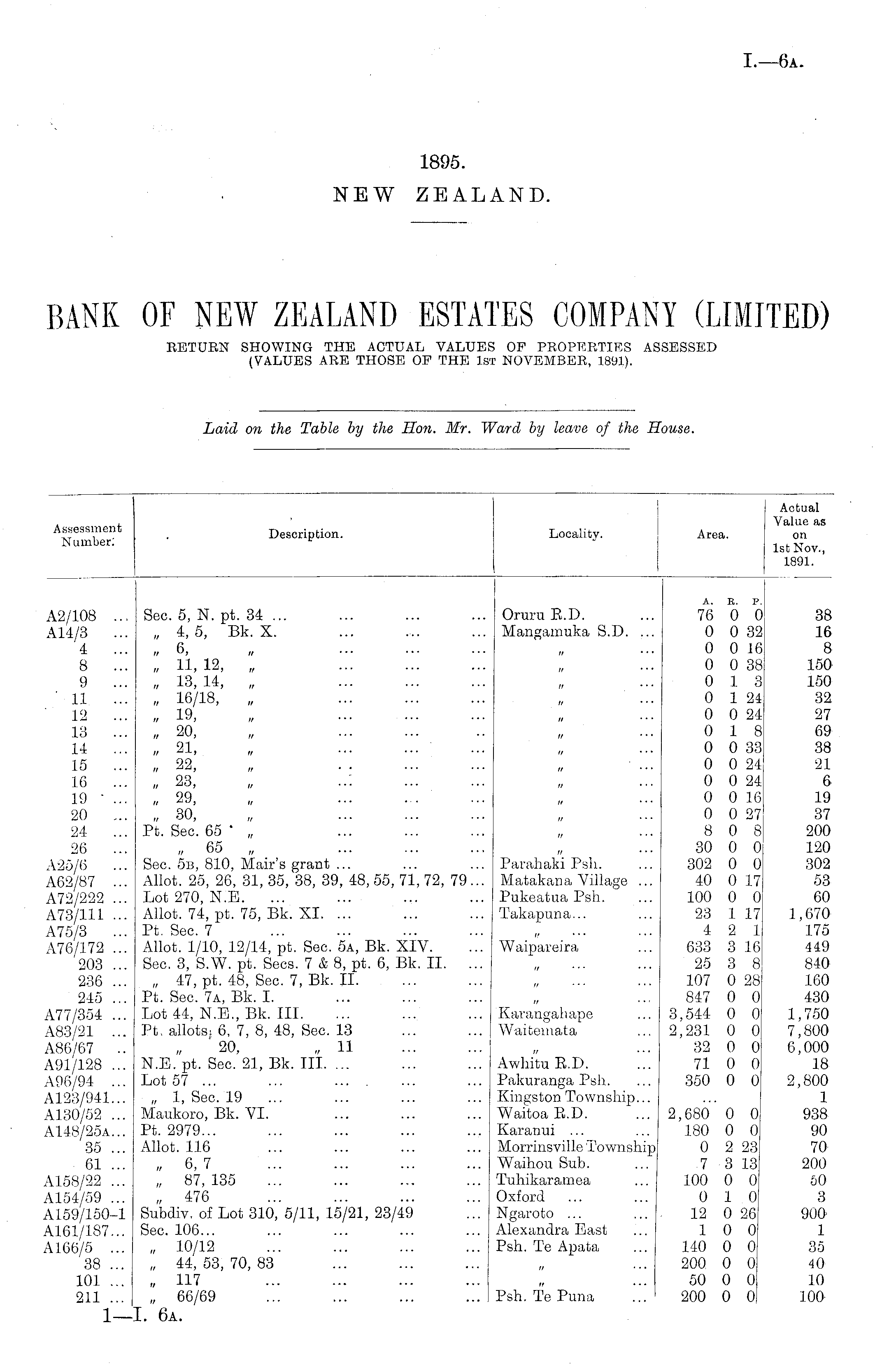 BANK OF NEW ZEALAND ESTATES COMPANY (LIMITED) RETURN SHOWING THE ACTUAL VALUES OF PROPERTIES ASSESSED (VALUES ARE THOSE OF THE 1st NOVEMBER, 1891).