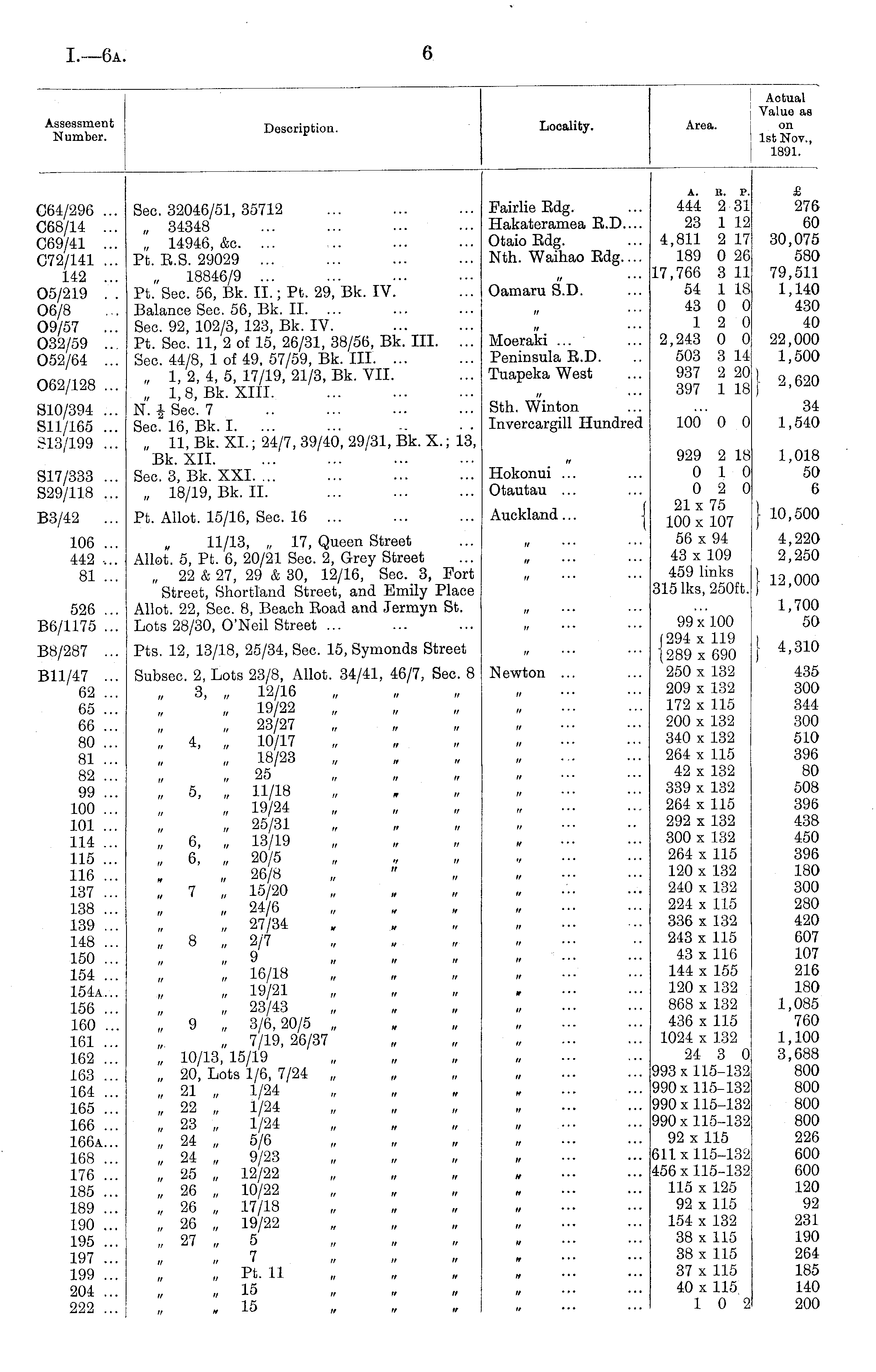 Assessment Number. Description. Locality. Area. Actual Value aa on 1st Nov., 1891. 064/296 ... C68/14 ... 069/41 ... C72/141 ... 142 ... 05/219 . . 06/8 09/57 ... 032/59 ... 052/64 ... Sec. 32046/51, 35712 „ 34348 „ 14946, &c. ... Pt. E.S. 29029 „ 18846/9 Pt. Sec. 56, Bk. II.; Pt. 29, Bk. IV. Balance Sec. 56, Bk. II. Sec. 92, 102/3, 123, Bk. IV. Pt. Sec. 11, 2 of 15, 26/31, 38/56, Bk. III. ... Sec. 44/8, 1 of 49, 57/59, Bk. III. ... „ 1, 2, 4, 5, 17/19, 21/3, Bk. VII. „ 1,8, Bk. XIII. N.J Sec. 7 Sec. 16, Bk. I. ... „ 11, Bk. XI.; 24/7, 39/40, 29/31, Bk. X.; 13, Bk. XII Sec. 3, Bk. XXI. ... „ 18/19, Bk. II. Pairlie Edg. Hakateramea E.D.... Otaio Edg. Nth. Waihao Edg.... ir Oamaru S.D. A. B. P. 444 2 31 23 1 12 4,811 2 17 189 0 26 17,766 3 11 54 1 18 43 0 0 12 0 2,243 0 0 503 3 14 937 2 20 397 1 18 £ 276 60 30,075 580 79,511 1,140 430 40 22,000 1,500 it Moeraki ... Peninsula E.D. Tuapeka West 062/128 ... ] 2,620 S10/394 ... Sll/165 ... S13/199 ... Sth. Winton Invercargill Hundred 100 0 0 34 1,540 S17/333 ... S29/118 ... B3/42 ... Pt. Allot. 15/16, Sec. 16 ... a Hokonui ... Otautau ... Auckland... 929 2 18 0 10 0 2 0 21 x 75 100 x 107 56x94 43 x 109 459 links 315 Iks, 250ft. 1,018 50 6 j 10,500 106 ... 442 ... 81 ... 11/13, „ 17, Queen Street Allot. 5, Pt. 6, 20/21 Sec. 2, Grey Street „ 22 & 27, 29 & 30, 12/16, Sec. 3, Fort Street, Shortland Street, and Emily Place Allot. 22, Sec. 8, Beach Eoad and Jermyn St. Lots 28/30, O'Neil Street ... ..." if • • • a ••• it ■ ■ • •■• 4,220 2,250 I 12,000 526 ... B6/1175 ... a • • • 99 x 100 (294 x 119 {289 x 690 250 x 132 209 x 132 172 x 115 200 x 132 340 x 132 264 x 115 42 x 132 339 x 132 264 x 115 292 x 132 300 x 132 264 x 115 120 x 132 240 x 132 224 x 115 336 x 132 243 x 115 43 x 116 144 x 155 120 x 132 868 x 132 436 x 115 1024 x 132 24 3 0 993 x115-132 990x115-132 990x115-132 990x115-132 92 x 115 611x115-132 456 x115-132 115 x 125 92 x 115 154 x 132 38 x 115 38 x 115 37 x 115 40 x 115 10 2 1,700 50 ir •" B8/287 ... Pts. 12, 13/18, 25/34, Sec. 15, Symonds Street J 4,310 Bll/47 ... 62 ... 65 ... 66 ... 80 ... 81 ... 82 ... 99 ... 100 ... 101 ... 114 ... 115 ... 116 ... 137 ... 138 ... 139 ... 148 ... 150 ... 154 ... 154a... 156 ... 160 ... 161 ... 162 ... 163 ... 164 ... 165 ... 166 ... 166a... 168 ... 176 ... 185 ... 189 ... 190 ... 195 ... 197 ... 199 ... 204 ... 222 ... Subsec. 2, Lots 23/8, Allot. 34/41, 46/7, Sec. 8 „ 3, „ 12/16 „ 19/22 „ 23/27 „ 4, „ 10/17 „ 18/23 „ „ 25 „ „ t, „ 5, „ 11/18 „ 19/24 „ 25/31 „ 6, „ 13/19 „ 6, „ 20/5 „ 26/8 „ 7 „ 15/20 . 24/6 „ 27/34 „ 8 „ 2/7 II II " >t " f „ 16/18 „ 19/21 „ 23/43 „ 9 „ 3/6,20/5 „ „ 7/19, 26/37 „ 10/13, 15/19 „ 20, Lots 1/6, 7/24 „ „ 21 „ 1/24 „ 22 „ 1/24 „ 23 „ 1/24 „ 24 „ 5/6 „ 24 „ 9/23 „ 25 „ 12/22 „ 26 „ 10/22 „ 26 „ 17/18 „ 26 „ 19/22 „ aI ti & tr it if „ „ 7 „ „ i, „ Pt. 11 „ 15 . 15 Newton ... „ ... ... if ■ ■ • • • • >/ ■ • • a • • • it •" a ' •' „ ... ... w • •' 435 300 344 300 510 396 80 508 396 438 450 396 180 300 280 420 607 107 216 180 1,085 760 1,100 3,688 800 800 800 800 226 600 600 120 92 231 190 264 185 140 200 If ' ' ' It • • • II ' " H ... ... It • " II * ' * * ' * ft " • It ■ - ' ' ' ■ „ ... ... It • " ' • • II ' ' • * ' *