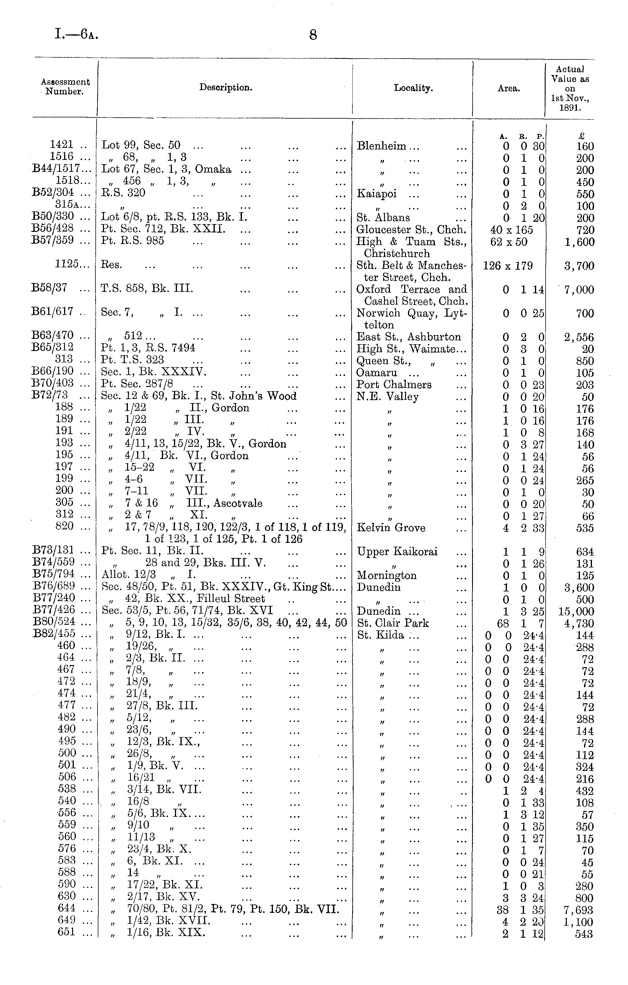 Actual Value as Assessment Number. Description. Locality. Area. on 1st Nov., 1891. 1421 .. 1516 ... B44/1517... 1518... B52/304 ... 315a... B50/330 ... B56/428 ... B57/359 ... Lot 99, Sec. 50 ... „ 68, „ 1,3 Lot 67, Sec. 1, 3, Omaka ... „ 456 „ 1, 3, „ E.S. 320 Blenheim... „ ... ... Kaiapoi ... A. B. p. 0 0 30 0 10 0 10 0 10 0 10 0 2 0 0 1 20 40 x 165 62x50 £ 160 200 200 450 550 100 200 720 1,600 1125... B58/37 ... B61/617 .. Lot 6/8, pt. E.S. 133, Bk. I. Pt. Sec. 712, Bk. XXII. ... Pt. E.S. 985 Ees. T.S. 858, Bk. III. Sec. 7, „ I. ... >/ • ■ • St. Albans Gloucester St., Chch. High & Tuam Sts., Christchurch 8th. Belt & Manchester Street, Chch. Oxford Terrace and Cashel Street, Chch. Norwich Quay, Lyfctelton East St., Ashburton High St., Waimate... Queen St., „ Oamaru ... Port Chalmers N.B. Valley 126 x 179 0 1 14 0 0 25 3,700 7,000 700 B63/470 ... B65/312 313 B66/190 ... B70/403 ... B72/73 ... 188 ... 189 ... 191 ... 193 ... 195 ... 197 ... 199 ... 200 ... 305 ... 312 ... 820 ... B73/131 ... B74/559 ... B75/794 ... B76/689 ... B77/240 ... B77/426 ... B80/524 ... B82/455 ... 460 ... 464 ... 467 ... 472 ... 474 ... 477 ... 482 ... 490 ... 495 ... 500 ... 501 ... 506 ... 538 ... 540 ... 556 ... 559 ... 560 ... 576 ... 583 ... 588 ... 590 ... 630 ... 644 ... 649 ... 651 ... „ 512... Pt. 1,3, E.S. 7494 Pt. T.S. 323 Sec. 1, Bk. XXXIV. Pt. Sec. 287/8 Sec. 12 & 69, Bk. I., St. John's Wood „ 1/22 „ II., Gordon „ 1/22 „ III. „ 2/22 „ IV. „ 4/11, 13, 15/22, Bk. V., Gordon „ 4/11, Bk. VI., Gordon „ 15-22 „ VI. „ „ 4-6 „ VII. „ „ 7-11 „ VII. „ „ 7 & 16 „ III., Ascot vale „ 2&7 „ XI. „ „ 17, 78/9, 118,120, 122/3, 1 of 118,1 of 119, 1 of 123, 1 of 125, Pt. 1 of 126 Pt. Sec. 11, Bk. II. 28 and 29, Bks. III. V Allot. 12/3 „ I. Sec. 48/50, Pt. 51, Bk. XXXIV., Gt. King St.... „ 42, Bk. XX., Filleul Street Sec. 53/5, Pt. 56, 71/74, Bk. XVI ... „ 5, 9, 10, 13, 15/32, 35/6, 38, 40, 42, 44, 50 „ 9/12, Bk. I „ 19/26, „ „ 2/3, Bk. II. ... „ 7/8 „ 18/9, „ 21/4, "„ 27/8, Bk. III." '.'.'. '.'.'. „ 5/12, „ „ 23/6, „ ... „ 12/3, Bk. IX., „ 26/8, „ „ 1/9, Bk. V. ... „ 16/21 „ „ 3/14, Bk. VII. „ 16/8 „ 5/6, Bk. IX. ... „ 9/10 „ 11/13 „ „ 23/4, Bk. X. „ 6, Bk. XI. ... „ 14 „ „ 17/22, Bk. XL „ 2/17, Bk. XV. „ 70/80, Pt. 81/2, Pt. 79, Pt. 150, Bk. VII. „ 1/42, Bk. XVII. „ 1/16, Bk. XIX. if • • • if it • • • it n it ■ ■ • „ ... ii Kelvin Grove Upper Kaikorai // • • • Mornington Dunedin Danedin ... St. Clair Park St. Kilda ... 0 2 0 0 3 0 0 10 0 10 0 0 23 0 0 20 1 0 16 1 0 16 10 8 0 3 27 0 1 24 0 1 24 0 0 24 0 10 0 0 20 0 1 27 4 2 33 119 0 1 26 0 10 10 0 0 10 1 3 25 68 1 7 0 0 24-4 0 0 24-4 0 0 24-4 0 0 24-4 0 0 24-4 0 0 24'4 0 0 24-4 0 0 24-4 0 0 24-4 0 0 24-4 0 0 24-4 0 0 24-4 0 0 24-4 12 4 0 1 33 1 3 12 0 1 35 0 1 27 0 17 0 0 24 0 0 21 10 3 3 3 24 38 1 35 4 2 20 2 1 12 2,556 20 850 105 203 50 176 176 168 140 56 56 265 30 50 66 535 634 131 125 3,600 500 15,000 4,730 144 288 72 72 72 144 72 288 144 72 112 324 216 432 108 57 350 115 70 45 55 280 800 7,693 1,100 543 lf ... ... ,/ ... ... t f ... ... , f ... ... tf ... ... a • • • it ■ ■. ... „ ... ... tt • • • - • • it ... ... a • • • • • • a ... ... // ... ... a • • • it ... ... it ... ...