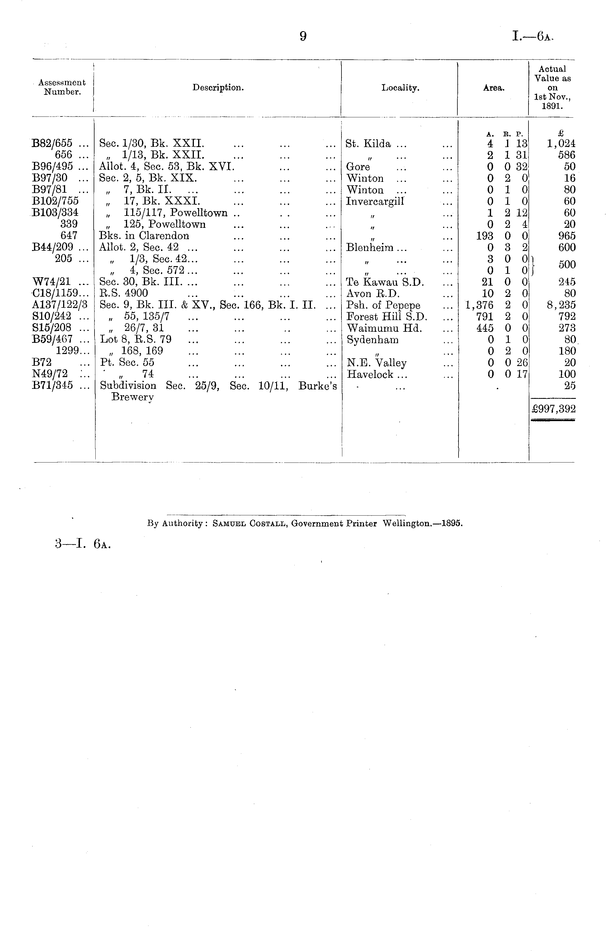 Actual Value as Assessment Number. Description. Locality. Area. on 1st Nov., 1891. B82/655 ... 656 ... B96/495 ... B97/30 ... B97/81 ... B102/755 B103/334 339 647 B44/209 ... 205 ... W74/21 ... C18/1159... A137/122/3 S10/242 ... S15/208 ... B59/4fi7 ... 1299... Soc. 1/30, Bk. XXII. „ 1/13, Bk. XXII. Allot. 4, Sec. 53, Bk. XVI. Sec. 2, 5, Bk. XIX. „ 7, Bk. II „ 17, Bk. XXXI. „ 115/117, Powelltown .. „ 125, Powelltown Bks. in Clarendon Allot. 2, Sec. 42 ... „ 1/3, Sec. 42... „ 4, Sec. 572... Sec. 30, Bk. III. ... E.S. 4900 Sec. 9, Bk. III. & XV., See. 166, Bk. I. II. ... „ 55,135/7 „ 26/7,31 Lot 8, E.S. 79 ... „ 168, 169 Pt. Sec. 55 ' „ 74 Subdivision Sec. 25/9, Sec. 10/11, Burke's Brewery St. Kilda ... Gore Winton ... Winton Invercargill '/ Blenheim ... Te Kawau S.D. Avon E.D. Psh. of Pepepe Forest Hill S.D. Waimumu Hd. Sydenham A. B. P. 4 J 13 2 1 31 0 0 32 0 2 0 0 10 0 10 1 2 12 0 2 4 193 0 0 0 3 2 3 0 0 0 10 21 0 0 10 2 0 1,376 2 0 791 2 0 445 0 0 0 10 0 2 0 0 0 26 0 0 17 1 £ 1,024 586 50 16 80 60 60 20 965 600 500 245 80 8,235 792 273 80 180 20 100 25 B72 N49/72 ... B71/345 ... N.E. Valley Havelock ... £997,392