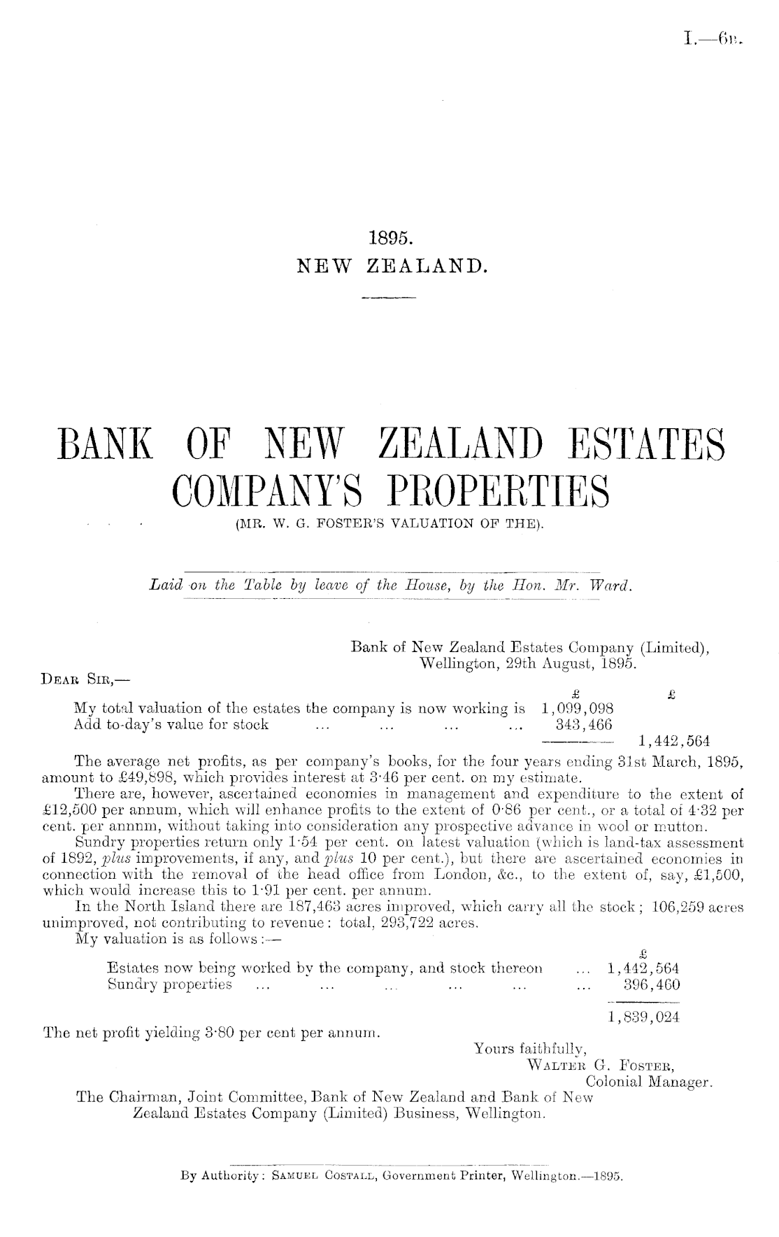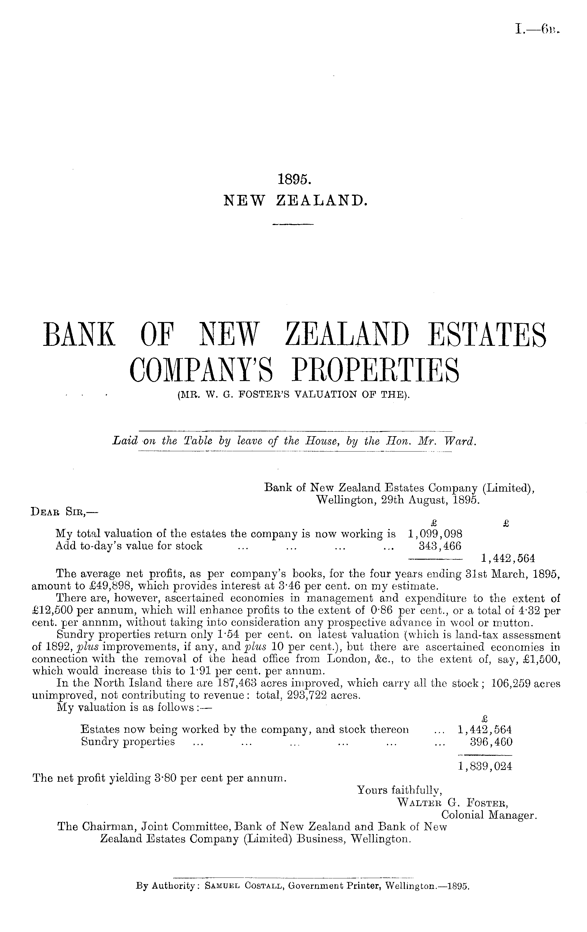 BANK OF NEW ZEALAND ESTATES COMPANY'S PROPERTIES (MR. W.G. FOSTER'S VALUATION OF THE).