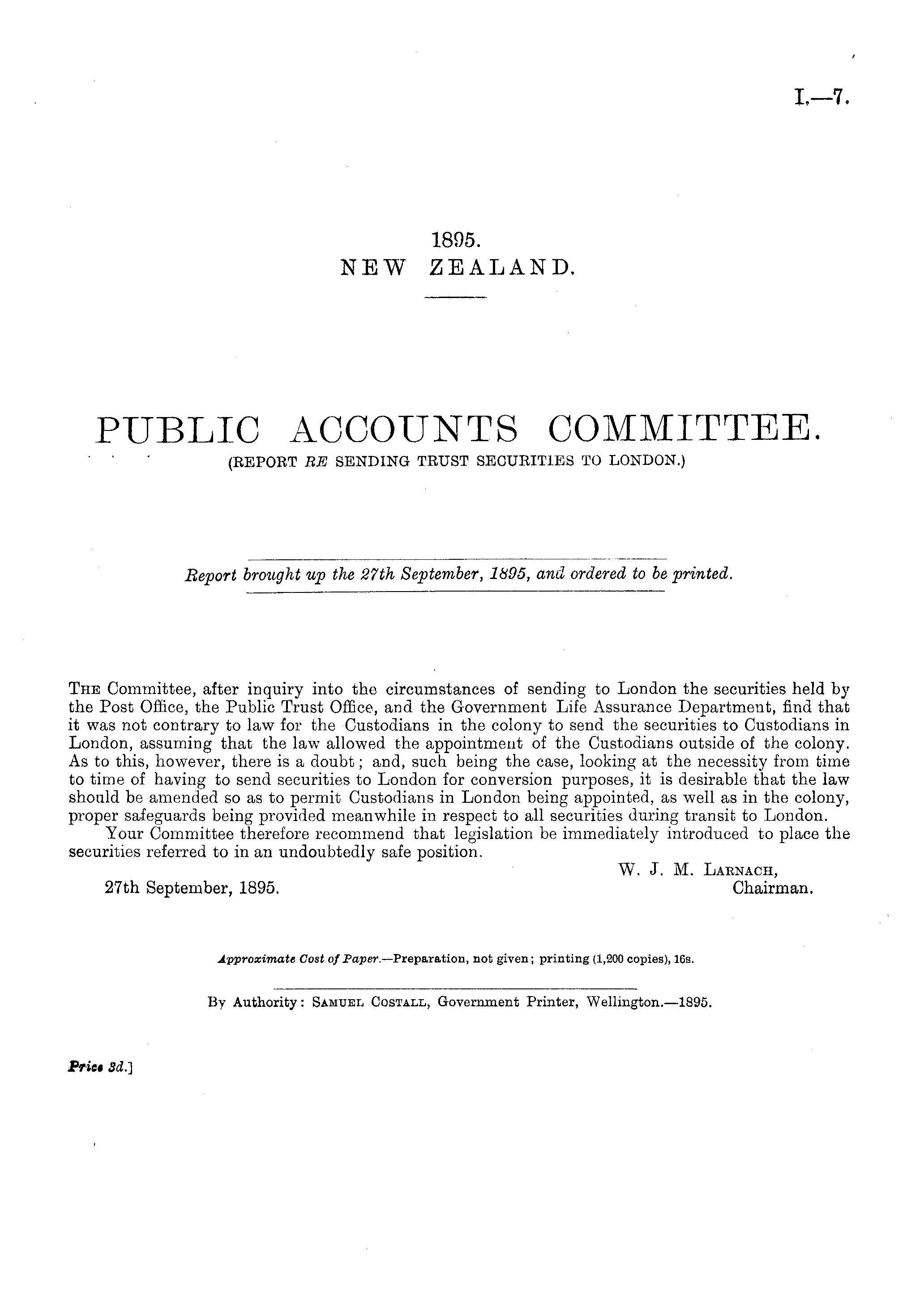 The Committee, after inquiry into the circumstances of sending to London the securities held by the Post Office, the Public Trust Office, and the Government Life Assurance Department, find that it was not contrary to law for the Custodians in the colony to send the securities to Custodians in London, assuming that the law allowed the appointment of the Custodians outside of the colony. As to this, however, there is a doubt; and, such being the case, looking at the necessity from time to time of having to send securities to London for conversion purposes, it is desirable that the law should be amended so as to permit Custodians in London being appointed, as well as in the colony, proper safeguards being provided meanwhile in respect to all securities during transit to London. Your Committee therefore recommend that legislation be immediately introduced to place the securities referred to in an undoubtedly safe position. W. J. M. Laenach, 27th September, 1895. Chairman. Approximate Cost of Paper.— Preparation, not given; printing (1,200 copies), 16s. By Authority: Samuel Costall, Government Printer, Wellington.—lB9s. Prict 3d.]