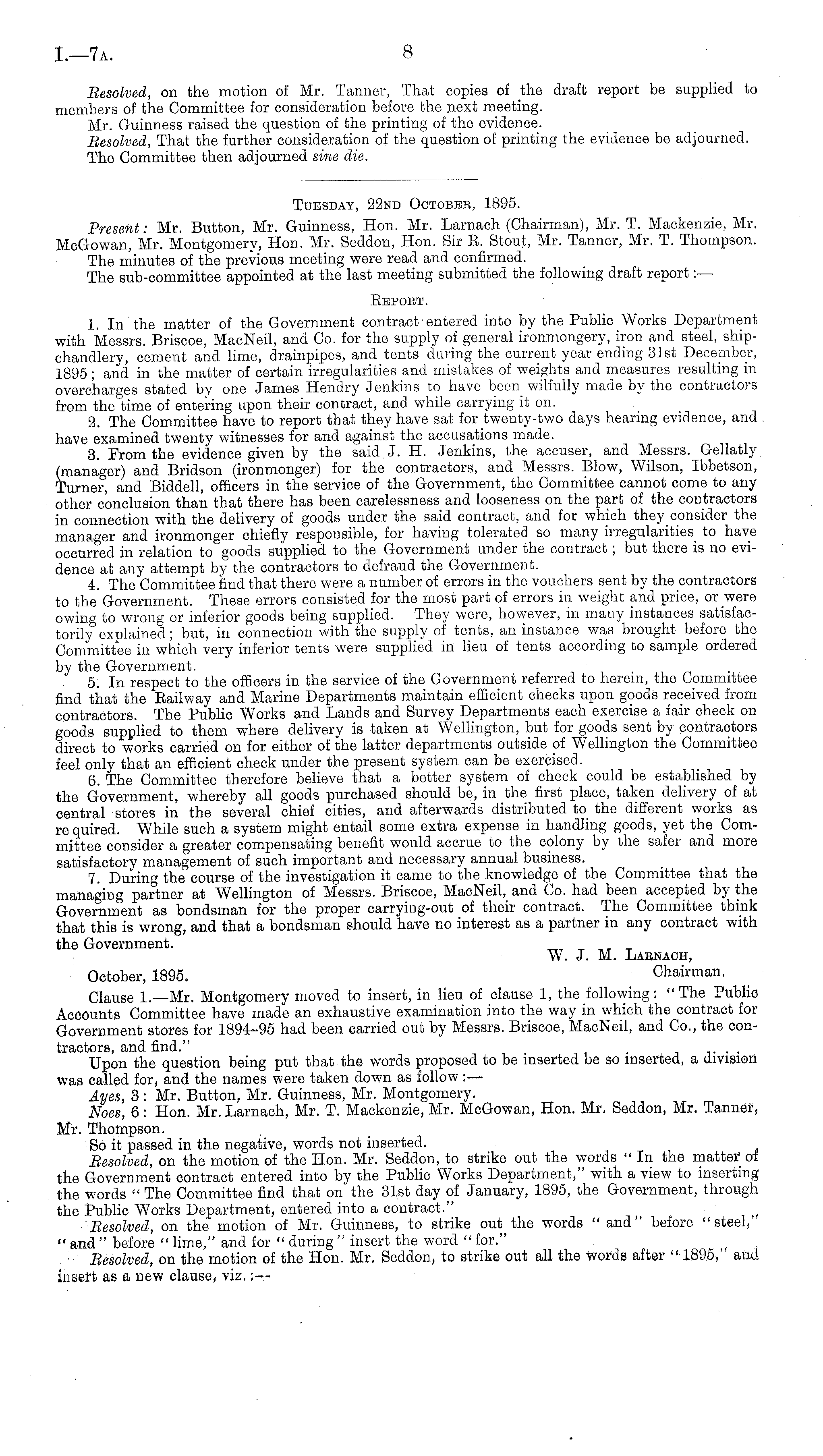 Tuesday, 22nd October, 1895. Present: Mr. Button, Mr. Guinness, Hon. Mr. Larnach (Chairman), Mr. T. Mackenzie, Mr. McGowan, Mr. Montgomery, Hon. Mr. Seddon, Hon. Sir E. Stout, Mr. Tanner, Mr. T. Thompson. The minutes of the previous meeting were read and confirmed. The sub-committee appointed at the last meeting submitted the following draft report :■— Beport. 1. In the matter of the Government contract entered into by the Public Works Department with Messrs. Briscoe, MacNeil, and Co. for the supply of general ironmongery, iron and steel, shipchandlery, cement and lime, drainpipes, and tents during the current year ending 31st December, 1895 ; and in the matter of certain irregularities and mistakes of weights and measures resulting in overcharges stated by one James Hendry Jenkins to have been wilfully made by the contractors from the time of entering upon their contract, and while carrying it on. 2. The Committee have to report that they have sat for twenty-two days hearing evidence, and have examined twenty witnesses for and against the accusations made. 3. From the evidence given by the said J. H. Jenkins, the accuser, and Messrs. Gellatly (manager) and Bridson (ironmonger) for the contractors, and Messrs. Blow, Wilson, Ibbetson, Turner, and Biddell, officers in the service of the Government, the Committee cannot come to any other conclusion than that there has been carelessness and looseness on the part of the contractors in connection with the delivery of goods under the said contract, and for which they consider the manager and ironmonger chiefly responsible, for having tolerated so many to have occurred in relation to goods supplied to the Government under the contract ; but there is no evidence at any attempt by the contractors to defraud the Government. 4. The Committee find that there were a number of errors in the vouchers sent by the contractors to the Government. These errors consisted for the most part of errors in weight and price, or were owing to wrong or inferior goods being supplied. They were, however, in many instances satisfactorily explained; but, in connection with the supply of tents, an instance was brought before the Committee in which very inferior tents were supplied in lieu of tents according to sample ordered by the Government. 5. In respect to the officers in the service of the Government referred to herein, the Committee find that the Eailway and Marine Departments maintain efficient checks upon goods received from contractors. The Public Works and Lands and Survey Departments each exercise a fair check on goods supplied to them where delivery is taken at Wellington, but for goods sent by contractors direct to works carried on for either of the latter departments outside of Wellington the Committee feel only that an efficient check under the present system can be exercised. 6. The Committee therefore believe that a better system of check could be established by the Government, whereby all goods purchased should be, in the first place, taken delivery of at central stores in the several chief cities, and afterwards distributed to the different works as re quired. While such a system might entail some extra expense in handling goods, yet the Committee consider a greater compensating benefit would accrue to the colony by the safer and more satisfactory management of such important and necessary annual business. 7. During the course of the investigation it came to the knowledge of the Committee that the managing partner at Wellington of Messrs. Briscoe, MacNeil, and Co. had been accepted by the Government as bondsman for the proper carrying-out of their contract. The Committee think that this is wrong, and that a bondsman should have no interest as a partner in any contract with the Government. W. J. M. Laenach, October, 1895. Chairman. Clause I.—Mr. Montgomery moved to insert, in lieu of clause 1, the following: "The Public Accounts Committee have made an exhaustive examination into the way in which the contract for Government stores for 1894-95 had been carried out by Messrs. Briscoe, MacNeil, and Co., the contractors, and find." . . . Upon the question being put that the words proposed to be inserted be so inserted, a division was called for, and the names were taken down as follow : —■ Ayes, 3: Mr. Button, Mr. Guinness, Mr. Montgomery. Noes, 6: Hon. Mr. Larnach, Mr. T. Mackenzie, Mr. McGowan, Hon. Mr. Seddon, Mr. Tanner, Mr. Thompson. So it passed in the negative, words not inserted. Resolved, on the motion of the Hon. Mr. Seddon, to strike out the words " In the matter of the Government contract entered into by the Public Works Department," with a view to inserting the words " The Committee find that on the 31, st day of January, 1895, the Government, through the Public Works Department, entered into a contract." ( Resolved, on the motion of Mr. Guinness, to strike out the words " and" before "steel, " and " before " lime," and for " during " insert the word " for." Resolved, on the motion of the Hon. Mr. Seddon, to strike out all the words after " 1895," and insert as a new clause, viz.;—