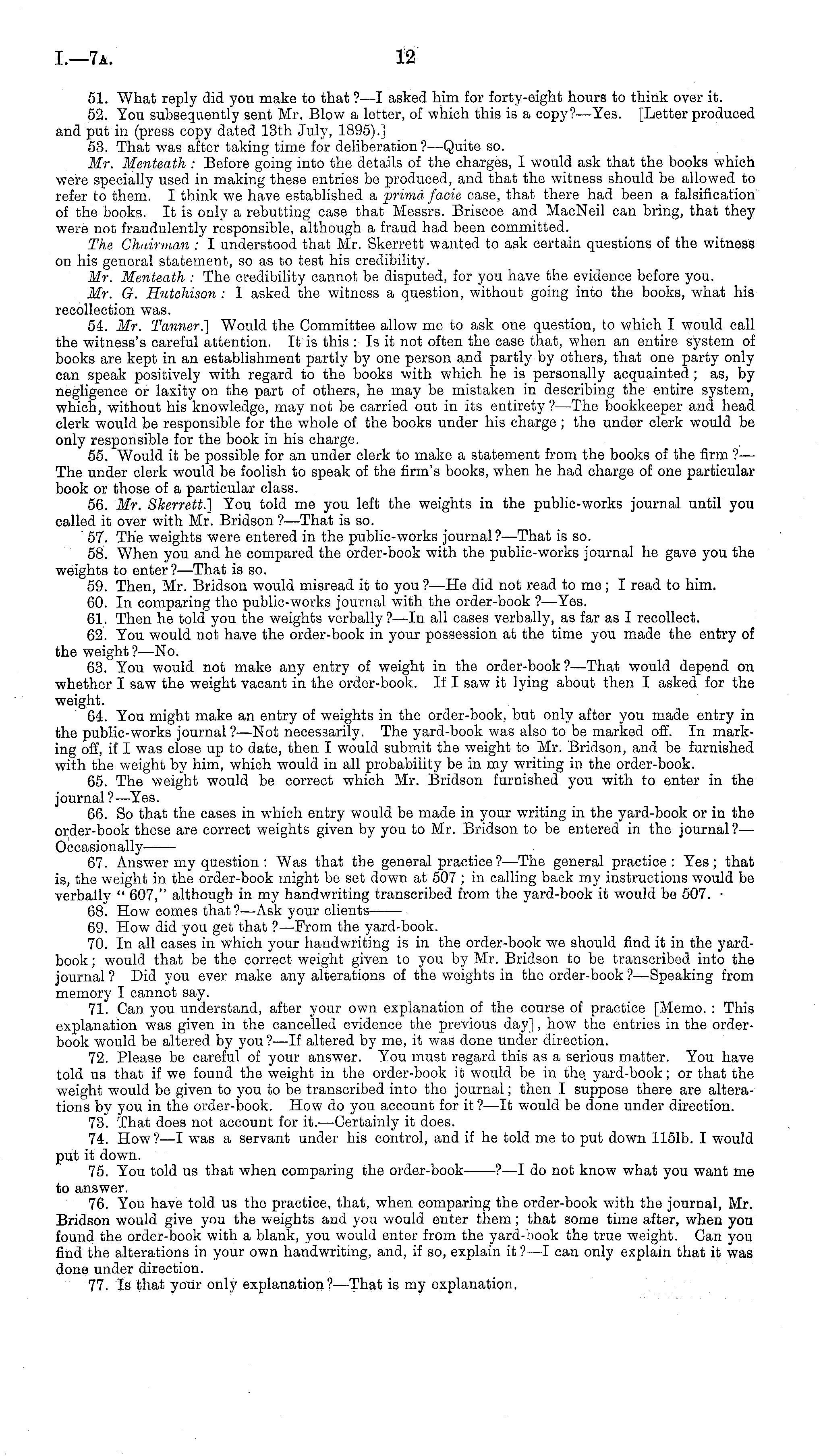 51. What reply did you make to that ?—I asked him for forty-eight hours to think over it. 52. You subsequently sent Mr. Blow a letter, of which this is a copy? —Yes. [Letter produced and put in (press copy dated 13th July, 1895).] 53. That was after taking time for deliberation? —Quite so. Mr. Menteath : Before going into the details of the charges, I would ask that the books which were specially used in making these entries be produced, and that the witness should be allowed to refer to them. I think we have established a prima facie case, that there had been a falsification of the books. It is only a rebutting case that Messrs. Briscoe and MacNeil can bring, that they were not fraudulently responsible, although a fraud had been committed. The Chairman : I understood that Mr. Skerrett wanted to ask certain questions of the witness on his general statement, so as to test his credibility. Mr. Menteath : The credibility cannot be disputed, for you have the evidence before you. Mr. G. Hutchison : I asked the witness a question, without going into the books, what his recollection was. 54. Mr. Tanner.] Would the Committee allow me to ask one question, to which I would call the witness's careful attention. It is this :Is it not often the case that, when an entire system of books are kept in an establishment partly by one person and partly by others, that one party only can speak positively with regard to the books with which he is personally acquainted; as, by negligence or laxity on the part of others, he may be mistaken in describing the entire system, which, without his knowledge, may not be carried out in its entirety ?—The bookkeeper and head clerk would be responsible for the whole of the books under his charge ; the under clerk would be only responsible for the book in his charge. 55. Would it be possible for an under clerk to make a statement from the books of the firm ? — The under clerk would be foolish to speak of the firm's books, when he had charge of one particular book or those of a particular class. 56. Mr. Skerrett.] You told me you left the weights in the public-works journal until you called it over with Mr. Bridson ?—That is so. '57. The weights were entered in the public-works journal?— That is so. 58. When you and he compared the order-book with the public-works journal he gave you the weights to enter? —That is so. 59. Then, Mr. Bridson would misread it to you ?—He did not read to me ; I read to him. 60. In comparing the public-works journal with the order-book ? —Yes. 61. Then he told you the weights verbally ?—ln all cases verbally, as far as I recollect. 62. You would not have the order-book in your possession at the time you made the entry of the weight ? —No. 63. You would not make any entry of weight in the order-book ?—That would depend on whether I saw the weight vacant in the order-book. If I saw it lying about then I asked for the weight. 64. You might make an entry of weights in the order-book, but only after you made entry in the public-works journal ?—Not necessarily. The yard-book was also to be marked off. In marking off, if I was close up to date, then I would submit the weight to Mr. Bridson, and be furnished with the weight by him, which would in all probability be in my writing in the order-book. 65. The weight would be correct which Mr. Bridson furnished you with to enter in the journal?— Yes. 66. So that the cases in which entry would be made in your writing in the yard-book or in the order-book these are correct weights given by you to Mr. Bridson to be entered in the journal?— Occasionally 67. Answer my question : Was that the general practice ?—The general practice: Yes; that is, the weight in the order-book might be set down at 507 ; in calling back my instructions would be verbally " 607," although in my handwriting transcribed from the yard-book it would be 507. ■ 68. How comes that ?—Ask your clients 69. How did you get that ?—From the yard-book. 70. In all cases in which your handwriting is in the order-book we should find it in the yardbook ; would that be the correct weight given to you by Mr. Bridson to be transcribed into the journal ? Did you ever make any alterations of the weights in the order-book ?—Speaking from memory I cannot say. 71. Can you understand, after your own explanation of the course of practice [Memo. : This explanation was given in the cancelled evidence the previous day], how the entries in the orderbook would be altered by you?—lf altered by me, it was done under direction. 72. Please be careful of your answer. You must regard this as a serious matter. You have told us that if we found the weight in the order-book it would be in the yard-book; or that the weight would be given to you to be transcribed into the journal; then I suppose there are alterations by you in the order-book. How do you account for it ?—lt would be done under direction. 73. That does not account for it.—Certainly it does. 74. How ? —I was a servant under his control, and if he told me to put down 1151b. I would put it down. 75. You told us that when comparing the order-book ?—I do not know what you want me to answer. 76. You have told us the practice, that, when comparing the order-book with the journal, Mr. Bridson would give you the weights and you would enter them; that some time after, when you found the order-book with a blank, you would enter from the yard-book the true weight. Can you find the alterations in your own handwriting, and, if so, explain it ? —I can only explain that it was done under direction. 77. Is that your only explanation? —That is my explanation.