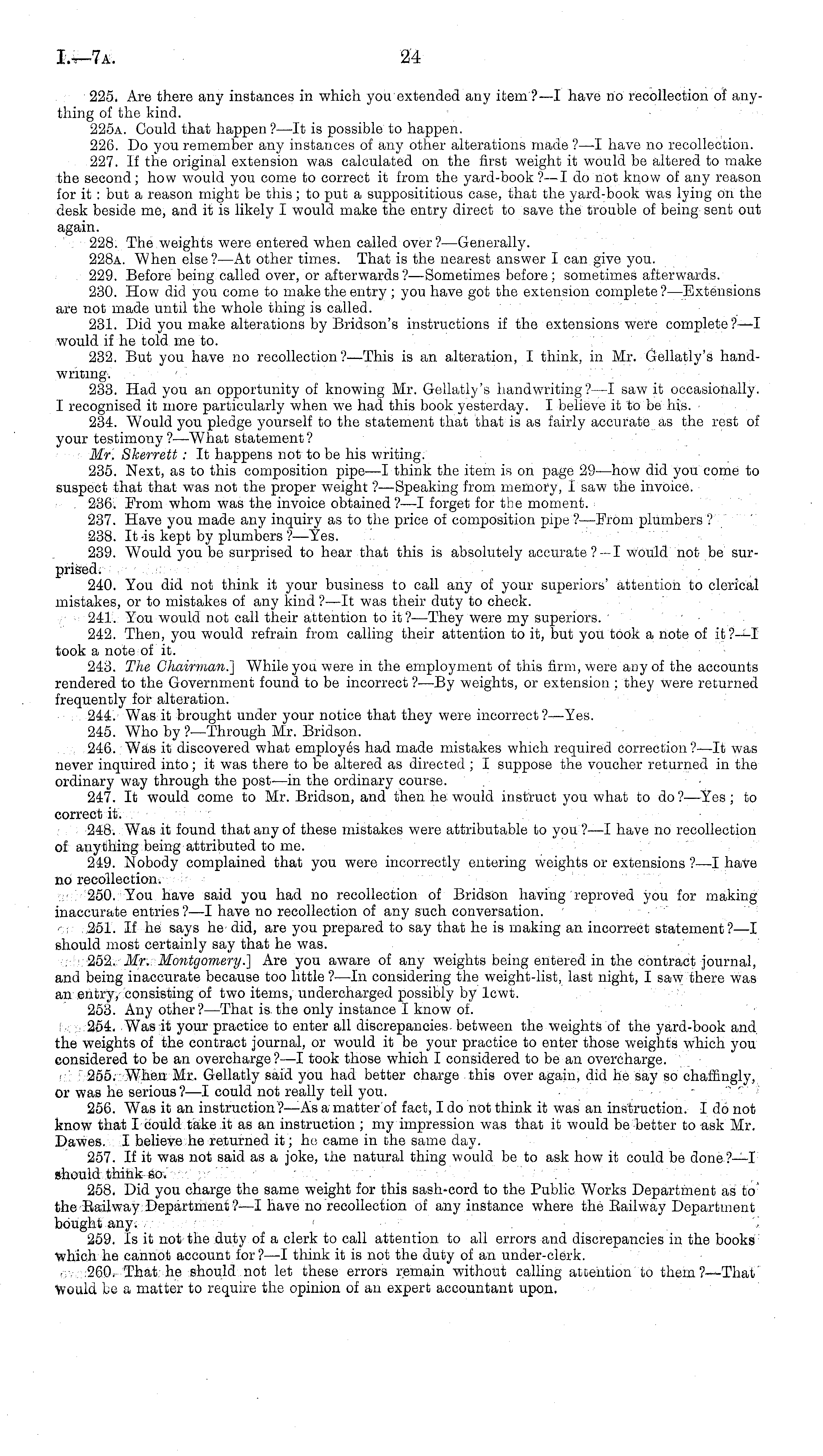 225. Are there any instances in which you extended any item ?—I have no recollection of anything of the kind. 225 a. Could that happen?—lt is possible to happen. 226. Do you remember any instances of any other alterations made ?—I have no recollection. 227. If the original extension was calculated on the first weight it would be altered to make the second; how would you come to correct it from the yard-book?—I do not know of any reason for it : but a reason might be this; to put a supposititious case, that the yard-book was lying on the desk beside me, and it is likely I would make the entry direct to save the trouble of being sent out again. 228. The weights were entered when called over? —Generally. 228 a. When else? —At other times. That is the nearest answer I can give you. 229. Before being called over, or afterwards?— Sometimes before; sometimes afterwards. 230. How did you come to make the entry ; you have got the extension complete ? —Extensions are not made until the whole thing is called. 231. Did you make alterations by Bridson's instructions if the extensions were complete? —I would if he told me to. 232. But you have no recollection?— This is an alteration, I think, in Mr. Gellatly's handwriting; 233. Had you an opportunity of knowing Mr. Gellatly's handwriting?—l saw it occasionally. I recognised it more particularly when we had this book yesterday. I believe it "to be his. 234. Would you pledge yourself to the statement that 'that is as fairly accurate as the rest of your testimony ?—What statement ? Mr. Skerrett : It happens not to be his writing. 235. Next, as to this composition pipe—l think the item is on page 29 —how did you come to suspect that that was not the proper weight ? —Speaking from memory, I saw the invoice. 236. From whom was the invoice obtained?—l forget for the moment. 237. Have you made any inquiry as to the price of composition pipe ?—From plumbers ? •238. It -is kept by plumbers ?—Yes. 239. Would you be surprised to hear that this is absolutely accurate? -I would not be surprised. : 240. You did not think it your business to call any of your superiors' attention to clerical mistakes, or to mistakes of any kind ?—lt was their duty to check. 241. You would not call their attention to it?— They were my superiors. 242. Then, you would refrain from calling their attention to it, but you took a note of it?- 1 -! took a note of it. 243. The Chairman.] While you were in the employment of this firm, were any of the accounts rendered to the Government found to be incorrect ?—By weights, or extension ; they were returned frequently for alteration. •■ . . 244. Was it brought under your notice that they were incorrect? —Yes. 245. Who by ?—Through Mr. Bridson. 246. Was it discovered what employes had made mistakes which required correction ?—lt was never inquired into; it was there to be altered as directed ; I suppose the voucher returned in the ordinary way through the post—in the ordinary course. 247. It would come to Mr. Bridson, and then he would instruct you what to do?— Yes; to correct it. 248. Was it found that any of these mistakes were attributable to you ? —I have no recollection of anything being attributed to me. 249. Nobody complained that you were incorrectly entering weights or extensions ? —I have no recollection. y ; 250. You have said you had no recollection of Bridson having reproved you for making inaccurate entries ?—I have no recollection of any such conversation. ci ,251. If he says he did, are you prepared to say that he is making an incorrect statement?—l should most certainly say that he was. i.j . :252..' Mr. Montgomery.] Are you aware of any weights being entered in the contract journal, and being inaccurate because too little ? —ln considering the weight-list, last night, I saw there was an entry, consisting of two items, undercharged possibly by lcwt. 253. Any other?— That is.the only instance I know of. I -/; ,254. Was it your practice to enter all discrepancies, between the weights of the yard-book and. the weights of the contract journal, or would it be your practice to enter those weights which you considered to be an overcharge?—l took those which I considered to be an overcharge. '■' : 255. When Mr. Gellatly said you had better charge this over again, did he say so chaffingly, or was he serious ? —I could not really tell you. ."";"'." 256. Was it an instruction? —-As a matter of fact, Ido not think it was an instruction. Ido not know that I could take it as an instruction ; my impression was that it would be better to ask Mr. Dawes. I believe he returned it; he came in the same day. 257. If it was not said as a joke, the natural thing would be to ask how it could be done?—l should think So.';-' 258. Did you charge the same weight for this sash-cord to the Public Works Department as to the Eailway Department ?—I have no recollection of any instance where the Eailway Department bought any. ", 259. Is it not the duty of a clerk to call attention to all errors and discrepancies in the books which he cannot account for ? —I think it is not the duty of an under-clerk. ,/.-. ,260. That, he should not let these errors remain without calling attention to them?— That' Would be a matter to require the opinion of an expert accountant upon.