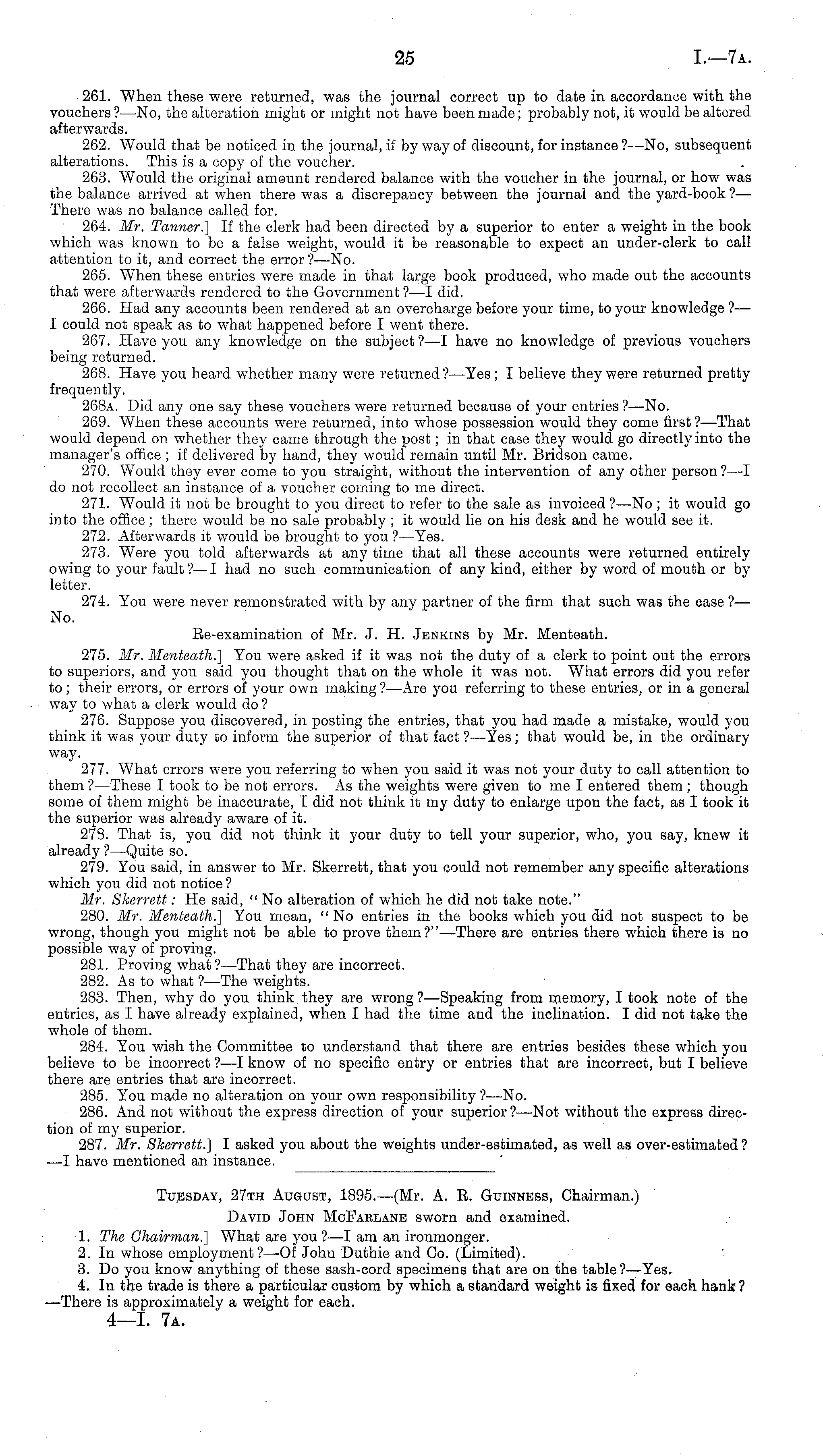 261. When these were returned, was the journal correct up to date in accordance with the vouchers ? —No, the alteration might or might not have been made; probably not, it would be altered afterwards. 262. Would that be noticed in the journal, if by way of discount, for instance ?—No, subsequent alterations. This is a copy of the voucher. 263. Would the original amount rendered balance with the voucher in the journal, or how was the balance arrived at when there was a discrepancy between the journal and the yard-book ?— There was no balance called for. 264. Mr. Tanner.] If the clerk had been directed by a superior to enter a weight in the book which was known to be a false weight, would it be reasonable to expect an under-clerk to call attention to it, and correct the error ?—No. 265. When these entries were made in that large book produced, who made out the accounts that were afterwards rendered to the Government?—l did. 266. Had any accounts been rendered at an overcharge before your time, to your knowledge ?— I could not speak as to what happened before I went there. 267. Have you any knowledge on the subject?—-I have no knowledge of previous vouchers being returned. 268. Have you heard whether many were returned?— Yes; I believe they were returned pretty frequently. 268 a. Did any one say these vouchers were returned because of your entries ? —No. 269. When these accounts were returned, into whose possession would they come first?— That would depend on whether they came through the post; in that case they would go directly into the manager's office ; if delivered by hand, they would remain until Mr. Bridson came. 270. Would they ever come to you straight, without the intervention of any other person? —I do not recollect an instance of a voucher coming to me direct. 271. Would it not be brought to you direct to refer to the sale as invoiced ?—No ; it would go into the office; there would be no sale probably ; it would lie on his desk and he would see it. 272. Afterwards it would be brought to you? —Yes. 273. Were you told afterwards at any time that all these accounts were returned entirely owing to your fault?—l had no such communication of any kind, either by word of mouth or by letter. 274. You were never remonstrated with by any partner of the firm that such was the case ? — No. Be-examination of Mr. J. H. Jenkins by Mr. Menteath. 275. Mr. Menteath.] You were asked if it was not the duty of a clerk to point out the errors to superiors, and you said you thought that on the whole it was not. What errors did you refer to; their errors, or errors of your own making ?—Are you referring to these entries, or in a general way to what a clerk would do ? 276. Suppose you discovered, in posting the entries, that you had made a mistake, would you think it was your duty to inform the superior of that fact ? —Yes; that would be, in the ordinary way. 277. What errors were you referring to when you said it was not your duty to call attention to them ?—These I took to be not errors. As the weights were given to me I entered them ; though some of them might be inaccurate, I did not think it my duty to enlarge upon the fact, as I took it the superior was already aware of it. 278. That is, you did not think it your duty to tell your superior, who, you say, knew it already ?—Quite so. 279. You said, in answer to Mr. Skerrett, that you could not remember any specific alterations which you did not notice ? Mr. Skerrett: He said, "No alteration of which he did not take note." 280. Mr. Menteath.] You mean, "No entries in the books which you did not suspect to be wrong, though you might not be able to prove them?"— There are entries there which there is no possible way of proving. 281. Proving what?— That they are incorrect. 282. As to what ?—The weights. 283. Then, why do you think they are wrong?— Speaking from memory, I took note of the entries, as I have already explained, when I had the time and the inclination. I did not take the whole of them. 284. You wish the Committee to understand that there are entries besides these which you believe to be incorrect ?—I know of no specific entry or entries that are incorrect, but I believe there are entries that are incorrect. 285. You made no alteration on your own responsibility?— No. 286. And not without the express direction of your superior?— Not without the express direction of my superior. 287. Mr. Skerrett.] I asked you about the weights under-estimated, as well as over-estimated? —I have mentioned an instance. Tuesday, 27th August, 1895.—(Mr. A. B. Guinness, Chairman.) David John McFarlane sworn and examined. 1. The Chairman.] What are you ?—I am an ironmonger. 2. In whose employment?—-Of John Duthie and Co. (Limited). 3. Do you know anything of these sash-cord specimens that are on the table?— Yes. 4. In the trade is there a particular custom by which a standard weight is fixed for each hank? —There is approximately a weight for each. 4—l. 7a.