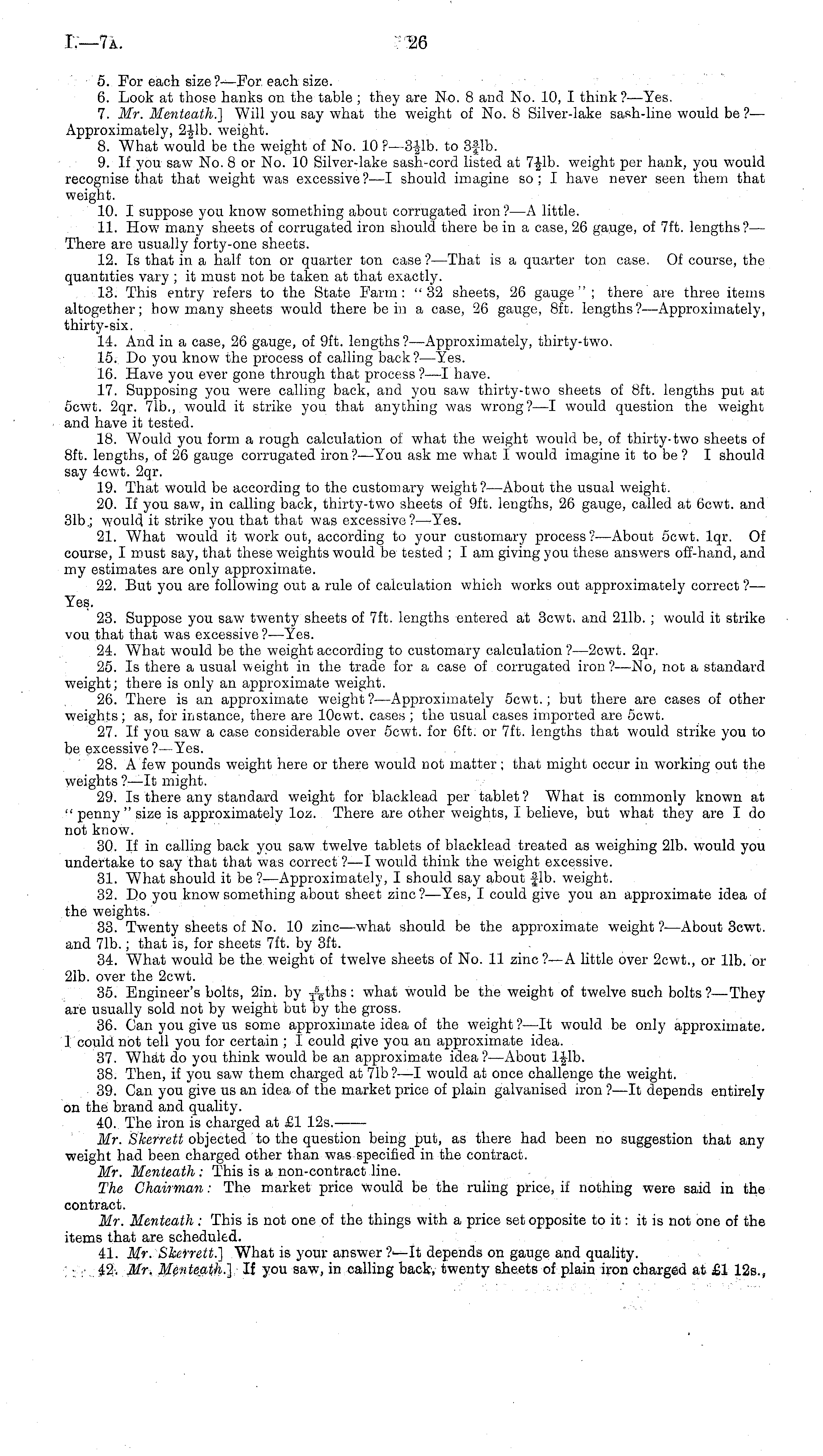 5. For each size?— For each size. 6. Look at those hanks on the table ; they are No. 8 and No. 10, I think? —Yes. 7. Mr. Menteath.] Will you say what the weight of No. 8 Silver-lake sash-line would be ?— Approximately, 2-Jlb. weight. 8. What would be the weight of No. 10 P—3pb. to 3flb. 9. If you saw No. 8 or No. 10 Silver-lake sash-cord listed at 7-Jlb. weight per hank, you would recognise that that weight was excessive ? —I should imagine so ; I have never seen them that weight. 10. I suppose you know something about corrugated iron? —A little. 11. How many sheets of corrugated iron should there be in a case, 26 gauge, of 7ft. lengths?— There are usually forty-one sheets. 12. Is that in a half ton or quarter ton case ?—That is a quarter ton case. Of course, the quantities vary ; it must not be taken at that exactly. 13. This entry refers to the State Farm: "32 sheets, 26 gauge"; there are three items altogether; how many sheets would there be in a case, 26 gauge, Bft. lengths?— Approximately, thirty-six. 14. And in a case, 26 gauge, of 9ft. lengths? —Approximately, thirty-two. 15. Do you know the process of calling back? —Yes. 16. Have you ever gone through that process ?—I have. 17. Supposing you were calling back, and you saw thirty-two sheets of Bft. lengths put at ocwt. 2qr. 71b., would it strike you that anything was wrong?—l would question the weight and have it tested. 18. Would you form a rough calculation of what the weight would be, of thirty-two sheets of Bft. lengths, of 26 gauge corrugated iron ? —You ask me what I would imagine it to be ? I should say 4cwt. 2qr. 19. That would be according to the customary weight?— About the usual weight. 20. If you saw, in calling back, thirty-two sheets of 9ft. lengths, 26 gauge, called at 6cwt. and 31b.; would it strike you that that was excessive?— Yes. 21. What would it work out, according to your customary process?— About scwt. lqr. Of course, I must say, that these weights would be tested ; I am giving you these answers off-hand, and my estimates are only approximate. 22. But you are following out a rule of calculation which works out approximately correct ?— Yes. 23. Suppose you saw twenty sheets of 7ft. lengths entered at 3cwt. and 211b. ; would it strike you that that was excessive ? —Yes. 24. What would be the weight according to customary calculation? —2cwt. 2qr. 25. Is there a usual weight in the trade for a case of corrugated iron ?—No, not a standard weight; there is only an approximate weight. 26. There is an approximate weight?— Approximately scwt.; but there are cases of other weights ; as, for instance, there are lOcwt. cases ; the usual cases imported are scwt. 27. If you saw a case considerable over scwt. for 6ft. or 7ft. lengths that would strike you to be excessive?— Yes. 28. A few pounds weight here or there would not matter; that might occur in working out the weights ?—lt might. 29. Is there any standard weight for blacklead per tablet ? What is commonly known at " penny " size is approximately loz. There are other weights, I believe, but what they are I do not know. 30. If in calling back you saw twelve tablets of blacklead treated as weighing 21b. would you undertake to say that that was correct ?—I would think the weight excessive. 31. What should it be ?—Approximately, I should say about fib. weight. 32. Do you know something about sheet zinc?— Yes, I could give you an approximate idea of the weights. 33. Twenty sheets of No. 10 zinc—what should be the approximate weight ?—About 3cwt. and 71b.; that is, for sheets 7ft. by 3ft. 34. What would be the weight of twelve sheets of No. 11 zinc?—A little over 2cwt., or lib. or 21b. over the 2cwt. 35. Engineer's bolts, 2in. by T %ths: what would be the weight of twelve such bolts?— They are usually sold not by weight but by the gross. 36. Can you give us some approximate idea of the weight ?—lt would be only approximate. 1. could not tell you for certain ; I could give you an approximate idea. 37. What do you think would be an approximate idea?— About I^-lb. 38. Then, if you saw them charged at 71b ?—I would at once challenge the weight. 39. Can you give us an idea of the market price of plain galvanised iron ?—lt depends entirely on the brand and quality. 40. The iron is charged at £1 12s. Mr. Skerrett objected to the question being put, as there had been no suggestion that any weight had been charged other than was specified in the contract. Mr. Menteath : This is a non-contract line. The Chairman: The market price would be the ruling price, if nothing were said in the contract. Mr. Menteath : This is not one of the things with a price set opposite to it: it is not one of the items that are scheduled. 41. Mr. Skerrett.] What is your answer ?—lt depends on gauge and quality. ■; ■_ ; -„-, i% Mr. Mente_ath.] If you saw, in calling back, twenty sheets of plain iron charged at £1 125.,