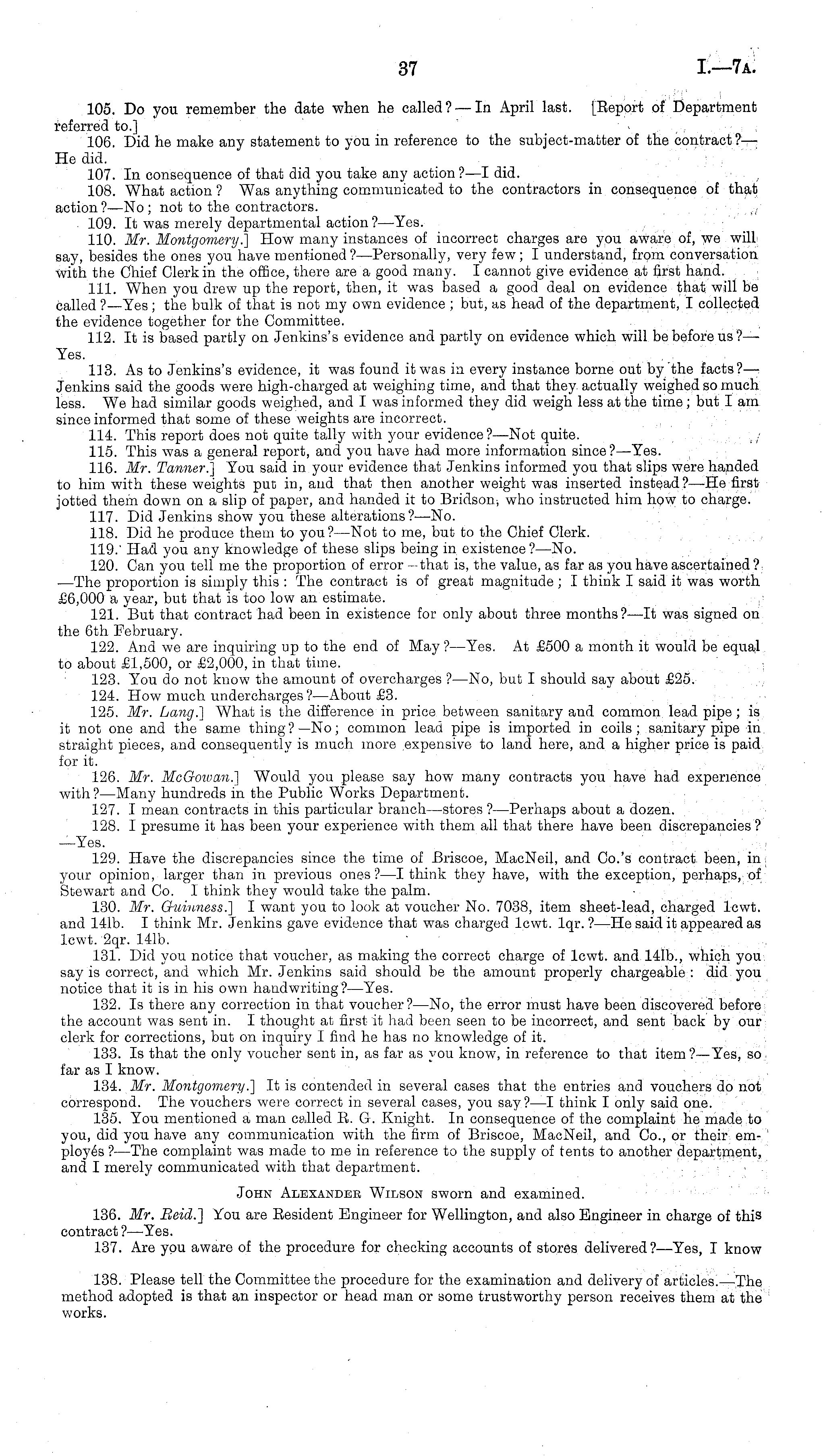 105. Do you remember the date when he called? —In April last. [Beport of Department referred to.] - , ; 106. Did he make any statement to you in reference to the subject-matter of the contract ?—■ He did. j.;. 107. In consequence of that did you take any action ?—I did. 108. What action ? Was anything communicated to the contractors in consequence of that action?—No ; not to the contractors. 109. It was merely departmental action ? —Yes. 110. Mr. Montgomery.] How many instances of incorrect charges are you aware of, we will say, besides the ones you have mentioned ?—Personally, very few ; I understand, from conversation with the Chief Clerk in the office, there are a good many. I cannot give evidence at first hand. 111. When you drew up the report, then, it was based a good deal on evidence that will be called ?—Yes ; the bulk of that is not my own evidence ; but, as head of the department, I collected the evidence together for the Committee. 112. It is based partly on Jenkins's evidence and partly on evidence which will be before us?— Yes. 113. As to Jenkins's evidence, it was found it was in every instance borne out by "the facts?—■ Jenkins said the goods were high-charged at weighing time, and that they actually weighed so much less. We had similar goods weighed, and I was informed they did weigh less at the time ; but lam since informed that some of these weights are incorrect. 114. This report does not quite tally with your evidence ?—Not quite. , , / 115. This was a general report, and you have had more information since ?—Yes. 116. Mr. Tanner?] You said in your evidence that Jenkins informed you that slips were handed to him with these weights put in, and that then another weight was inserted instead?—He first jotted them down on a slip of paper, and handed it to Bridson, who instructed him how to charge. 117. Did Jenkins show you these alterations?— No. 118. Did he produce them to you? —Not to me, but to the Chief Clerk. 119.' Had you any knowledge of these slips being in existence ?—No. 120. Can you tell me the proportion of error - that is, the value, as far as you have ascertained ? —The proportion is simply this : The contract is of great magnitude ; I think I said it was worth £6,000 a year, but that is too low an estimate. 121. But that contract had been in existence for only about three months? —It was signed on the 6th February. 122. And we are inquiring up to the end of May ? —Yes. At £500 a month it would be equal to about £1,500, or £2,000, in that time. 123. You do not know the amount of overcharges ?—No, but I should say about £25. 124. How much undercharges?— About £3. 125. Mr. Lang.] What is the difference in price between sanitary and common lead pipe ; is it not one and the same, thing?—No; common lead pipe is imported in coils; sanitary pipe in straight pieces, and consequently is much more expensive to land here, and a higher price is paid for it. 126. Mr. McGoiuan.] Would you please say how many contracts you have had experience with? —Many hundreds in the Public Works Department. 127. I mean contracts in this particular branch—stores ? —Perhaps about a dozen. 128. I presume it has been your experience with them all that there have been discrepancies ? —Yes. 129. Have the discrepancies since the time of Briscoe, MacNeil, and Co.'s contract been, in your opinion, larger than in previous ones? —I think they have, with the exception, perhaps, of Stewart and Co. I think they would take the palm. 130. Mr. Guinness.] I want you to look at voucher No. 7038, item sheet-lead, charged lcwt. and 141b. I think Mr. Jenkins gave evidence that was charged lcwt. lqr.? —He said it appeared as lcwt. 2qr. 141b. 131. Did you notice that voucher, as making the correct charge of lcwt. and 141b., which you say is correct, and which Mr. Jenkins said should be the amount properly chargeable : did you notice that it is in his own handwriting?— Yes. 132. Is there any correction in that voucher?—No, the error must have been discovered before the account was sent in. I thought at first it had been seen to be incorrect, and sent back by our clerk for corrections, but on inquiry I find he has no knowledge of it. 133. Is that the only voucher sent in, as far as you know, in reference to that item?— Yes, so far as I know. 134. Mr. Montgomery.] It is contended in several cases that the entries and vouchers do not correspond. The vouchers were correct in several cases, you say?—l think I only said one. 135. You mentioned a man called E. G. Knight. In consequence of the complaint he made to you, did you have any communication with the firm of Briscoe, MacNeil, and Co., or their employes ? —The complaint was made to me in reference to the supply of tents to another department, and I merely communicated with that department. John Alexander Wilson sworn and examined. 136. Mr. Reid.] You are Eesident Engineer for Wellington, and also Engineer in charge of this contract ? —Yes. 137. Are you aware of the procedure for checking accounts of stores delivered?— Yes, I know 138. Please tell the Committee the procedure for the examination and delivery of articles.—The method adopted is that an inspector or head man or some trustworthy person receives them at the works.