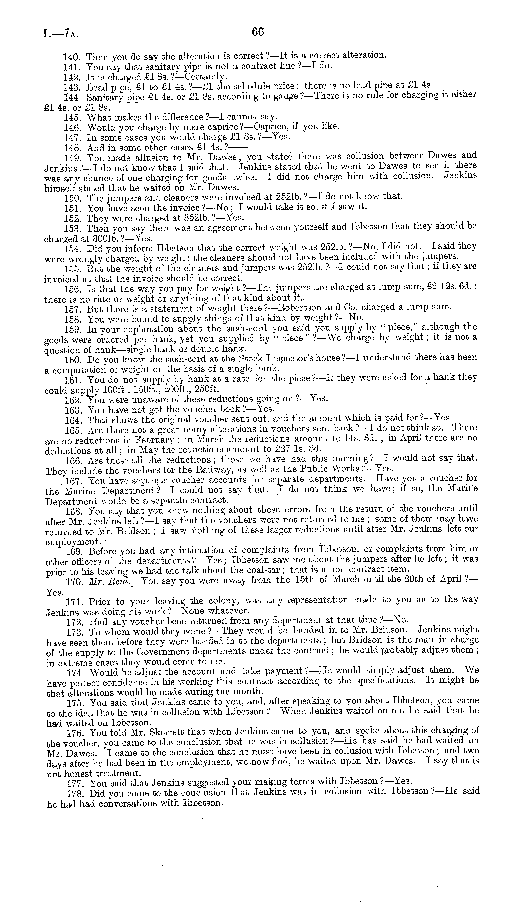 140. Then you do say the alteration is correct ?—lt is a correct alteration. 141. You say that sanitary pipe is not a contract line ? —I do. 142. It is charged £1 Bs. ?—Certainly. 143. Lead pipe, £1 to £1 4s. ?—£l the schedule price ; there is no lead pipe at £1 4s. 144. Sanitary pipe £1 4s. or £1 Bs. according to gauge?— There is no rule for charging it either £1 4s. or £1 Bs. 145. What makes the difference ?—I cannot say. 146. Would you charge by mere caprice? —Caprice, if you like. 147. In some cases you would charge £1 Bs. ?—Yes. 148. And in some other cases £1 4s. ? 149. You made allusion to Mr. Dawes; you stated there was collusion between Dawes and Jenkins?—l do not know that I said that. Jenkins stated that he went to Dawes to see if there was any chance of one charging for goods twice. I did not charge him with collusion. Jenkins himself stated that he waited on Mr. Dawes. 150. The jumpers and cleaners were invoiced at 2521b.?—1 do not know that. 151. You have seen the invoice?—No; I would take it so, if I saw it. 152. They were charged at 3521b. ?—Yes. 153. Then you say there was an agreement between yourself and Ibbetson that they should be charged at 3001b. ?—Yes. . 154. Did you inform Ibbetson that the correct weight was 2521b. ?—No, I did not.. I said they were wrongly charged by weight; the cleaners should not have been included with the jumpers. 155. But the weight of the cleaners and junipers was 2521b. ?—I could not say that; if they are invoiced at that the invoice should be correct. 156. Is that the way you pay for weight ?—The jumpers are charged at lump sum, £2 12s. 6d.; there is no rate or weight or anything of that kind about it.. 157. But there is a statement of weight there ?—Eobertson and Co. charged a lump sum. 158. You were bound to supply things of that kind by weight ?—No. . 159. In your explanation about the sash-cord you said you supply by " piece," although the goods were ordered per hank, yet you supplied by " piece" ?—We charge by weight; it is not a question of hank —single hank or double hank. 160. Do you know the sash-cord at the Stock Inspector's house?—l understand there has been a computation of weight on the basis of a single hank. 161 You do not supply by hank at a rate for the piece ?—lf they were asked for a hank they could supply 100 ft., 150 ft., 200 ft., 250 ft. 162. You were unaware of these reductions going on ?—Yes. 163. You have not got the voucher book? —Yes. 164. That shows the original voucher sent out, and the amount which is paid for ?—Yes.^ 165. Are there not a great many alterations in vouchers sent back? —I do not think so. There are no reductions in February ; in March the reductions amount to 14s. 3d. ; in April there are no deductions at all; in May the reductions amount to £27 Is. Bd. 166. Are these all the reductions; those we have had this morning?-—I would not say that. They include the vouchers for the Eailway, as well as the Public Works?— Yes. 167. You have separate voucher accounts for separate departments. Have you a voucher for the Marine Department?—l could not say that. I do not think we have; if so, the Marine Department would be a separate contract. 168. You say that you knew nothing about these errors from the return of the vouchers until after Mr. Jenkins left ?—I say that the vouchers were not returned to me ; some of them may have returned to Mr. Bridson ; I saw nothing of these larger reductions until after Mr. Jenkins left our employment. 169. Before you had any intimation of complaints from Ibbetson, or complaints from him or other officers of the departments? —Yes; Ibbetson saw me about the jumpers after he left; it was prior to his leaving we had the talk about the coal-tar; that is a non-contract item. 170. Mr. Reid.] You say you were away from the 15th of March until the 20th of April ?— Yes. 171. Prior to your leaving the colony, was any representation made to you as to the way Jenkins was doing his work ?—None whatever. 172. Had any voucher been returned from any department at that time?— No. 173. To whom would they come ?—They would be handed in to Mr. Bridson. Jenkins might have seen them before they were handed in to the departments ; but Bridson is the man in charge of the supply to the Government departments under the contract; he would probably adjust them ; in extreme cases they would come to me. 174. Would he adjust the account and take payment? —He would simply adjust them. We have perfect confidence in his working this contract according to the specifications. It might be that alterations would be made during the month. 175. You said that Jenkins came to you, and, after speaking to you about Ibbetson, you came to the idea that he was in collusion with Ibbetson ? —When Jenkins waited on me he said that he had waited on Ibbetson. . 176. You told Mr. Skerrett that when Jenkins came to you, and spoke about this charging of the voucher, you came to the conclusion that he was in collusion ? —He has said he had waited on Mr. Dawes.' I came to the conclusion that he must have been in collusion with Ibbetson ; and two days after he had been in the employment, we now find, he waited upon Mr. Dawes. I say that is not honest treatment. 177. You said that Jenkins suggested your making terms with Ibbetson ?—Yes. 178. Did you come to the conclusion that Jenkins was in collusion with Ibbetson ?—He said he had had conversations with Ibbetson.