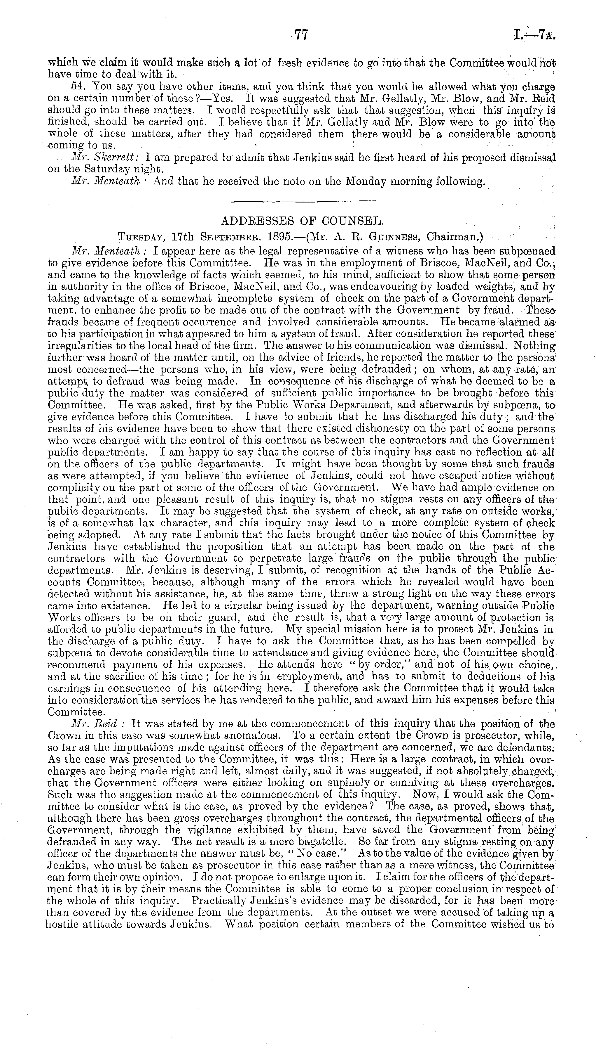 ADDBESSES OF COUNSEL. Tuesday, 17th September, 1895.—(Mr. A. B. Guinness, Chairman.) Mr. Menteath : I appear here as the legal representative of a witness who has been subpoenaed to give evidence before this Committtee. He was in the employment of Briscoe, MacNeil, and Co., and came to the knowledge of facts which seemed, to his mind, sufficient to show that some person in authority in the office of Briscoe, MacNeil, and Co., was endeavouring by loaded weights, and by taking advantage of a somewhat incomplete system of check on the part of a Government department, to enhance the profit to be made out of the contract with the Government by fraud. These frauds became of frequent occurrence and involved considerable amounts. He became alarmed as to his participation in what appeared to him a system of fraud. After consideration he reported these irregularities to the local head of the firm. The answer to his communication was dismissal. Nothing further was heard of the matter until, on the advice of friends, he reported the matter to the persons most concerned—the persons who, in his view, were being defrauded; on whom, at any rate, an attempt, to defraud was being made. In consequence of his discharge of what he deemed to be a public duty the matter was considered of sufficient public importance to be brought before this Committee. He was asked, first by the Public Works Department, and afterwards by subpoena, to give evidence before this Committee. I have to submit that he has discharged his duty ; and the results of his evidence have been to show that there existed dishonesty on the part of some persons who were charged with the control of this contract as between the contractors and the Government public departments. lam happy to say that the course of this inquiry has cast no reflection at all on the officers of the public departments. It might have been thought by some that such frauds as were attempted, if you believe the evidence of Jenkins, could not have escaped notice without complicity on the part of some of the officers of the Government. We have had ample evidence on that point, and one pleasant result of this inquiry is, that no stigma rests on any officers of the public departments. It may be suggested that the system of check, at any rate on outside works, is of a somewhat lax character, and this inquiry may lead to a more complete system of check being adopted. At any rate I submit that the facts brought under the notice of this Committee by Jenkins have established the proposition that an attempt has been made on the part of the contractors with the Government to perpetrate large frauds on the public through the public departments. Mr. Jenkins is deserving, I submit, of recognition at the hands of the Public Accounts Committee-, because, although many of the errors which he revealed would have been detected without his assistance, he, at the same time, threw a strong light on the way these errors came into existence. He led to a circular being issued by the department, warning outside Public Works officers to be on their guard, and the result is, that a very large amount of protection is afforded to public departments in the future. My special mission here is to protect Mr. Jenkins in the discharge of a public duty. I have to ask the Committee that, as he has been compelled by subpoena to devote considerable time to attendance and giving evidence here, the Committee should recommend payment of his expenses. He attends here "by order," and not of his own choice, and at the sacrifice of his time ; for he is in employment, and has to submit to deductions of his earnings in consequence of his attending here. I therefore ask the Committee that it would take into consideration the services he has rendered to the public, and award him his expenses before this Committee. Mr. Reid : It was stated by me at the commencement of this inquiry that the position of the Crown in this case was somewhat anomalous. To a certain extent the Crown is prosecutor, while, so far as the imputations made against officers of the department are concerned, we are defendants. As the case was presented to the Committee, it was this : Here is a large contract, in which overcharges are being made right and left, almost daily, and it was suggested, if not absolutely charged, that the Government officers were either looking on supinely or conniving at these overcharges. Such was the suggestion made at the commencement of this inquiry. Now, I would ask the Committee to consider what is the case, as proved by the evidence ? The case, as proved, shows that, although there has been gross overcharges throughout the contract, the departmental officers of the Government, through the vigilance exhibited by them, have saved the Government from being defrauded in any way. The net result is a mere bagatelle. So far from any stigma resting on any officer of the departments the answer must be, "No case." As to the value of the evidence given by Jenkins, who must be taken as prosecutor in this case rather than as a mere witness, the Committee can form their own opinion. Ido not propose to enlarge upon it. I claim for the officers of the department that it is by their means the Committee is able to come to a proper conclusion in respect of the whole of this inquiry. Practically Jenkins's evidence may be discarded, for it has been more than covered by the evidence from the departments. At the outset we were accused of taking up a hostile attitude towards Jenkins. What position certain members of the Committee wished us to