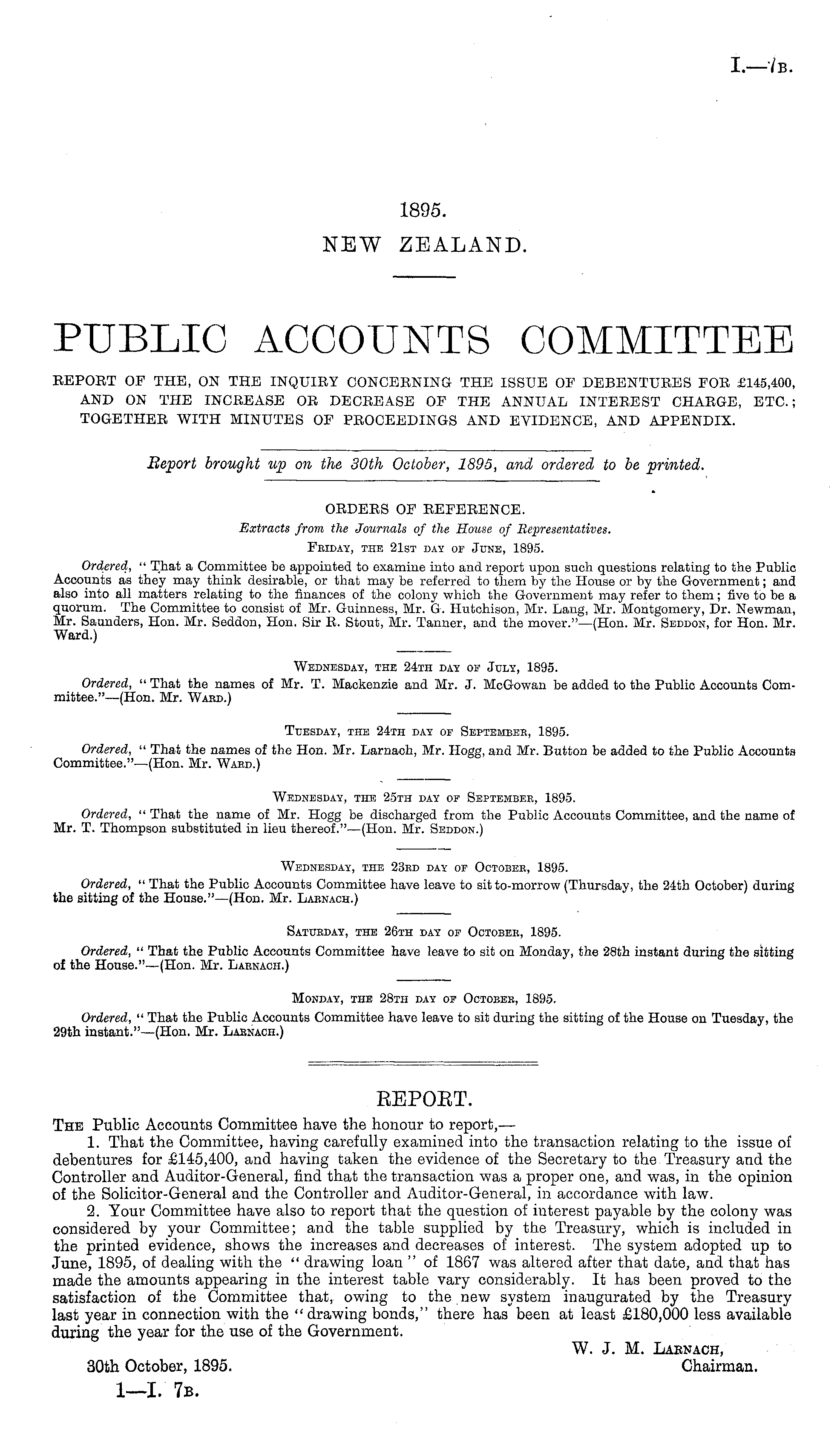 ORDERS OF REFERENCE. Extracts from the Journals of the House of Representatives. Friday, the 21st day of June, 1895. Ordered, " That a Committee be appointed to examine into and report upon such questions relating to the Public Accounts as they may think desirable, or that may be referred to them by the House or by the Government; and also into all matters relating to the finances of the colony which the Government may refer to them; five to be a quorum. The Committee to consist of Mr. Guinness, Mr. G. Hutchison, Mr. Lang, Mr. Montgomery, Dr. Newman, Mr. Saunders, Hon. Mr. Seddon, Hon. Sir R. Stout, Mr. Tanner, and the mover."—(Hon. Mr. Seddon, for Hon. Mr. Ward.)