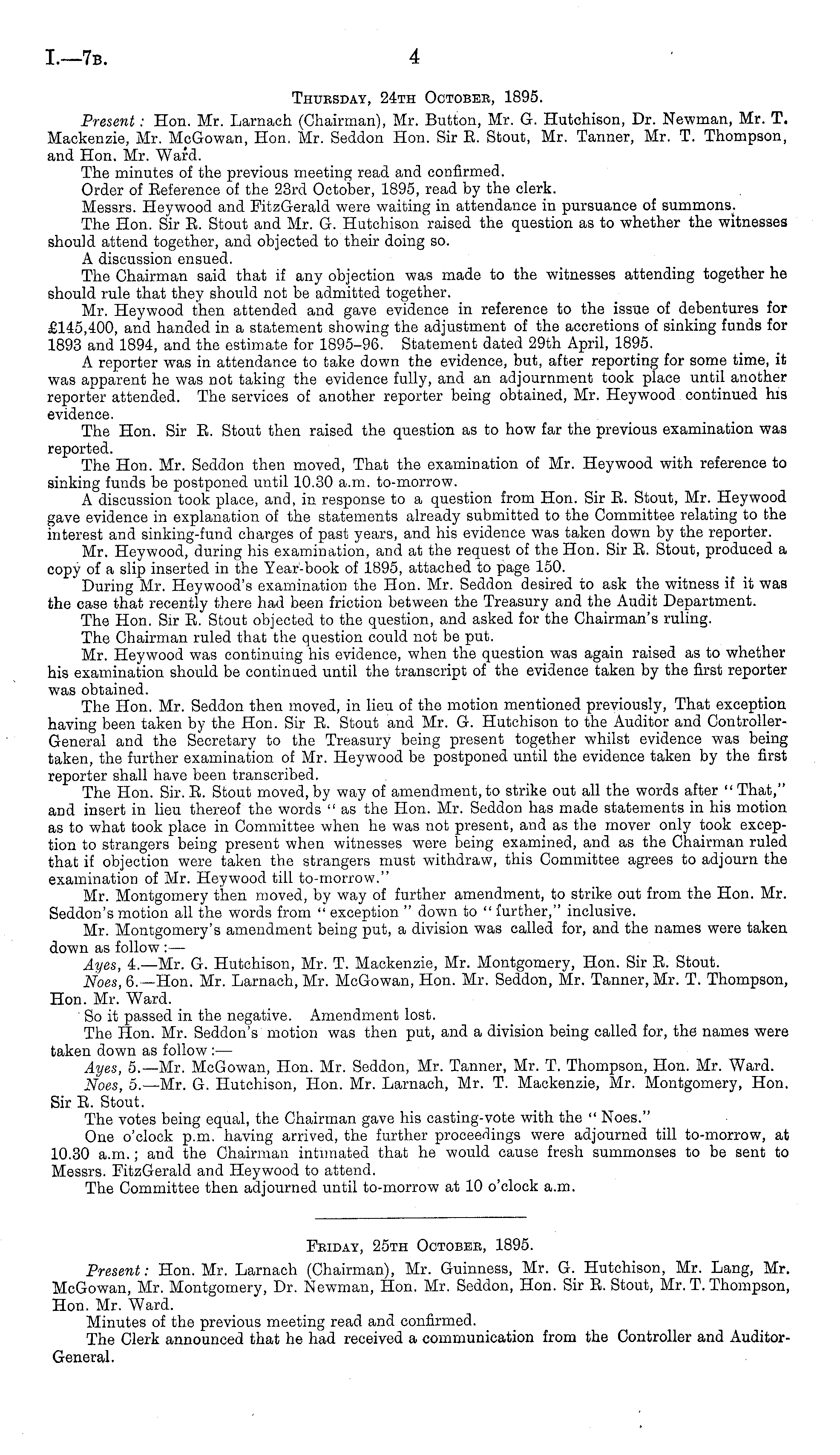Thursday, 24th October, 1895. Present: Hon. Mr. Larnach (Chairman), Mr. Button, Mr. G. Hutchison, Dr. Newman, Mr. T. Mackenzie, Mr. McGowan, Hon. Mr. Seddon Hon. Sir R. Stout, Mr. Tanner, Mr. T. Thompson, and Hon. Mr. Ward. The minutes of the previous meeting read and confirmed. Order of Reference of the 23rd October, 1895, read by the clerk. Messrs. Heywood and FitzGerald were waiting in attendance in pursuance of summons. The Hon. Sir R. Stout and Mr. G. Hutchison raised the question as to whether the witnesses should attend together, and objected to their doing so. A discussion ensued. The Chairman said that if any objection was made to the witnesses attending together he should rule that they should not be admitted together. Mr. Heywood then attended and gave evidence in reference to the issue of debentures for £145,400, and handed in a statement showing the adjustment of the accretions of sinking funds for 1893 and 1894, and the estimate for 1895-96. Statement dated 29th April, 1895. A reporter was in attendance to take down the evidence, but, after reporting for some time, it was apparent he was not taking the evidence fully, and an adjournment took place until another reporter attended. The services of another reporter being obtained, Mr. Heywood continued his evidence. The Hon. Sir R. Stout then raised the question as to how far the previous examination wa3 reported. The Hon. Mr. Seddon then moved, That the examination of Mr. Heywood with reference to sinking funds be postponed until 10.30 a.m. to-morrow. A discussion took place, and, in response to a question from Hon. Sir R. Stout, Mr. Heywood gave evidence in explanation of the statements already submitted to the Committee relating to the interest and sinking-fund charges of past years, and his evidence was taken down by the reporter. Mr. Heywood, during his examination, and at the request of the Hon. Sir R. Stout, produced a copy of a slip inserted in the Year-book of 1895, attached to page 150. During Mr. Heywood's examination the Hon. Mr. Seddon desired to ask the witness if it was the case that recently there had been friction between the Treasury and the Audit Department. The Hon. Sir R. Stout objected to the question, and asked for the Chairman's ruling. The Chairman ruled that the question could not be put. Mr. Heywood was continuing his evidence, when the question was again raised as to whether his examination should be continued until the transcript of the evidence taken by the first reporter was obtained. The Hon. Mr. Seddon then moved, in lieu of the motion mentioned previously, That exception having been taken by the Hon. Sir R. Stout and Mr. G. Hutchison to the Auditor and ControllerGeneral and the Secretary to the Treasury being present together whilst evidence was being taken, the further examination of Mr. Heywood be postponed until the evidence taken by the first reporter shall have been transcribed. The Hon. Sir. R. Stout moved, by way of amendment, to strike out all the words after " That," and insert in lieu thereof the words " as the Hon. Mr. Seddon has made statements in his motion as to what took place in Committee when he was not present, and as the mover only took exception to strangers being present when witnesses were being examined, and as the Chairman ruled that if objection were taken the strangers must withdraw, this Committee agrees to adjourn the examination of Mr. Heywood till to-morrow." Mr. Montgomery then moved, by way of further amendment, to strike out from the Hon. Mr. Seddon's motion all the words from " exception " down to " further," inclusive. Mr. Montgomery's amendment being put, a division was called for, and the names were taken down as follow :— Ayes, 4.—Mr. G. Hutchison, Mr. T. Mackenzie, Mr. Montgomery, Hon. Sir R. Stout. Noes, 6. — Hon. Mr. Larnach, Mr. McGowan, Hon. Mr. Seddon, Mr. Tanner, Mr. T. Thompson, Hon. Mr. Ward. So it passed in the negative. Amendment lost. The Hon. Mr. Seddon's motion was then put, and a division being called for, the names were taken down as follow :— Ayes, s.—Mr. McGowan, Hon. Mr. Seddon, Mr. Tanner, Mr. T. Thompson, Hon. Mr. Ward. Noes, s.—Mr. G. Hutchison, Hon. Mr. Larnach, Mr. T. Mackenzie, Mr. Montgomery, Hon. Sir R. Stout. The votes being equal, the Chairman gave his casting-vote with the " Noes." One o'clock p.m. having arrived, the further proceedings were adjourned till to-morrow, at 10.30 a.m.; and the Chairman intimated that he would cause fresh summonses to be sent to Messrs. FitzGerald and Heywood to attend. The Committee then adjourned until to-morrow at 10 o'clock a.m.