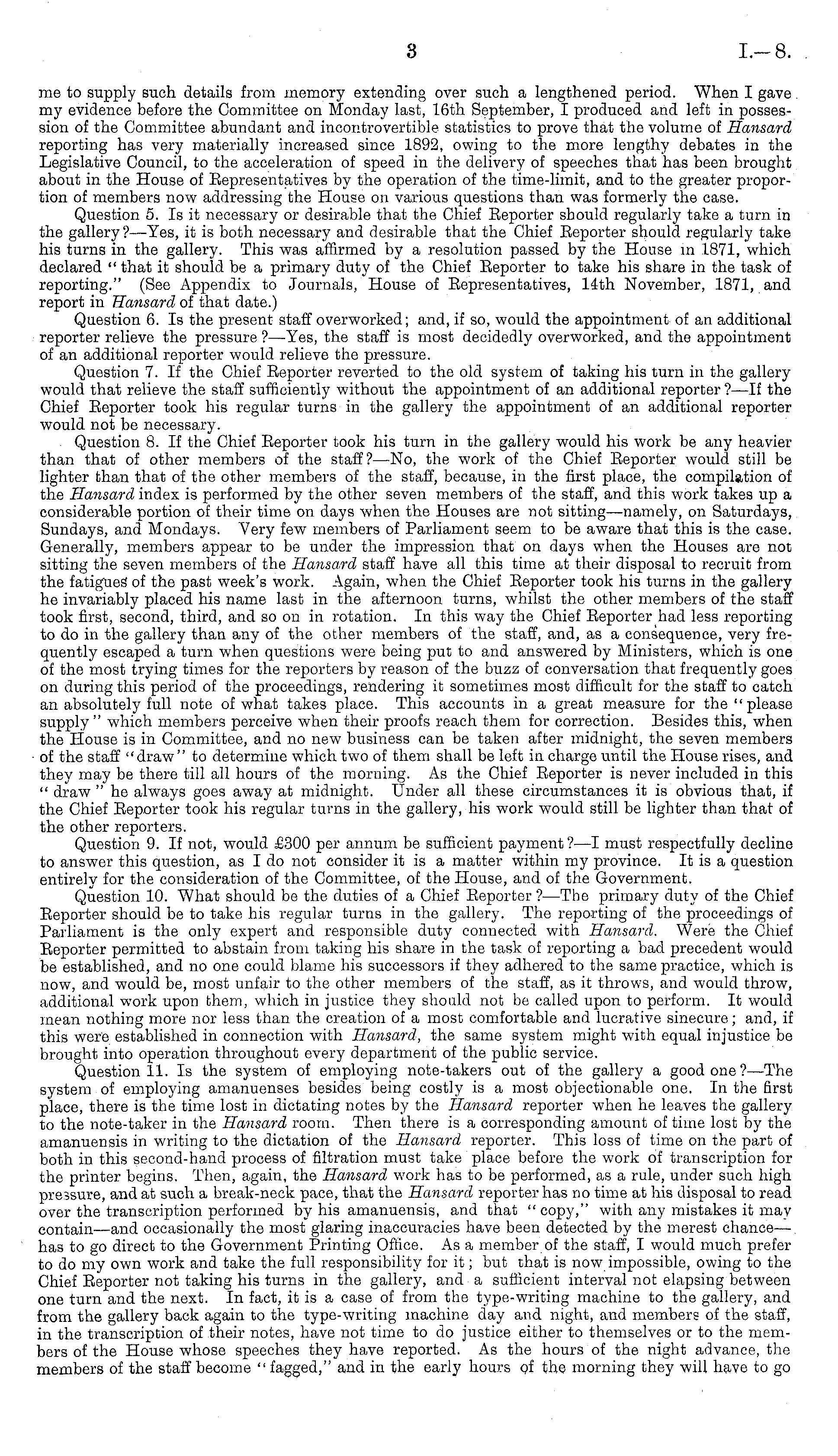 me to supply such details from memory extending over such a lengthened period. When I gave my evidence before the Committee on Monday last, 16th September, I produced and left in possession of the Committee abundant and incontrovertible statistics to prove that the volume of Hansard reporting has very materially increased since 1892, owing to the more lengthy debates in the Legislative Council, to the acceleration of speed in the delivery of speeches that has been brought about in the House of Eepresentatives by the operation of the time-limit, and to the greater proportion of members now addressing the House on various questions than was formerly the case. Question 5. Is it necessary or desirable that the Chief Reporter should regularly take a turn in the gallery?— Yes, it is both necessary and desirable that the Chief Reporter should regularly take his turns in the gallery. This was affirmed by a resolution passed by the House in 1871, which declared "that it should be a primary duty of the Chief Reporter to take his share in the task of reporting." (See Appendix to Journals, House of Representatives, 14th November, 1871, and report in Hansard of that date.) Question 6. Is the present staff overworked; and, if so, would the appointment of an additional reporter relieve the pressure ? —Yes, the staff is most decidedly overworked, and the appointment of an additional reporter would relieve the pressure. Question 7. If the Chief Reporter reverted to the old system of taking his turn in the gallery would that relieve the staff sufficiently without the appointment of an additional reporter ? —lf the Chief Reporter took his regular turns in the gallery the appointment of an additional reporter would not be necessary. Question 8. If the Chief Reporter took his turn in the gallery would his work be any heavier than that of other members of the staff?—No, the work of the Chief Reporter would still be lighter than that of the other members of the staff, because, in the first place, the compilation of the Hansard index is performed by the other seven members of the staff, and this work takes up a considerable portion of their time on days when the Houses are not sitting—namely, on Saturdays, Sundays, and Mondays. Very few members of Parliament seem to be aware that this is the case. Generally, members appear to be under the impression that on days when the Houses are not sitting the seven members of the Hansard staff have all this time at their disposal to recruit from the fatigues of the past week's work. Again, when the Chief Reporter took his turns in the gallery he invariably placed his name last in the afternoon turns, whilst the other members of the staff took first, second, third, and so on in rotation. In this way the Chief Reporter had less reporting to do in the gallery than any of the other members of the staff, and, as a consequence, very frequently escaped a turn when questions were being put to and answered by Ministers, which is one of the most trying times for the reporters by reason of the buzz of conversation that frequently goes on during this period of the proceedings, rendering it sometimes most difficult for the staff to catch an absolutely full note of what takes place. This accounts in a great measure for the " please supply" which members perceive when their proofs reach them for correction. Besides this, when the House is in Committee, and no new business can be taken after midnight, the seven members of the staff "draw" to determine which two of them shall be left in charge until the House rises, and they may be there till all hours of the morning. As the Chief Beporter is never included in this " draw "he always goes away at midnight. Under all these circumstances it is obvious that, if the Chief Reporter took his regular turns in the gallery, his work would still be lighter than that of the other reporters. Question 9. If not, would £300 per annum be sufficient payment ?—I must respectfully decline to answer this question, as Ido not consider it is a matter within my province. It is a question entirely for the consideration of the Committee, of the House, and of the Government. Question 10. What should be the duties of a Chief Reporter ? —The primary duty of the Chief Reporter should be to take his regular turns in the gallery. The reporting of the proceedings of Parliament is the only expert and responsible duty connected with Hansard. Were the Chief Reporter permitted to abstain from taking his share in the task of reporting a bad precedent would be established, and no one could blame his successors if they adhered to the same practice, which is now, and would be, most unfair to the other members of the staff, as it throws, and would throw, additional work upon them, which in justice they should not be called upon to perform. It would mean nothing more nor less than the creation of a most comfortable and lucrative sinecure; and, if this were established in connection with Hansard, the same system might with equal injustice be brought into operation throughout every department of the public service. Question 11. Is the system of employing note-takers out of the gallery a good one ? —The system of employing amanuenses besides being costly is a most objectionable one. In the first place, there is the time lost in dictating notes by the Hansard reporter when he leaves the gallery to the note-taker in the Hansard room. Then there is a corresponding amount of time lost by the amanuensis in writing to the dictation of the Hansard reporter. This loss of time on the part of both in this second-hand process of filtration must take place before the work of transcription for the printer begins. Then, again, the Hansard work has to be performed, as a rule, under such high pressure, and at such a break-neck pace, that the Hansard reporter has no time at his disposal to read over the transcription performed by his amanuensis, and that "copy," with any mistakes it 