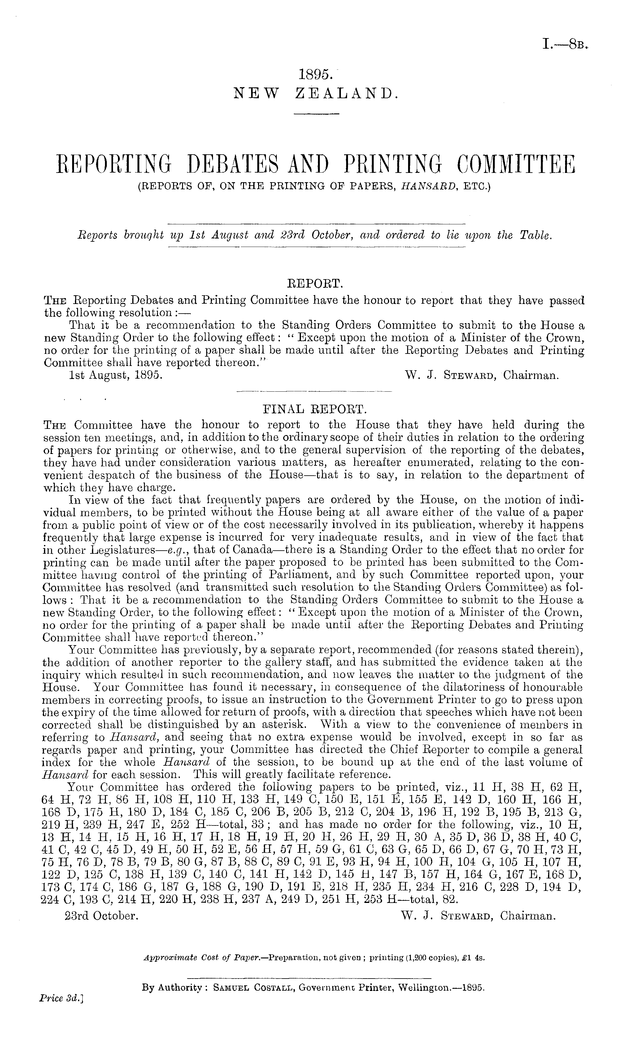 FINAL REPOBT. The Committee have the honour to report to the House that they have held during the session ten meetings, and, in addition to the ordinary scope of their duties in relation to the ordering of papers for printing or otherwise, and to the general supervision of the reporting of the debates, they have had under consideration various matters, as hereafter enumerated, relating to the convenient despatch of the business of the House —that is to say, in relation to the department of which they have charge. In view of the fact that frequently papers are ordered by the House, on the motion of individual members, to be printed without the House being at all aware either of the value of a paper from a public point of view or of the cost necessarily involved in its publication, whereby it happens frequently that large expense is incurred for very inadequate results, and in view of the fact that in other Legislatures — e.g., that of Canada—there is a Standing Order to the effect that no order for printing can be made until after the paper proposed to be printed has been submitted to the Committee having control of the printing of Parliament, and by such Committee reported upon, your Committee has resolved (and transmitted such resolution to the Standing Orders Committee) as follows : That it be a recommendation to the Standing Orders Committee to submit to the House a new Standing Order, to the following effect: " Except upon the motion of a Minister of the Crown, no order for the printing of a paper shall be made until after the Eeporting Debates and Printing Committee shall have reported thereon." Your Committee has previously, by a separate report, recommended (for reasons stated therein),, the addition of another reporter to the gallery staff, and has submitted the evidence taken at the inquiry which resulted in such recommendation, and now leaves the matter to the judgment of the House. Your Committee has found it necessary, in consequence of the dilatoriness of honourable members in correcting proofs, to issue an instruction to the Government Printer to go to press upon the expiry of the time allowed for return of proofs, with a direction that speeches which have not been corrected shall be distinguished by an asterisk. With a view to the convenience of members in referring to Hansard, and seeing that no extra expense would be involved, except in so far as regards paper and printing, your Committee has directed the Chief Reporter to compile a general index for the whole Hansard of the session, to be bound up at the end of the last volume of Hansard for each session. This will greatly facilitate reference. Your Committee has ordered the following papers to be printed, viz., 11 H, 38 H, 62 H, 64 H, 72 H, 86 H, 108 H, 110 H, 133 H, 149 C, 150 E, 151 E, 155 E, 142 D, 160 H, 166 H, 168 D, 175 H, 180 D, 184 C, 185 C, 206 B, 205 B, 212 C, 204 B, 196 H, 192 B, 195 B, 213 G, 219 H, 239 H, 247 E, 252 H—total, 33 ; and has made no order for the following, viz., 10 H, 13 H, 14 H, 15 H, 16 H, 17 H, 18 H, 19 H, 20 H, 26 H, 29 H, 30 A, 35 D, 36 D, 38 H, 40 C, 41 C, 42 C, 45 D, 49 H, 50 H, 52 E, 56 H, 57 H, 59 G, 61 C, 63 G, 65 D, 66 D, 67 G, 70 H, 73 H, 75 H, 76 D, 78 B, 79 B, 80 G, 87 B, 88 C, 89 C, 91 E, 93 H, 94 H, 100 H, 104 G, 105 H, 107 H, 122 D, 125 C, 138 H, 139 C, 140 C, 141 H, 142 D, 145 H, 147 B, 157 H, 164 G, 167 E, 168 D, 173 C, 174 C, 186 G, 187 G, 188 G, 190 D, 191 E, 218 H, 235 H, 234 H, 216 C, 228 D, 194 D, 224 C, 193 C, 214 H, 220 H, 238 H, 237 A, 249 D, 251 H, 253 H—total, 82. 23rd October. W. J. Stewakd, Chairman. Approximate Cost of Paper. —Preparation, not given ; printing (1,200 copies), £1 4s.